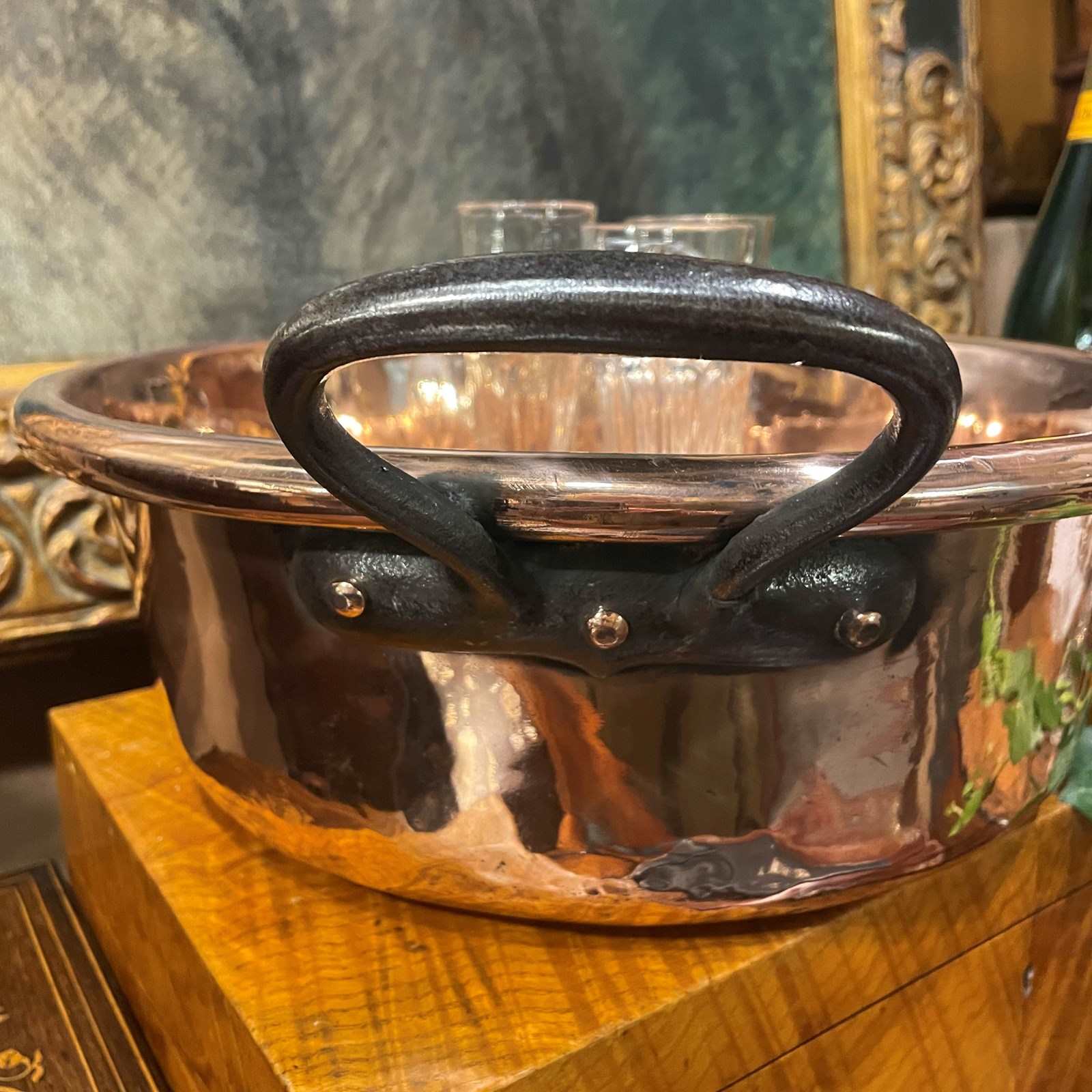 Large copper pan with iron handles, originally used as a cooking pot in the 19th century, now makes a perfect ice bucket for an antique bar or kitchen .