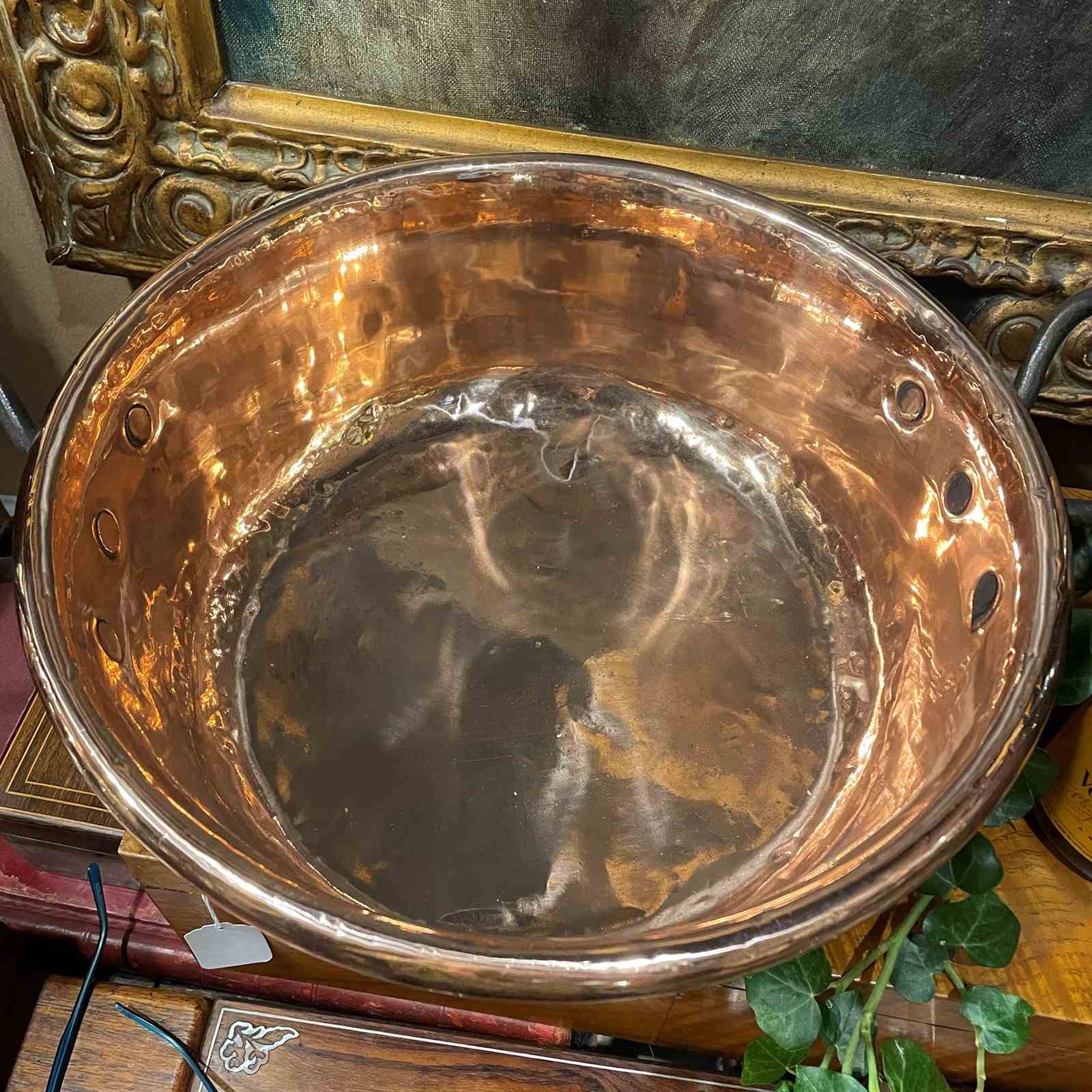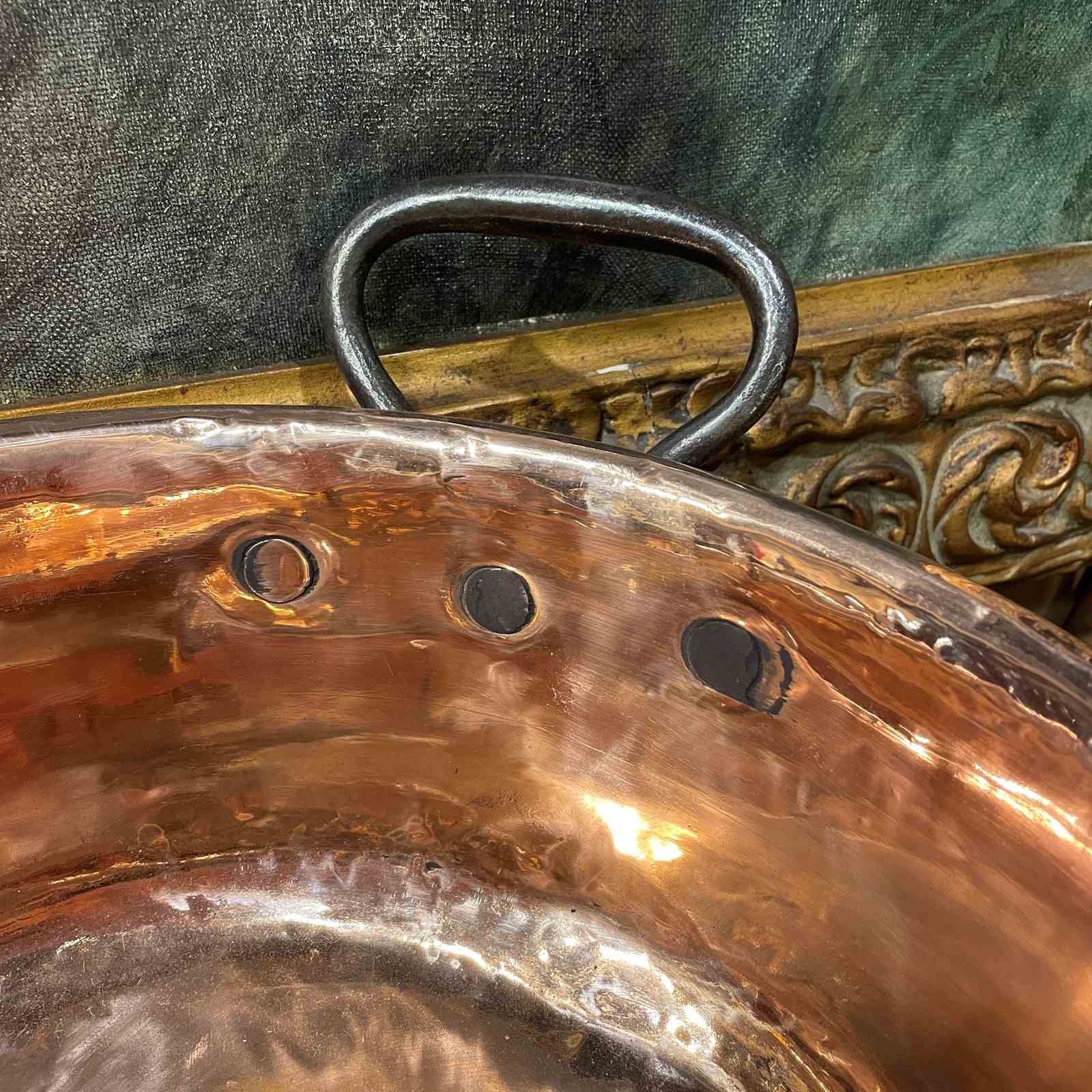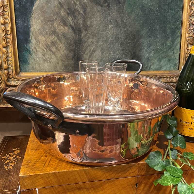 Large copper pan with iron handles, originally used as a cooking pot in the 19th century, now makes a perfect ice bucket for an antique bar or kitchen .