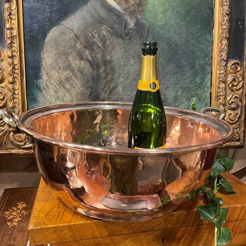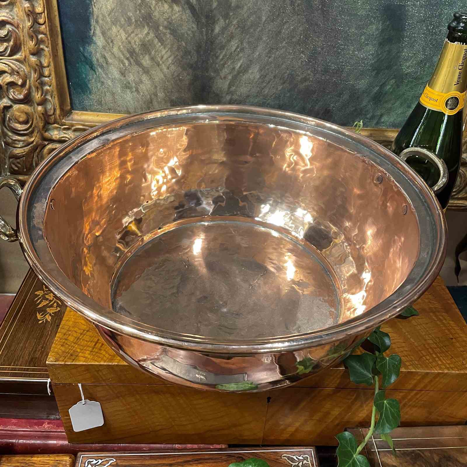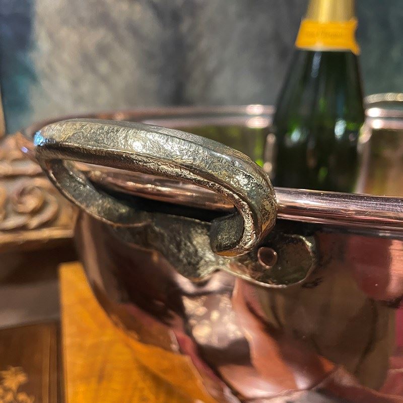 Large copper pan with brass riveted handles, originally used as a cooking pot in the 19th century, now makes a perfect ice bucket for an antique bar or kitchen.