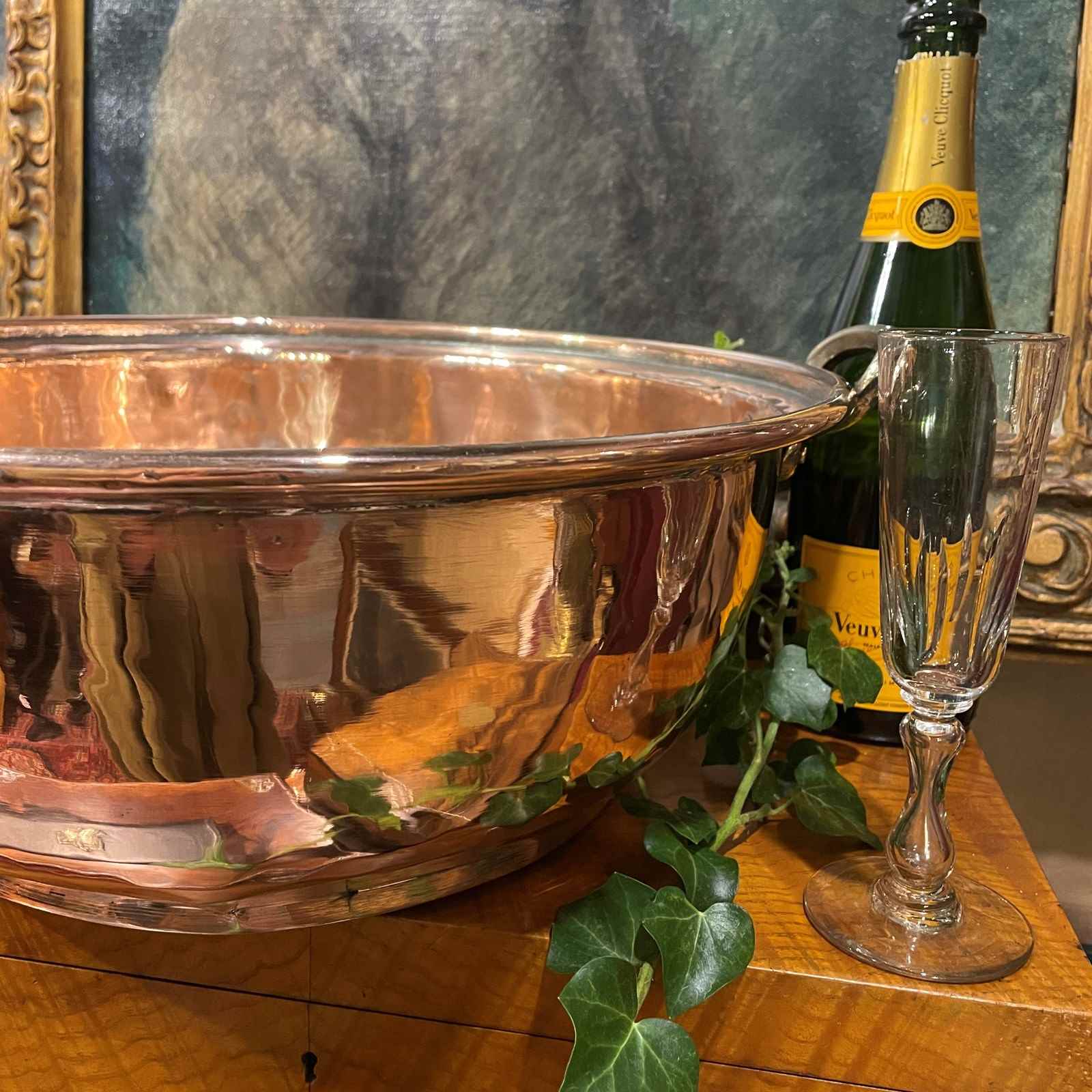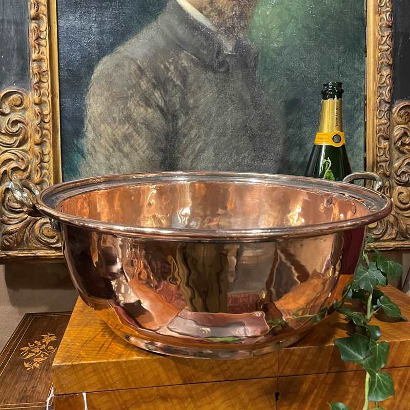 Large copper pan with brass riveted handles, originally used as a cooking pot in the 19th century, now makes a perfect ice bucket for an antique bar or kitchen .