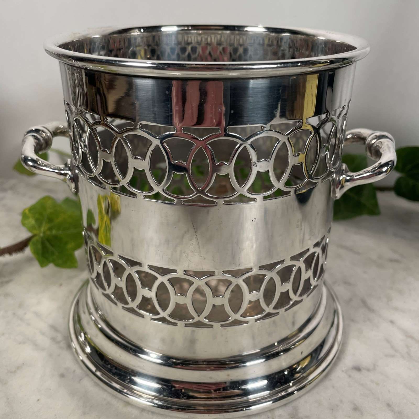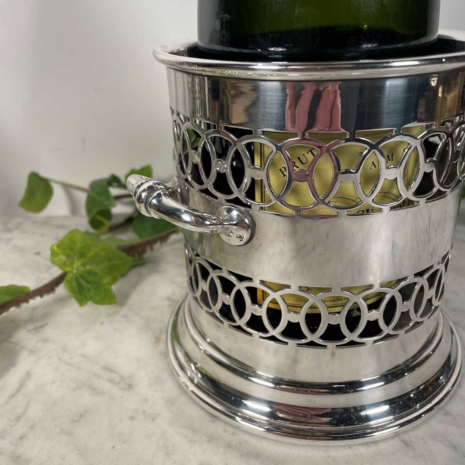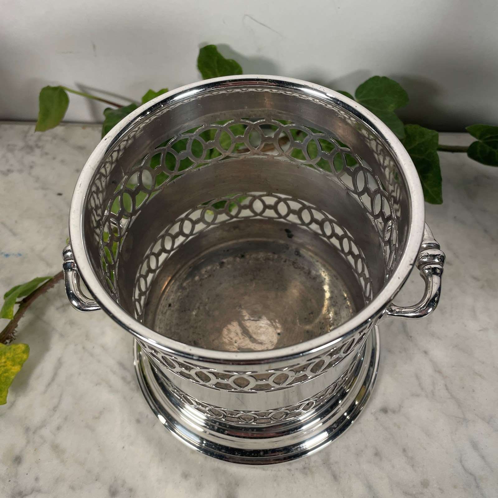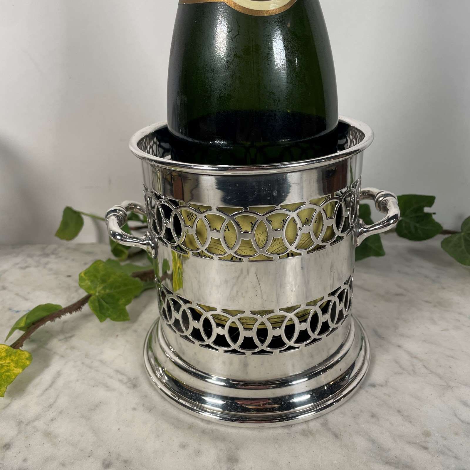 large silver plated bottle holder or coaster, originally used to hold a syphon. The body has an ornate pierced decoration with two handles.