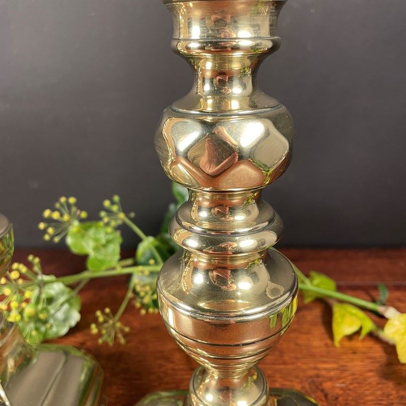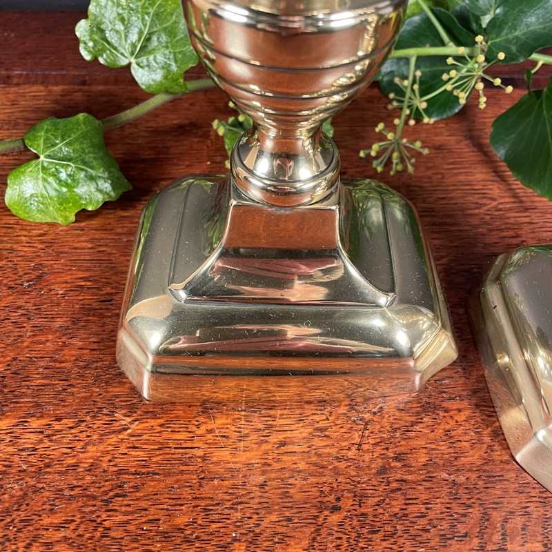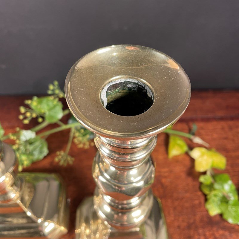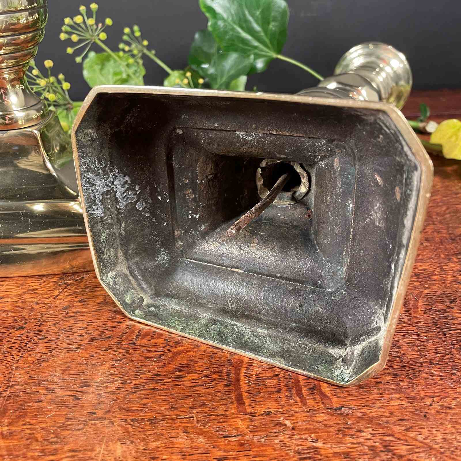 A large pair of Victorian brass candlesticks with rectangular bases.