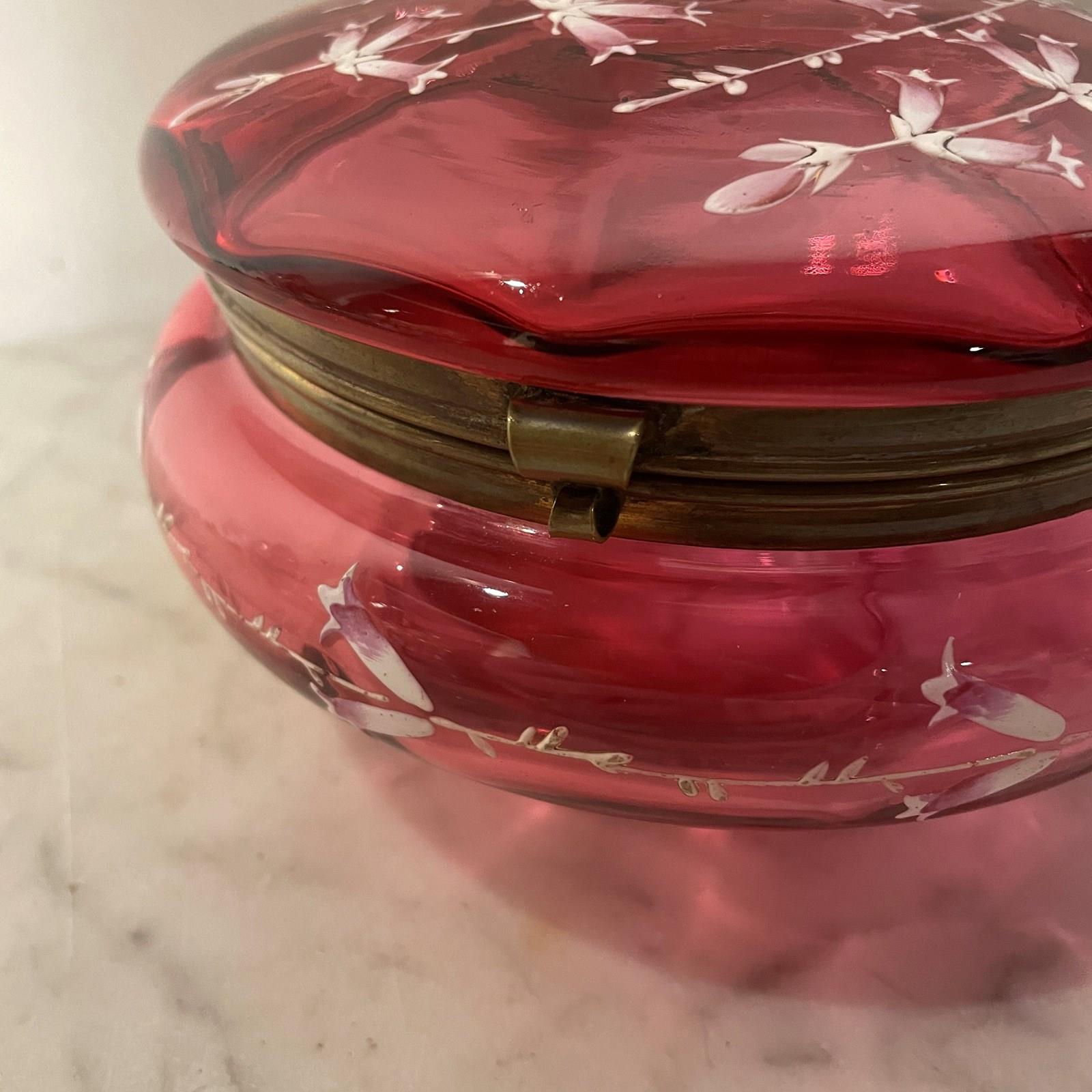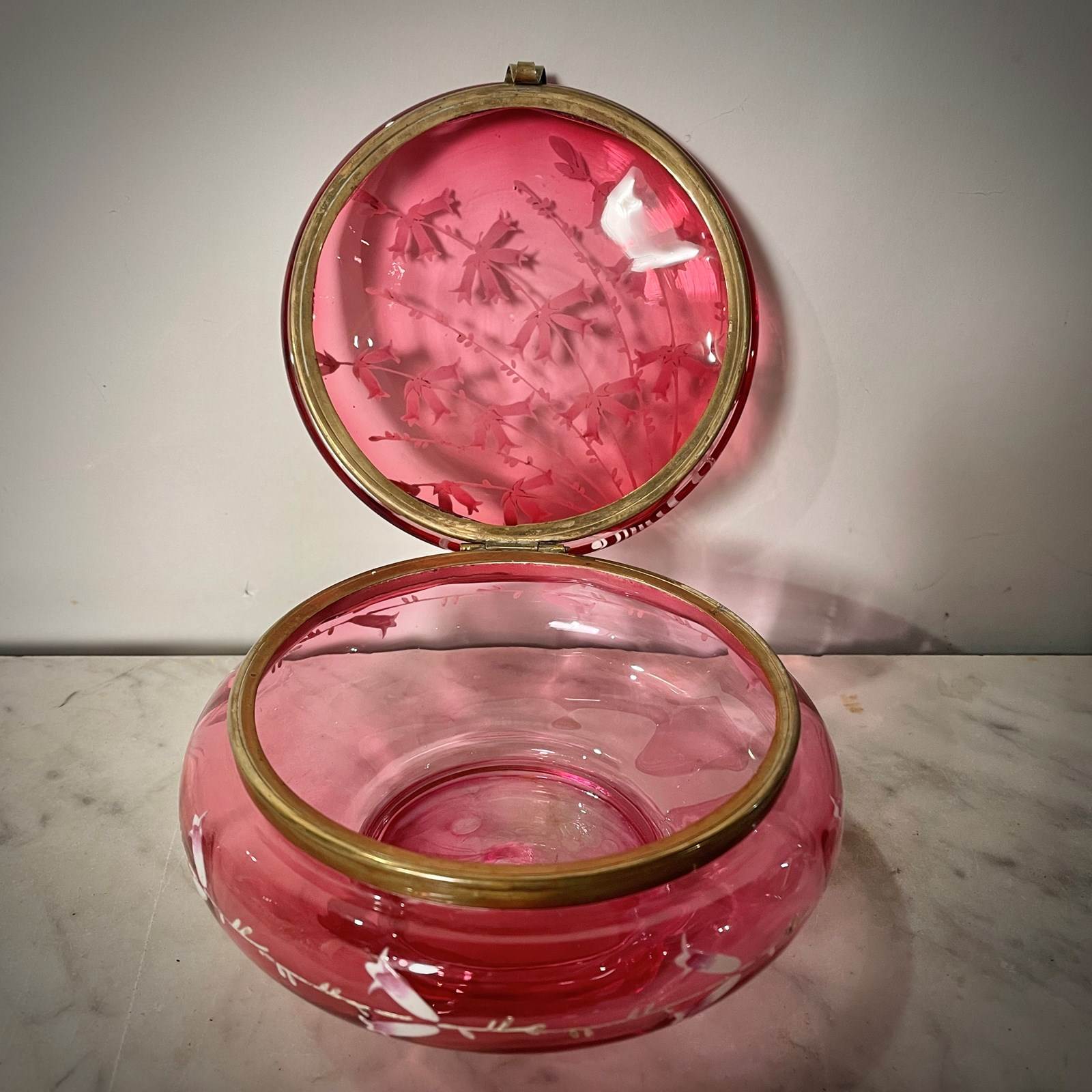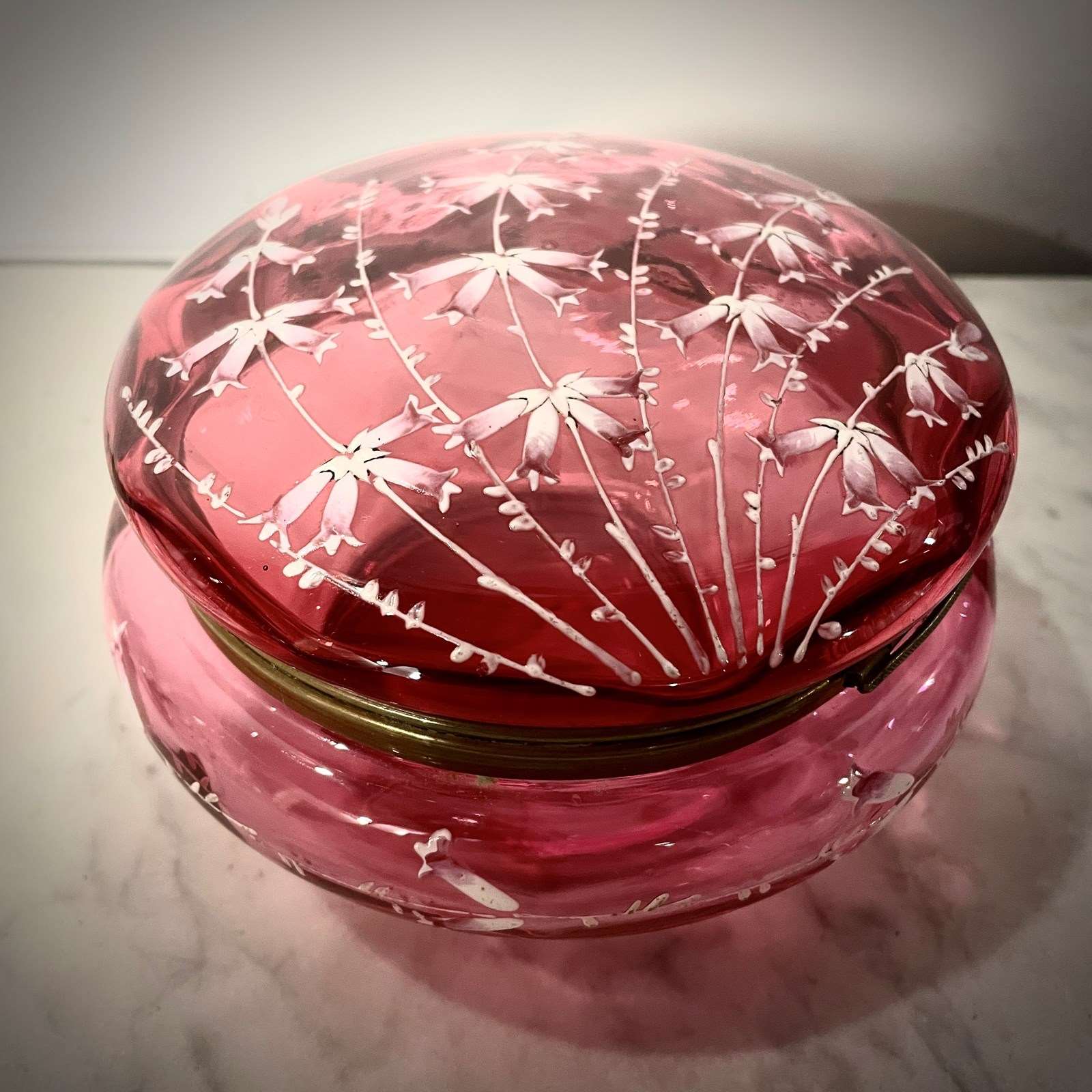 A wonderful large glass casket hand enamelled with a floral design. It has a brass rim around the top and bottom and a brass catch to fasten the lid to the vase.