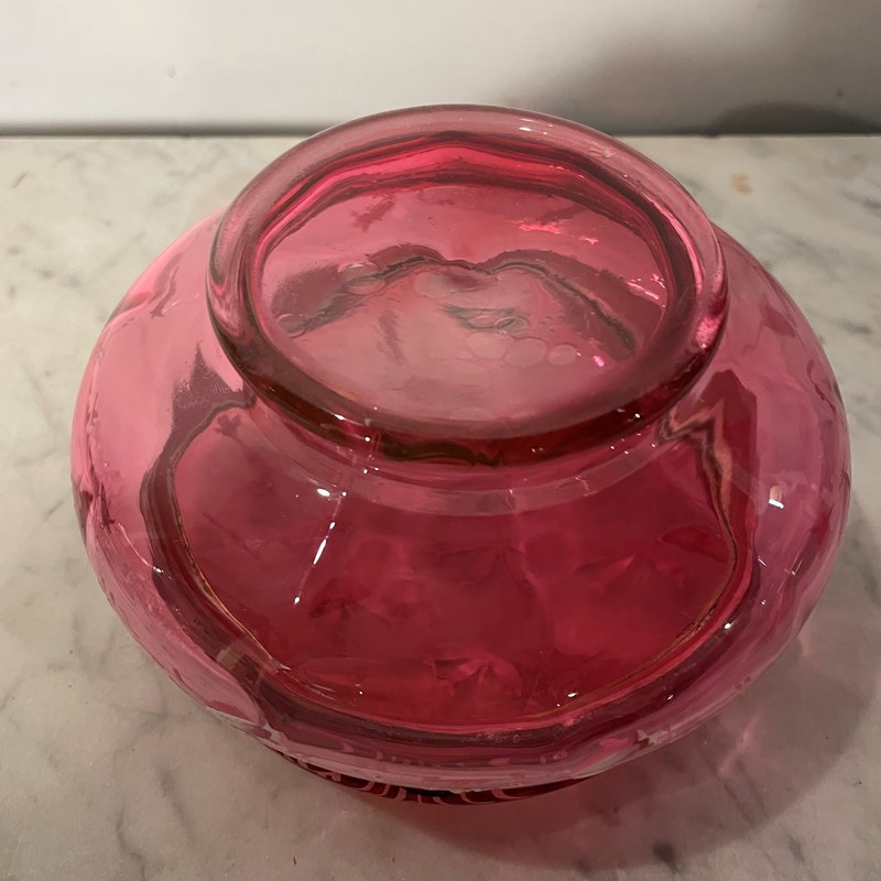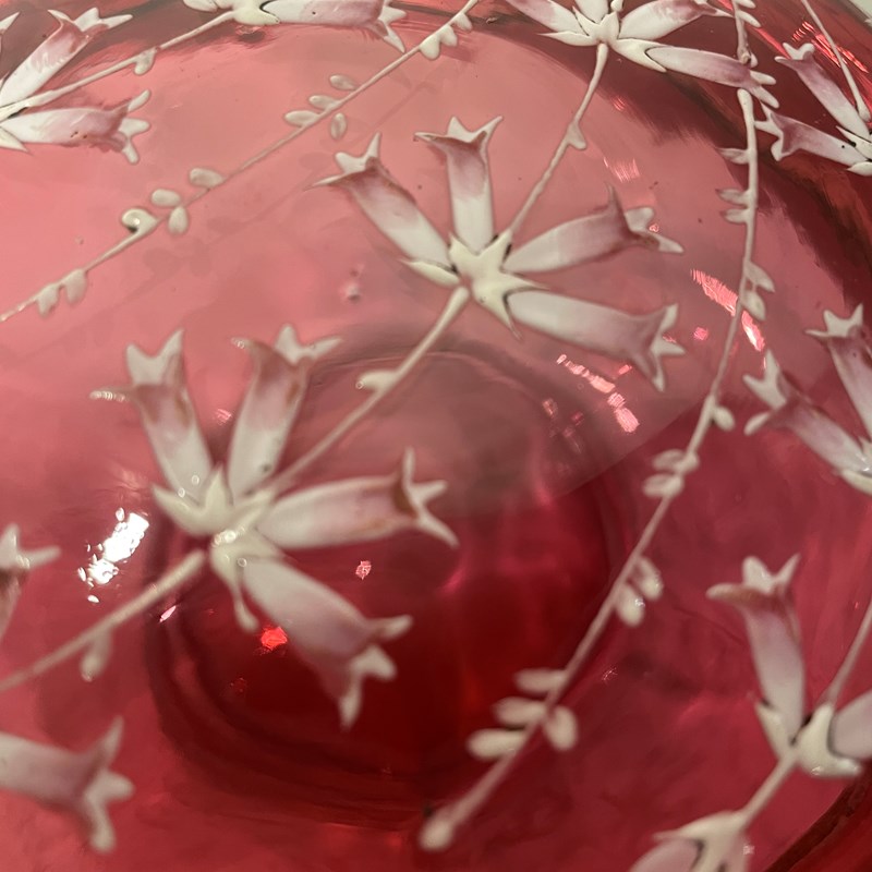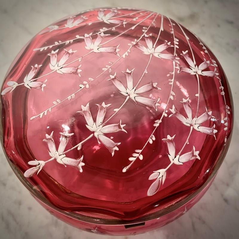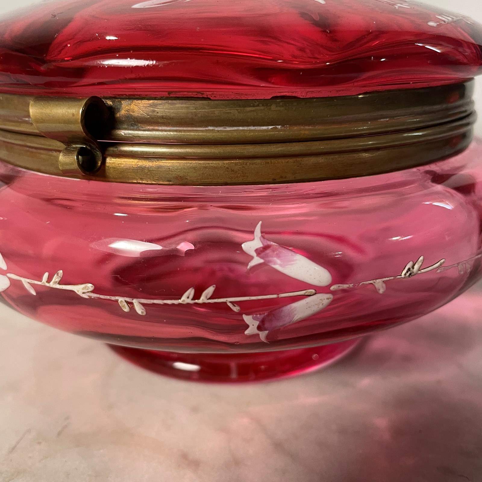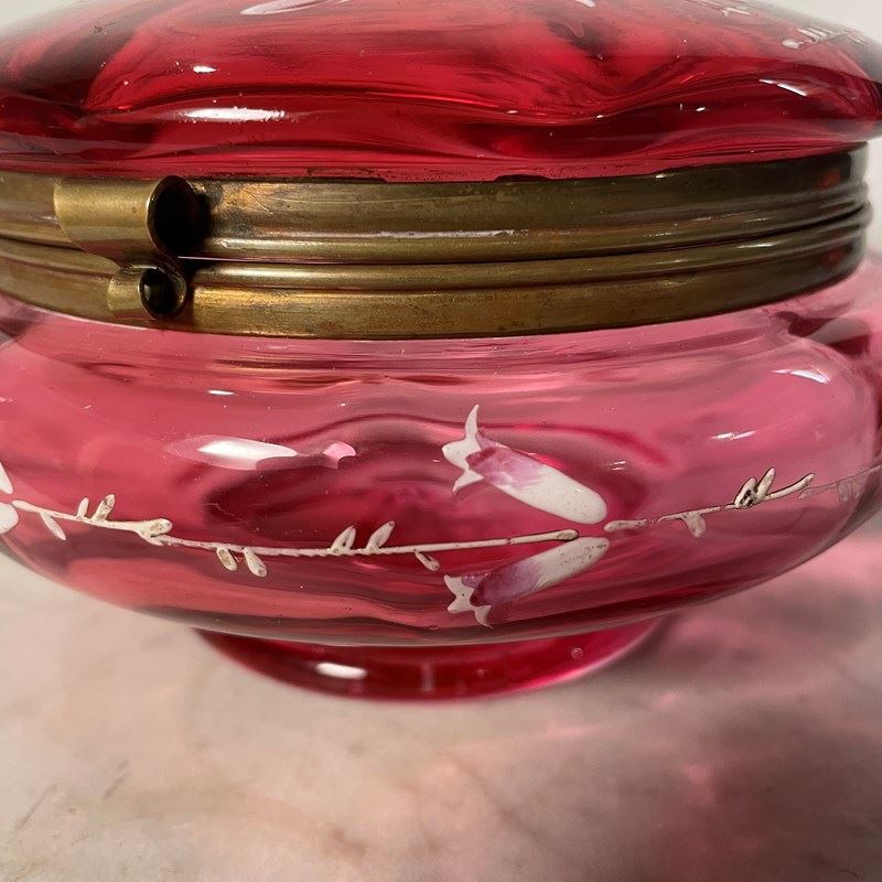 A wonderful large glass casket hand enamelled with a floral design. It has a brass rim around the top and bottom and a brass catch to fasten the lid to the vase.