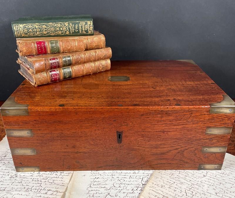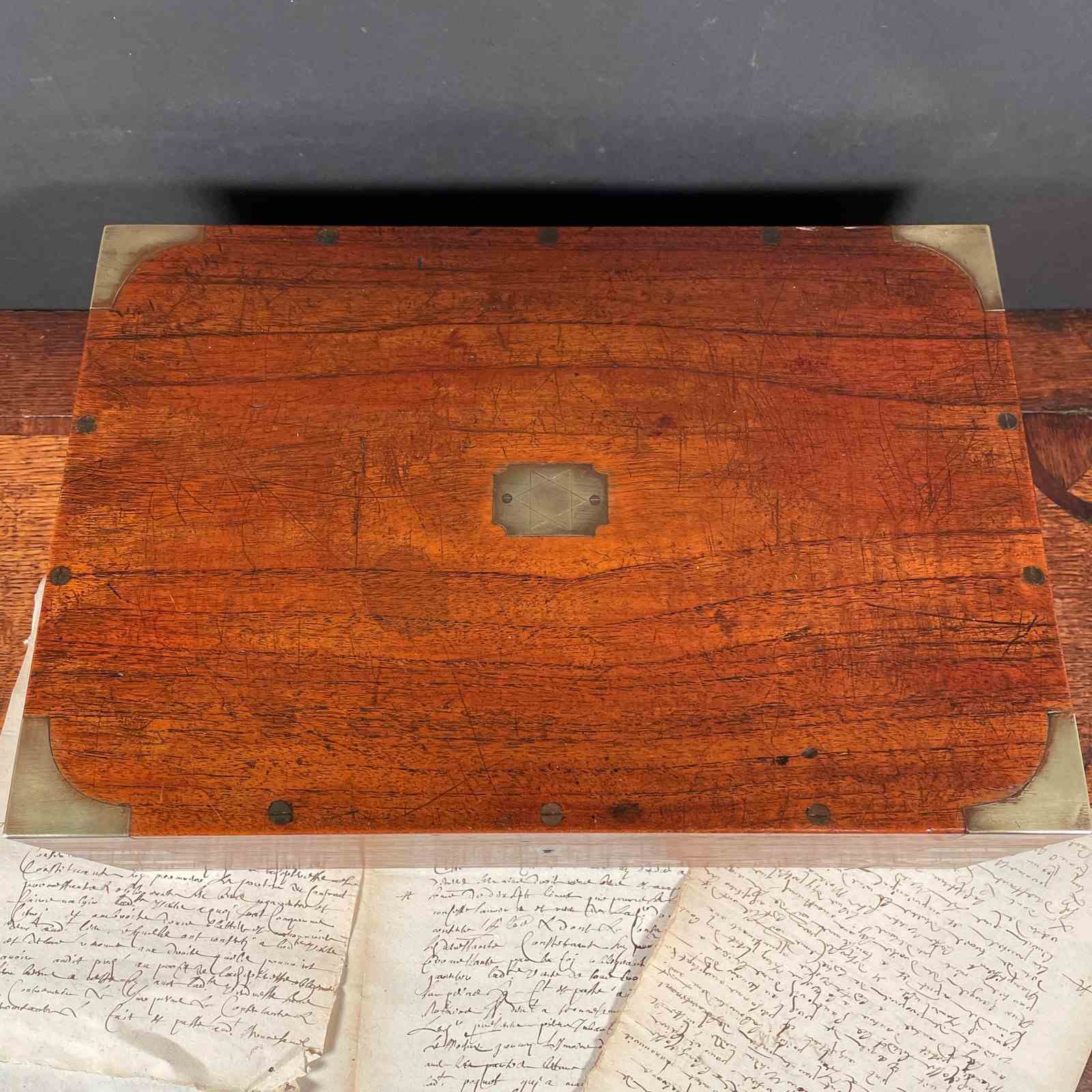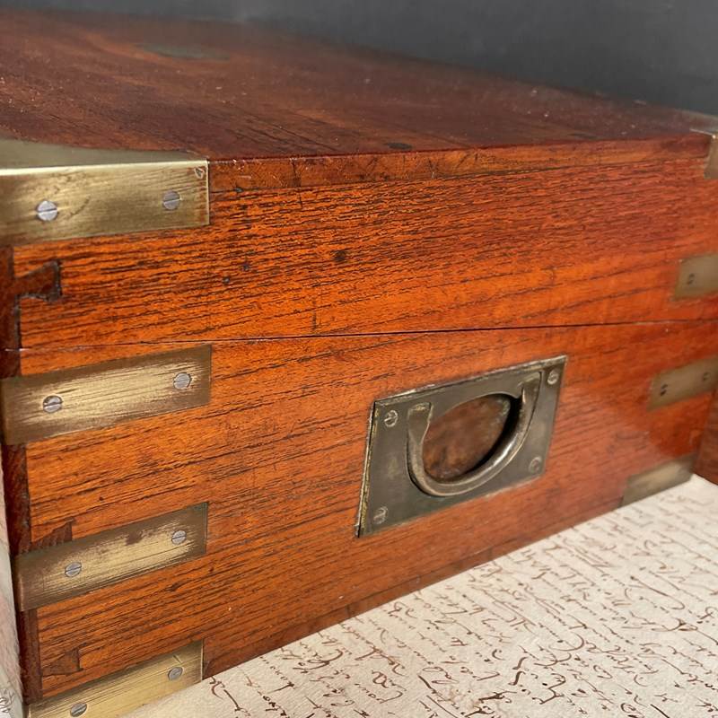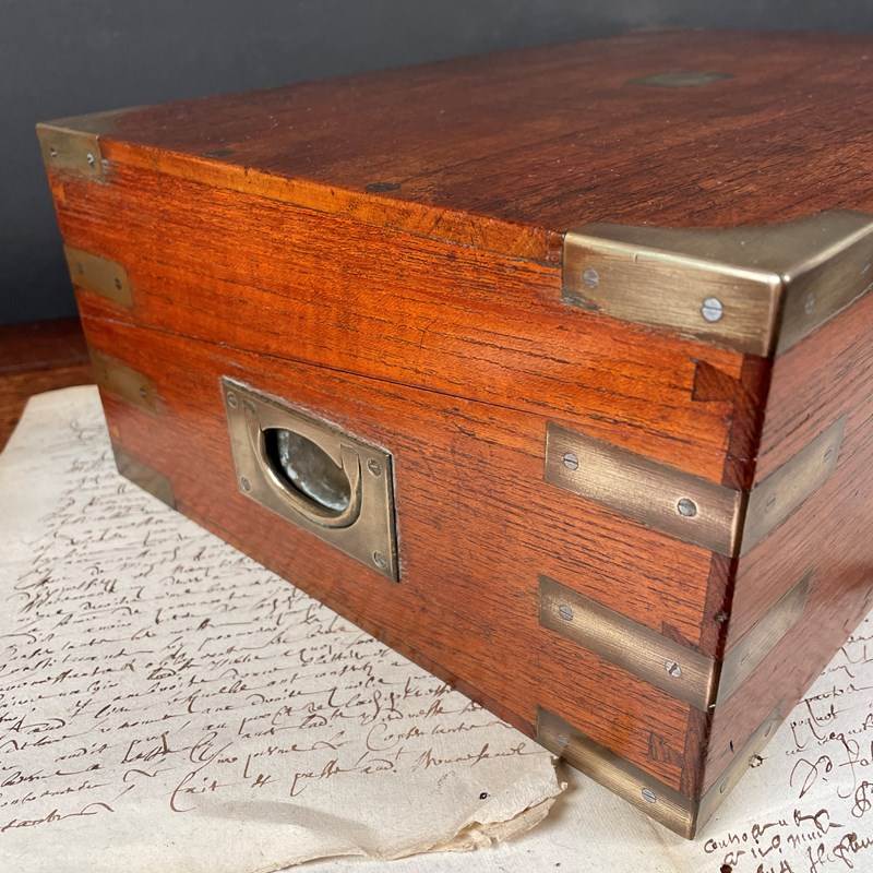 A good size mahogany writing base with brass corners and a brass cartouche to the lid. The side have two inverted brass carrying handles. This style of box was often used by officers as a campaign box. It has an interesting addition to the inside, with a tambour design sliding lid to hold pens and pencils and another sliding lid to cover the glass inkwell.