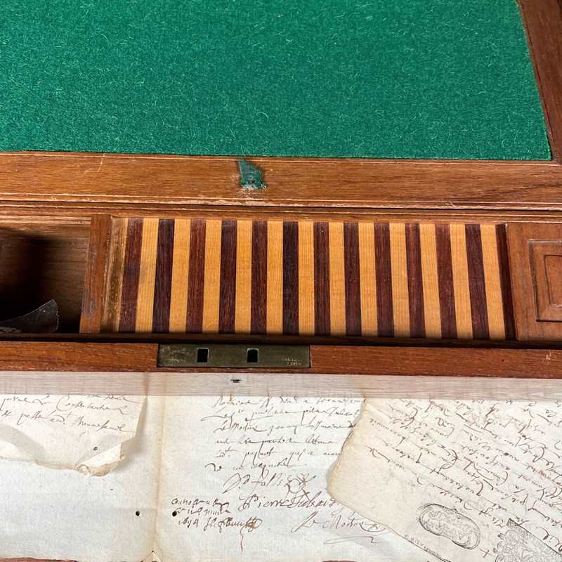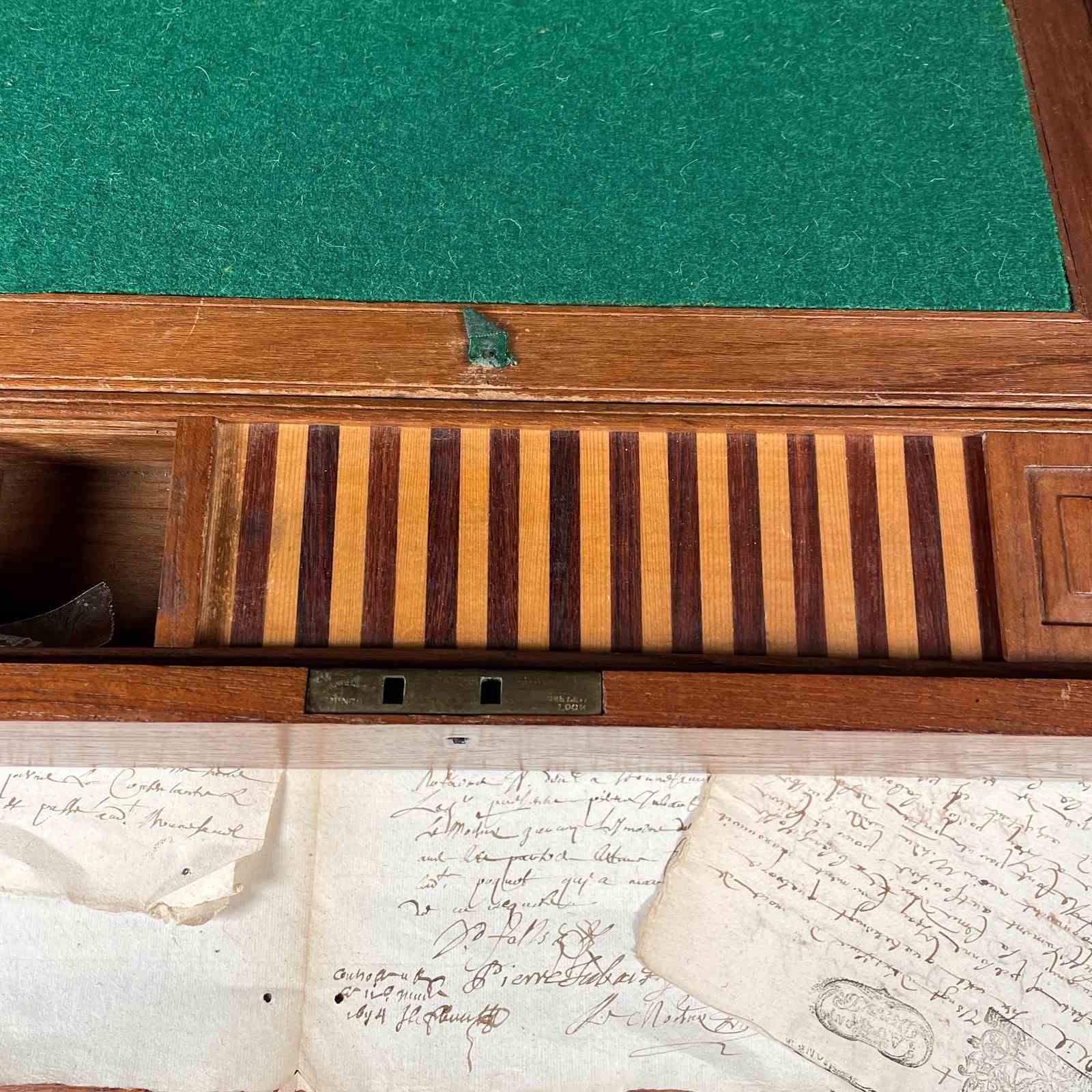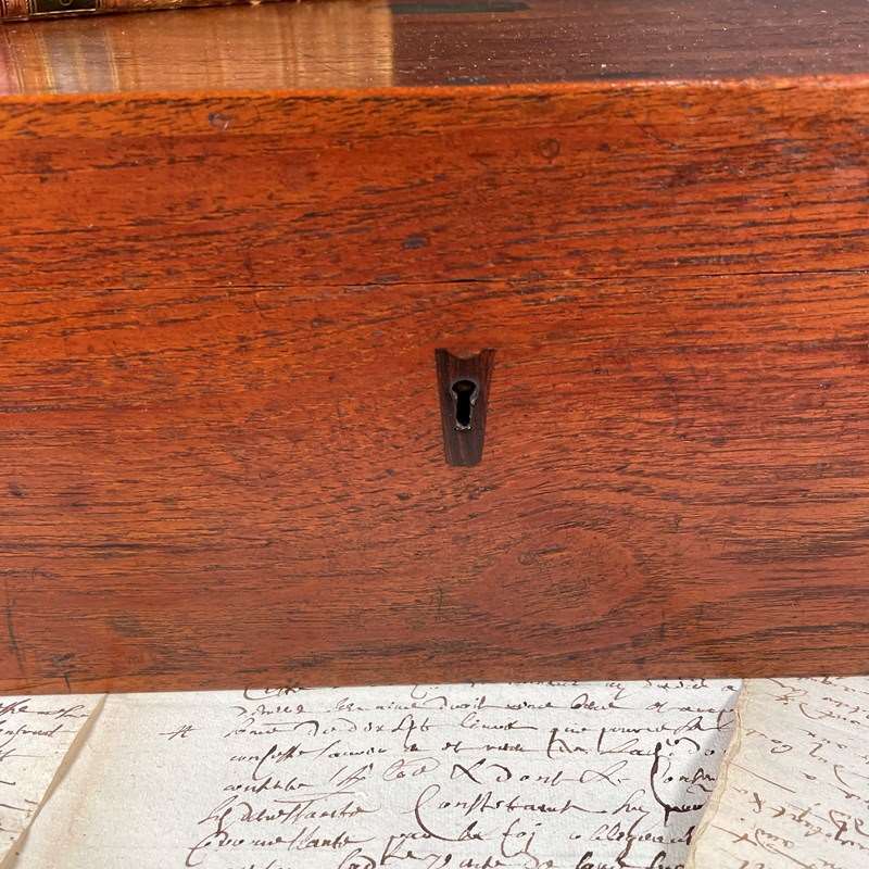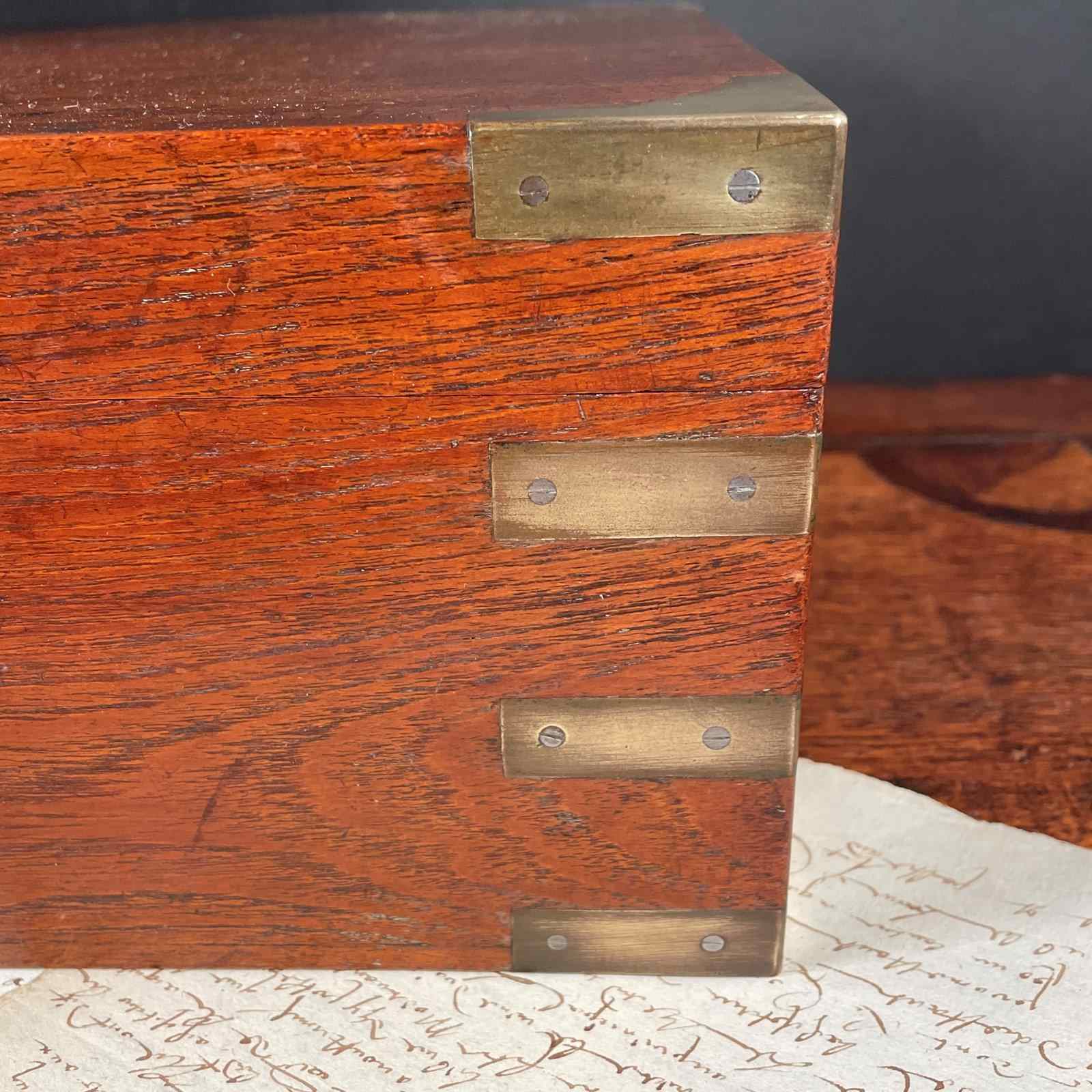 A good size mahogany writing base with brass corners and a brass cartouche to the lid. The side have two inverted brass carrying handles. This style of box was often used by officers as a campaign box. It has an interesting addition to the inside, with a tambour design sliding lid to hold pens and pencils and another sliding lid to cover the glass inkwell.