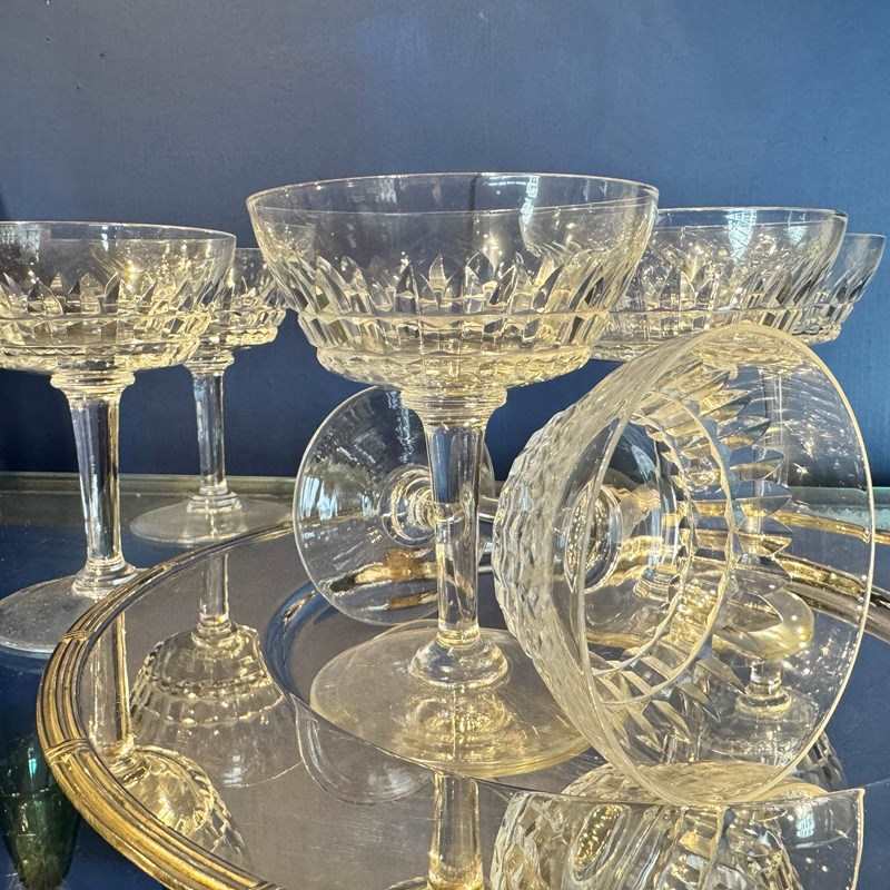 A mid century champagne coupes, with cut decoration to the bowls. There are 9 available.