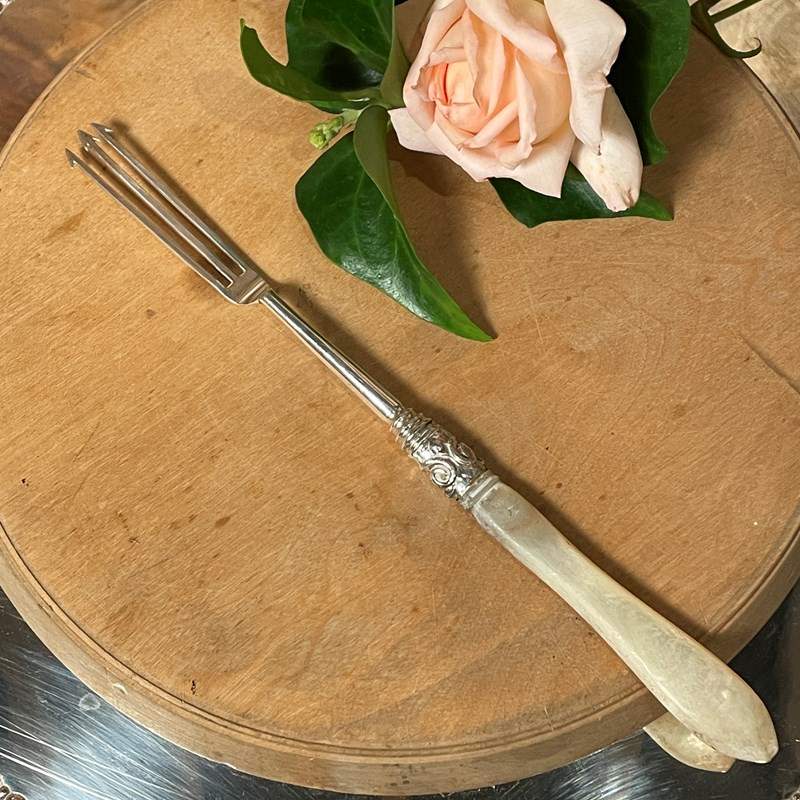 A pretty silver plated serving fork with mother of pearl handle, originally used for pickles and olives