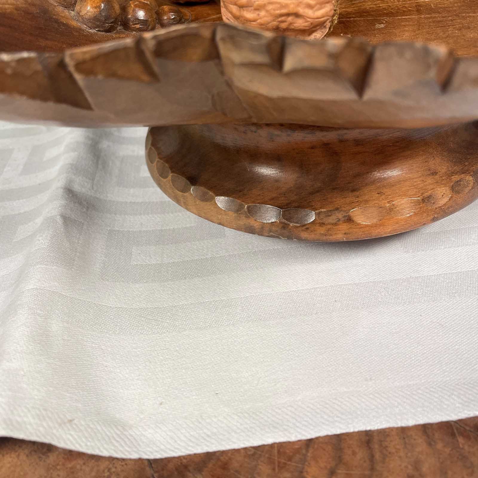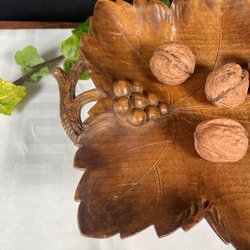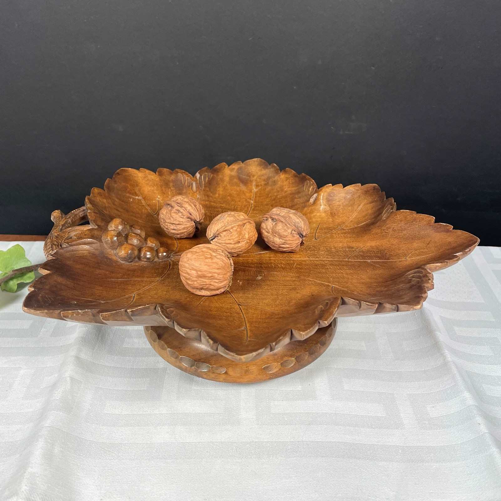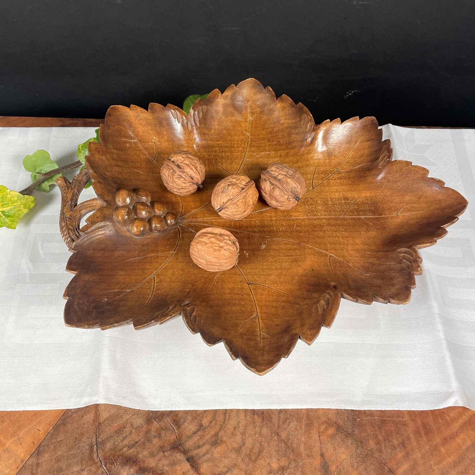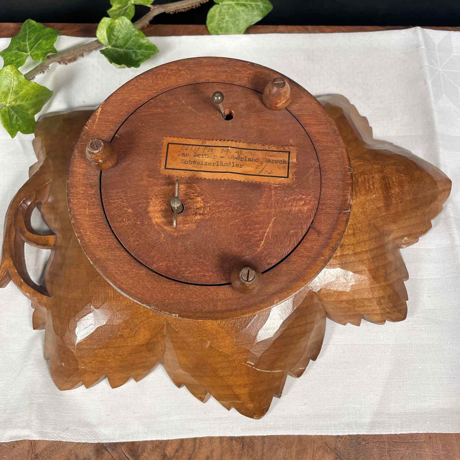 A black Forest musical carved wooden bowl decorated with carved grapes and leaves, possibly for holding grapes or nuts. With a Swiss musical movement.