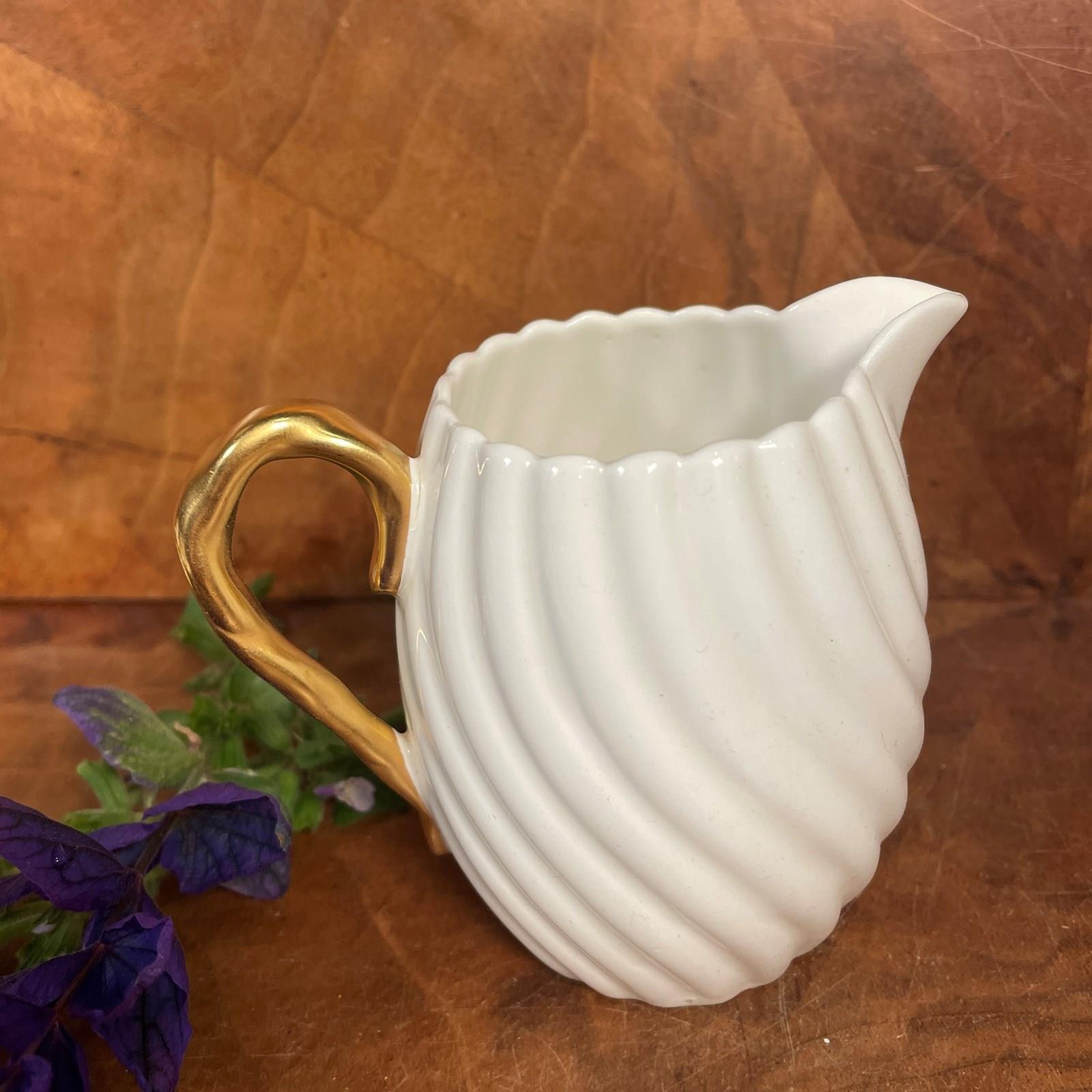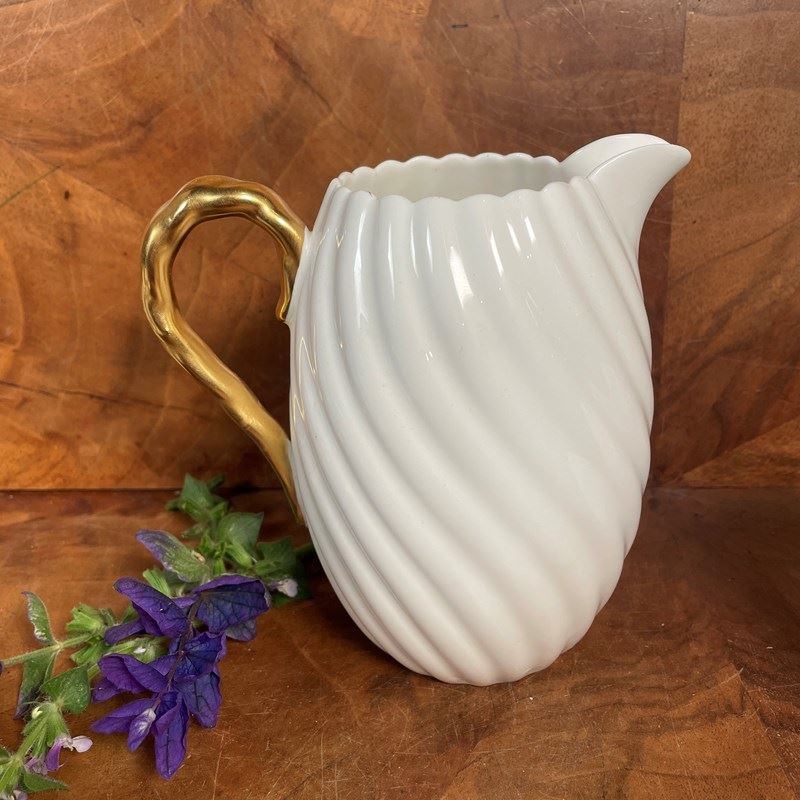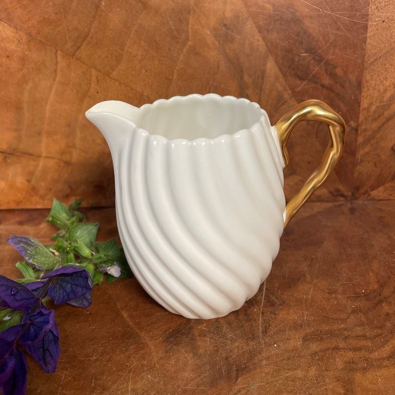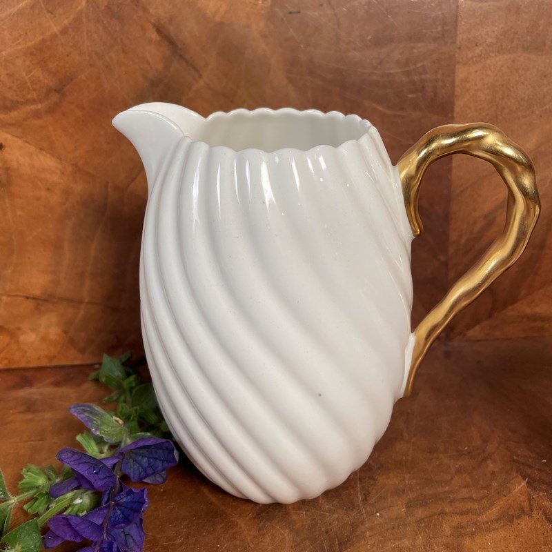 A fine quality pair of jugs, the larger for milk and the smaller for cream, with fluted body and gilded handles made in Staffordshire by Bishop and Stonier around 1900.