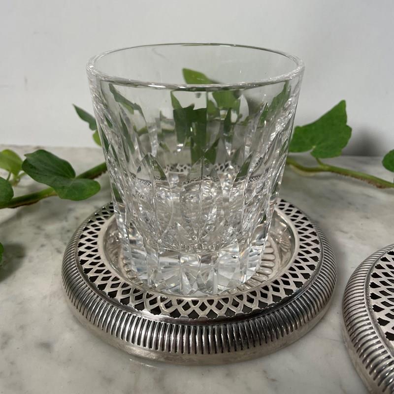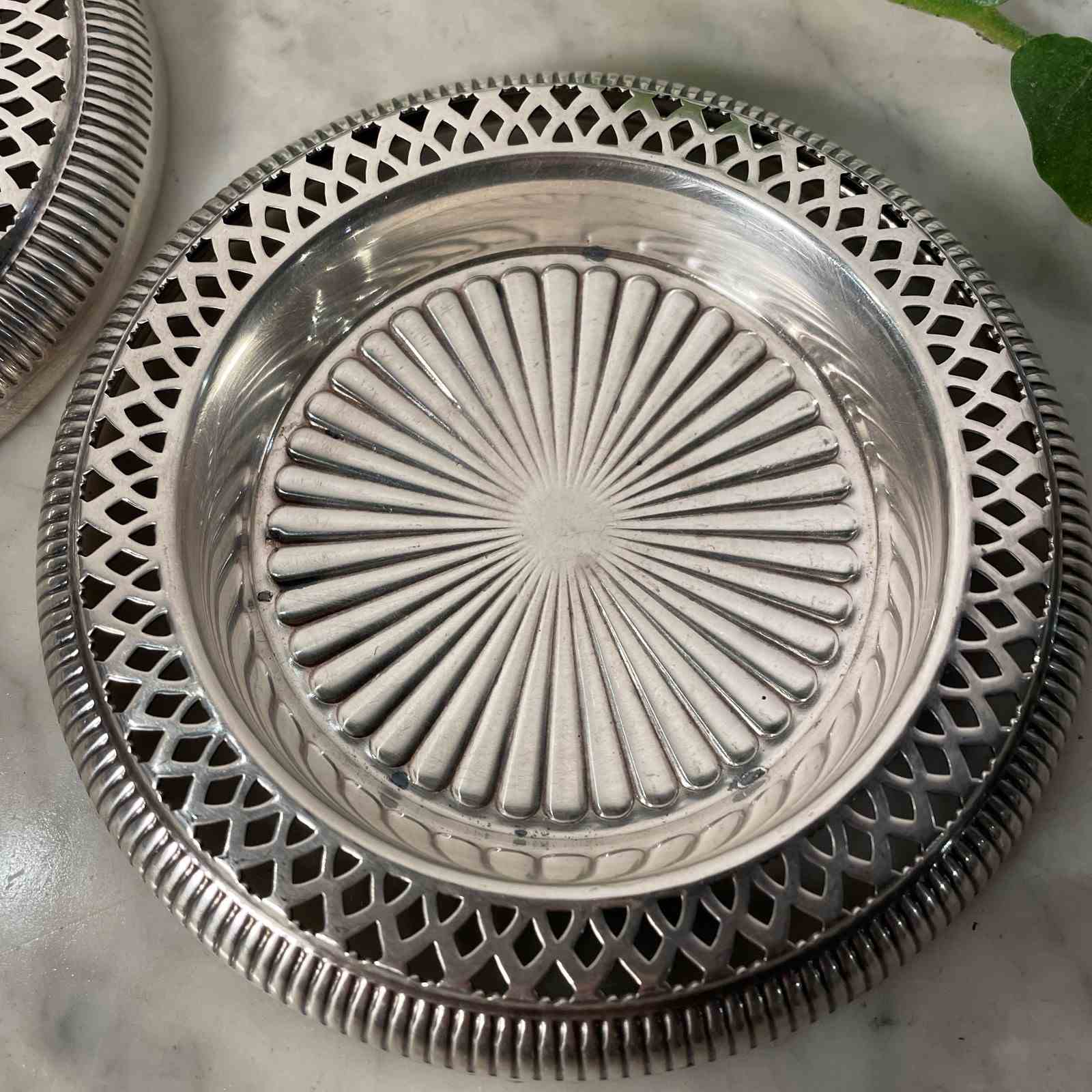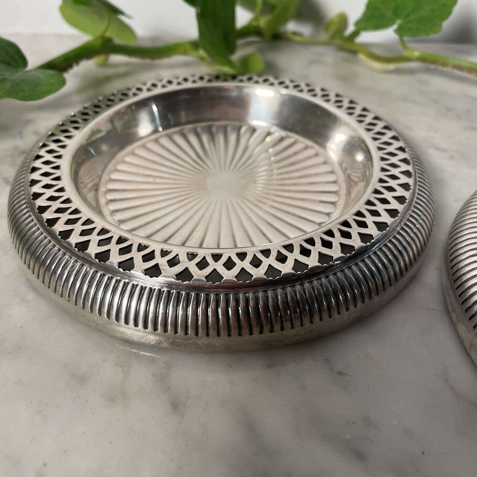 Pair of Silver Plated Coasters with pierced decoration to the edge and star burst decoration to the centre.