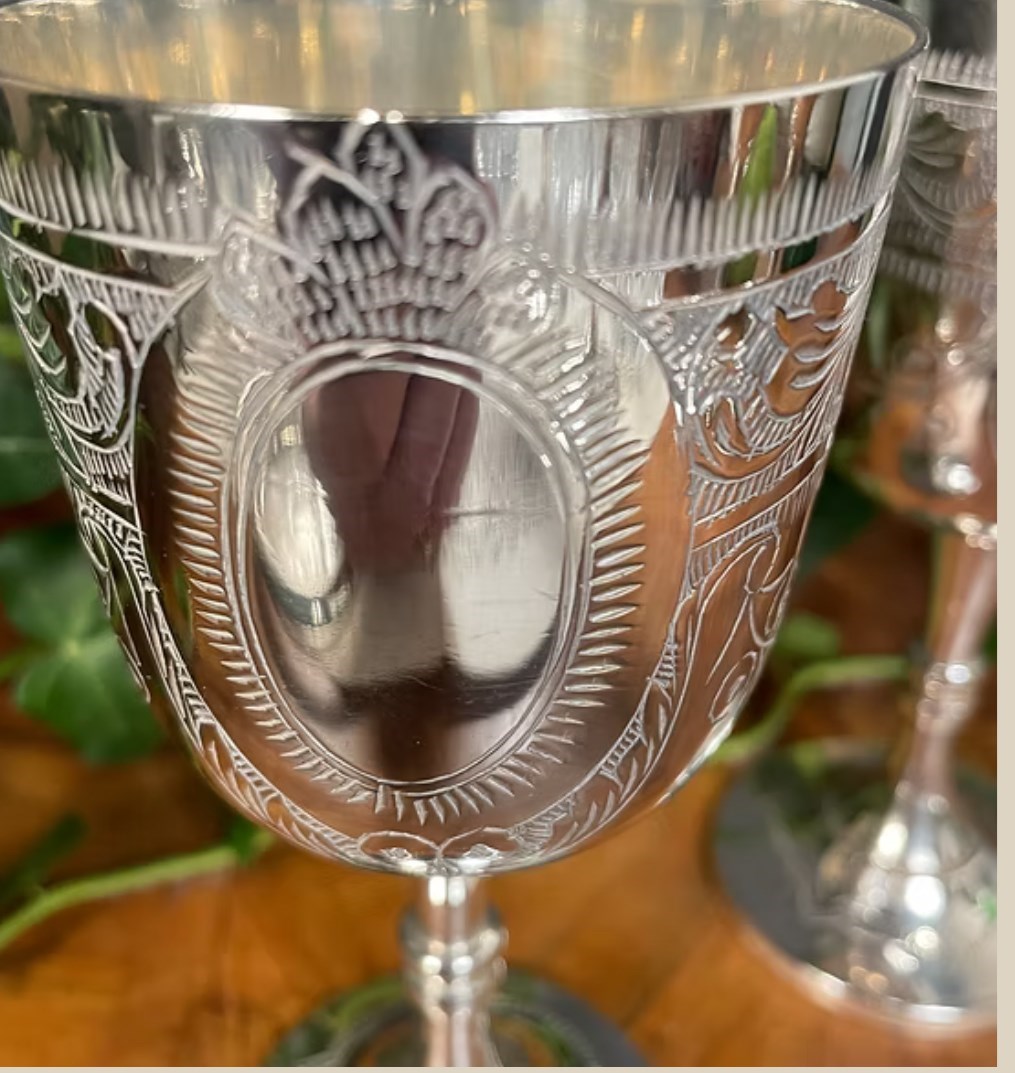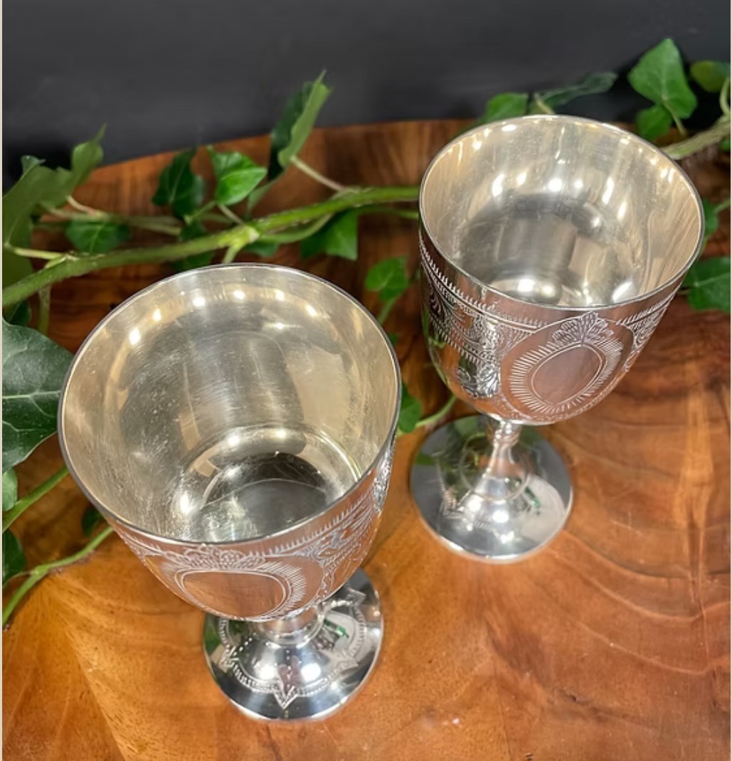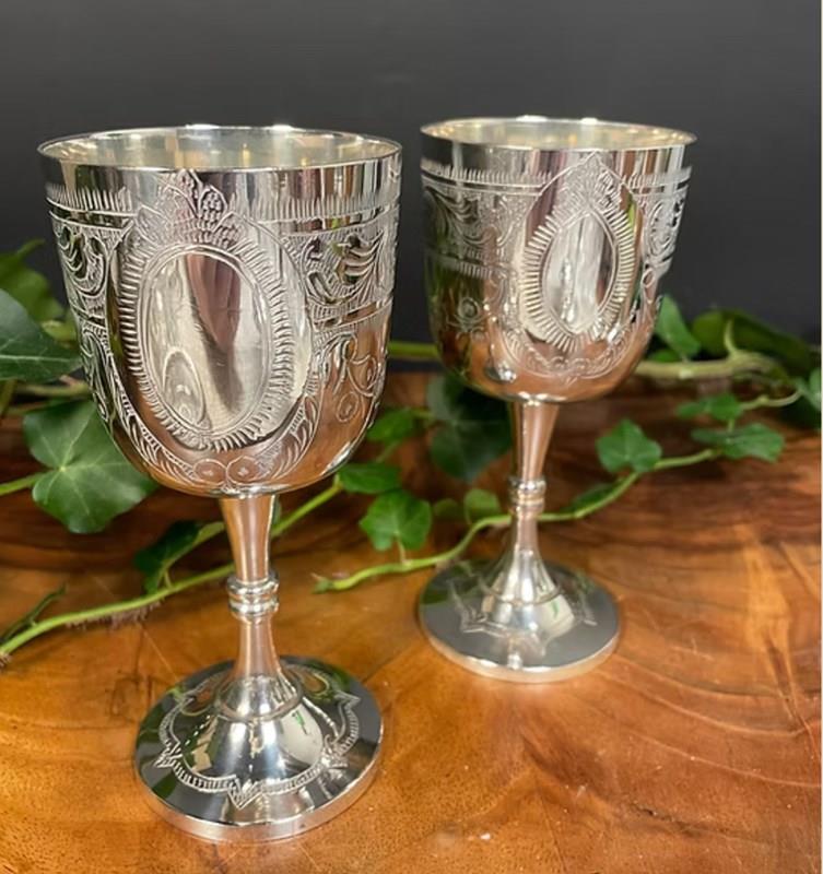 Pair Of Silver Plated Engraved Vintage Goblets