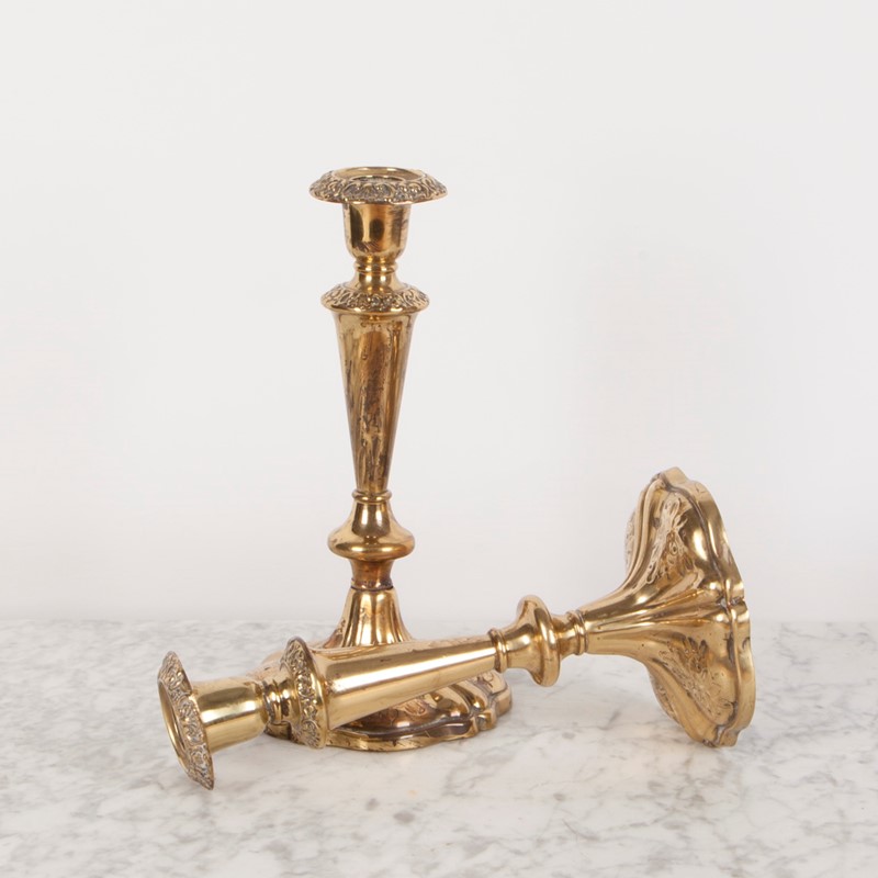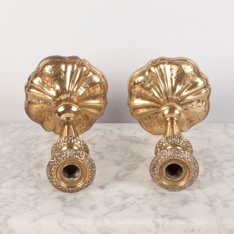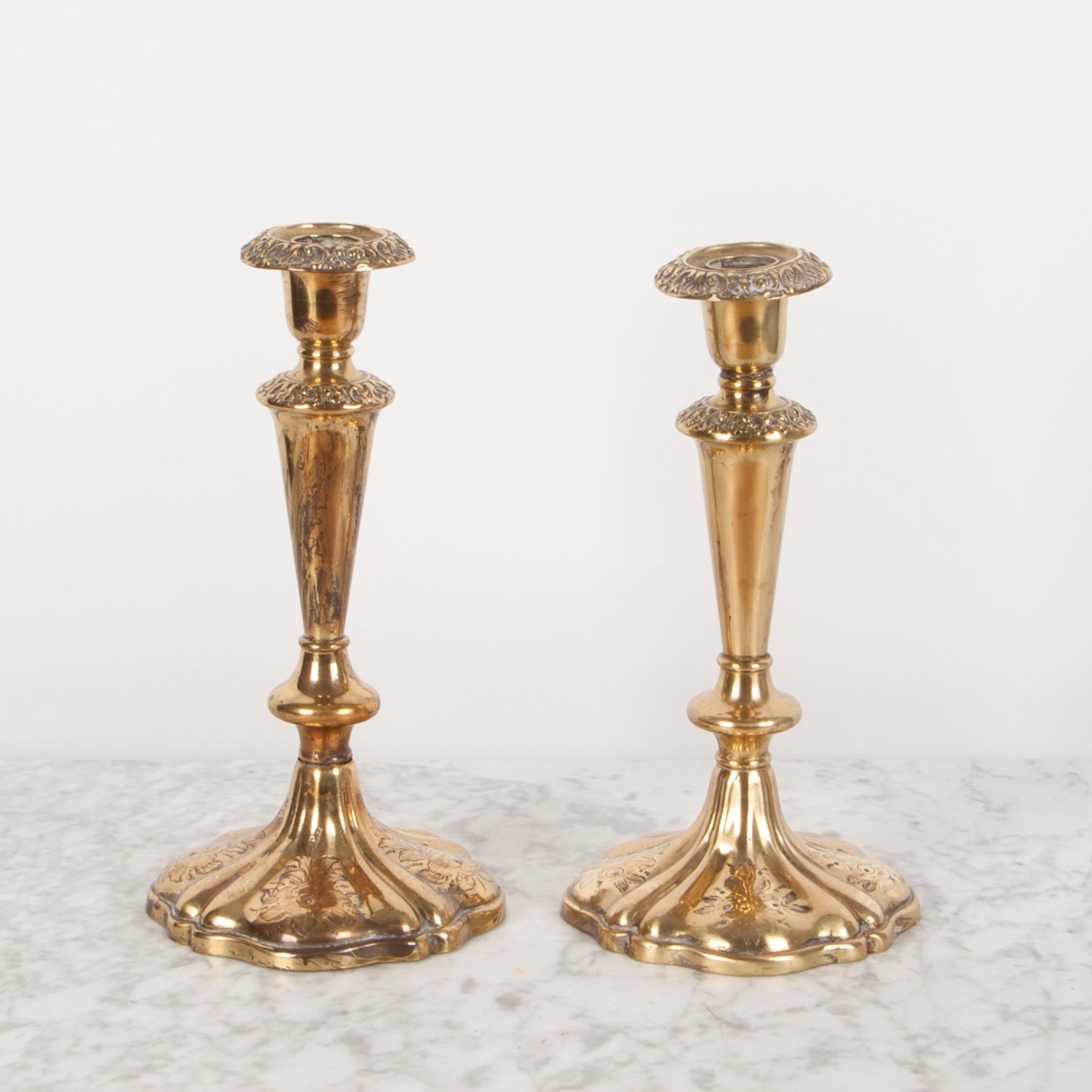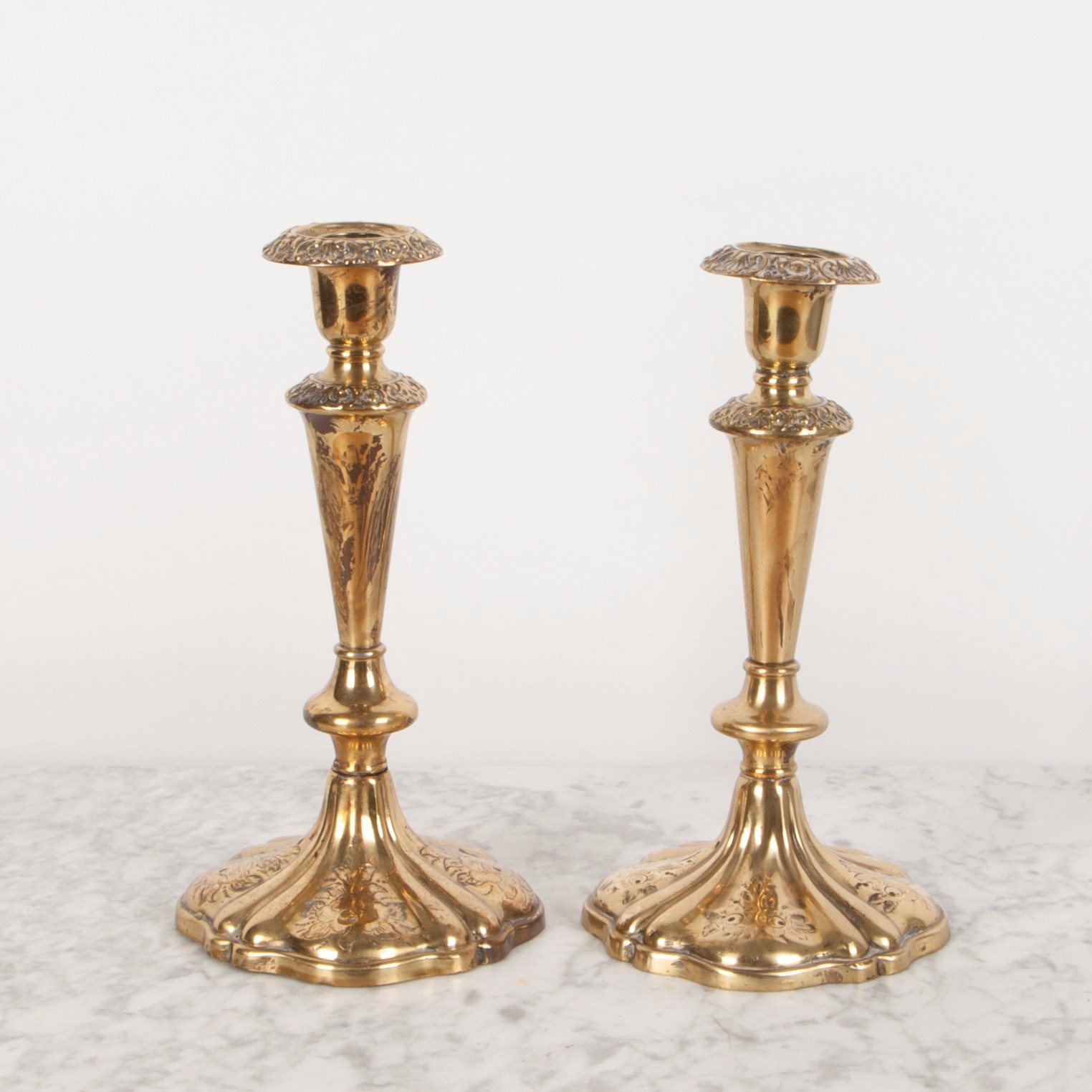 A pair of gilded brass candlesticks with a foliage design to base. Very typically English with the sconce decoration. They are in reasonable condition with some scratches. Dimensions: 25cm high and the base measure 13cm across.
