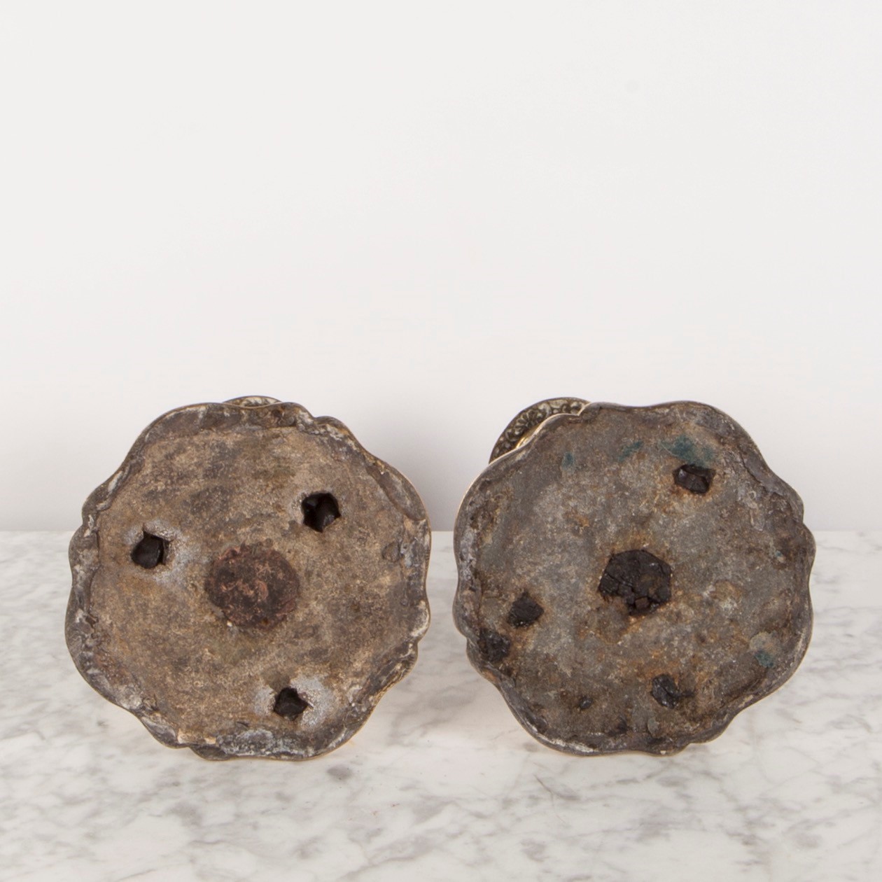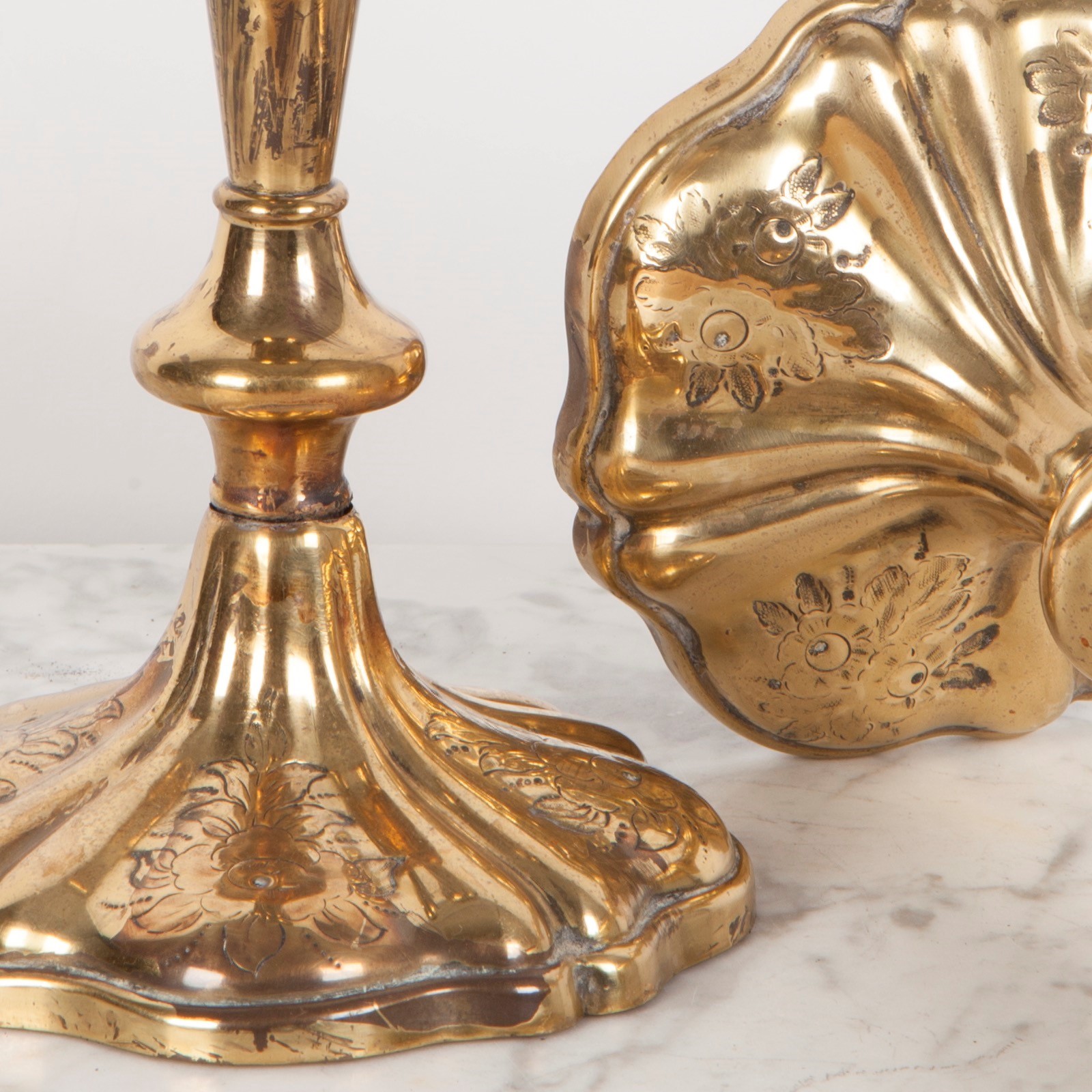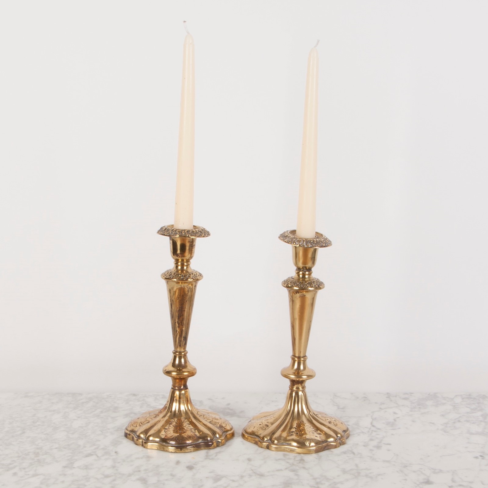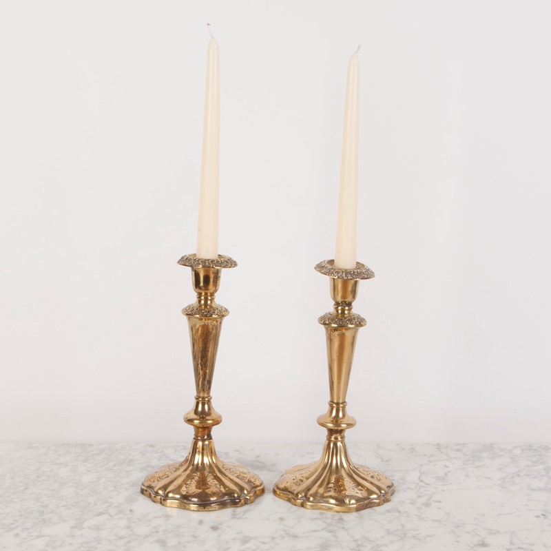 A pair of gilded brass candlesticks with a foliage design to base. Very typically English with the sconce decoration. They are in reasonable condition with some scratches. Dimensions: 25cm high and the base measure 13cm across.