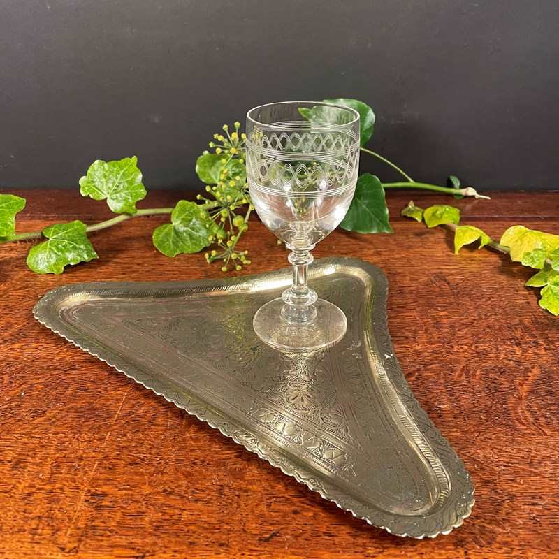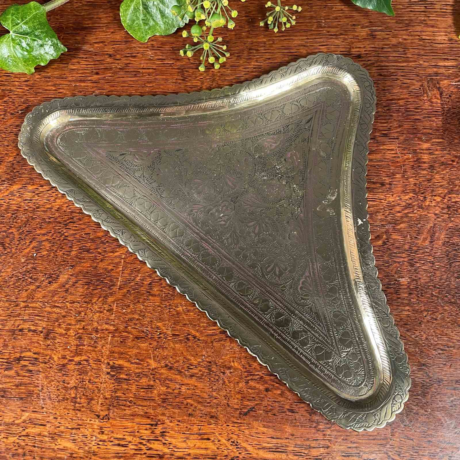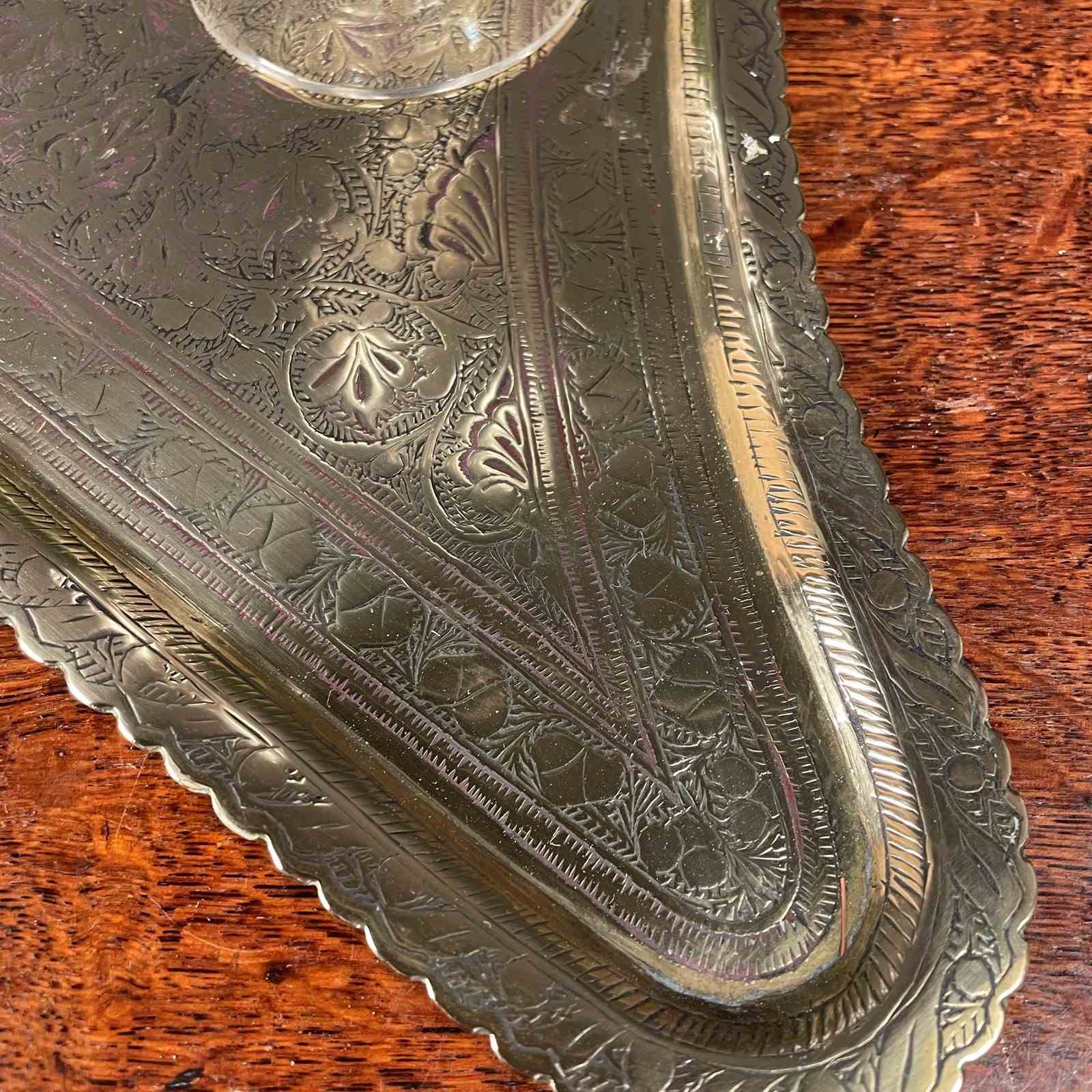 A pretty engraved triangular drinks tray with a fine engraved design and a fluted edge. Made in India around 1920.