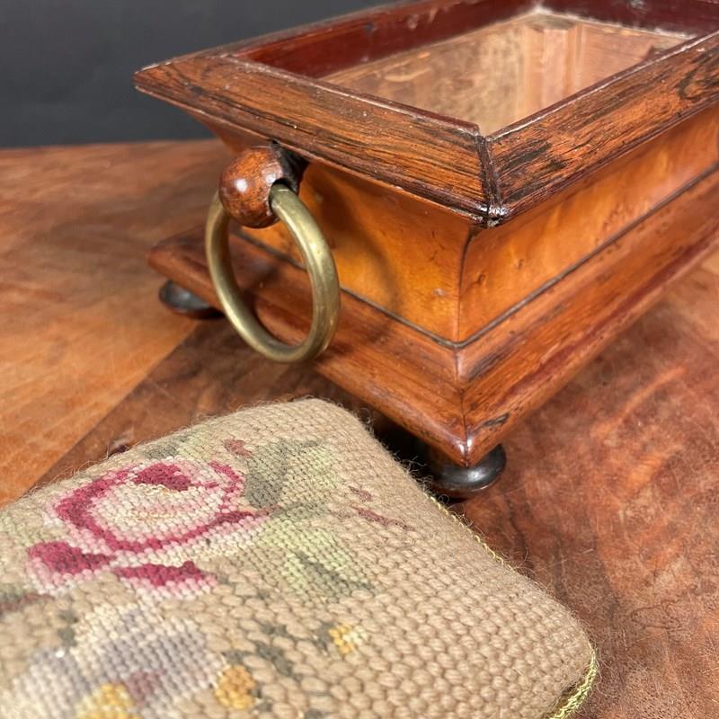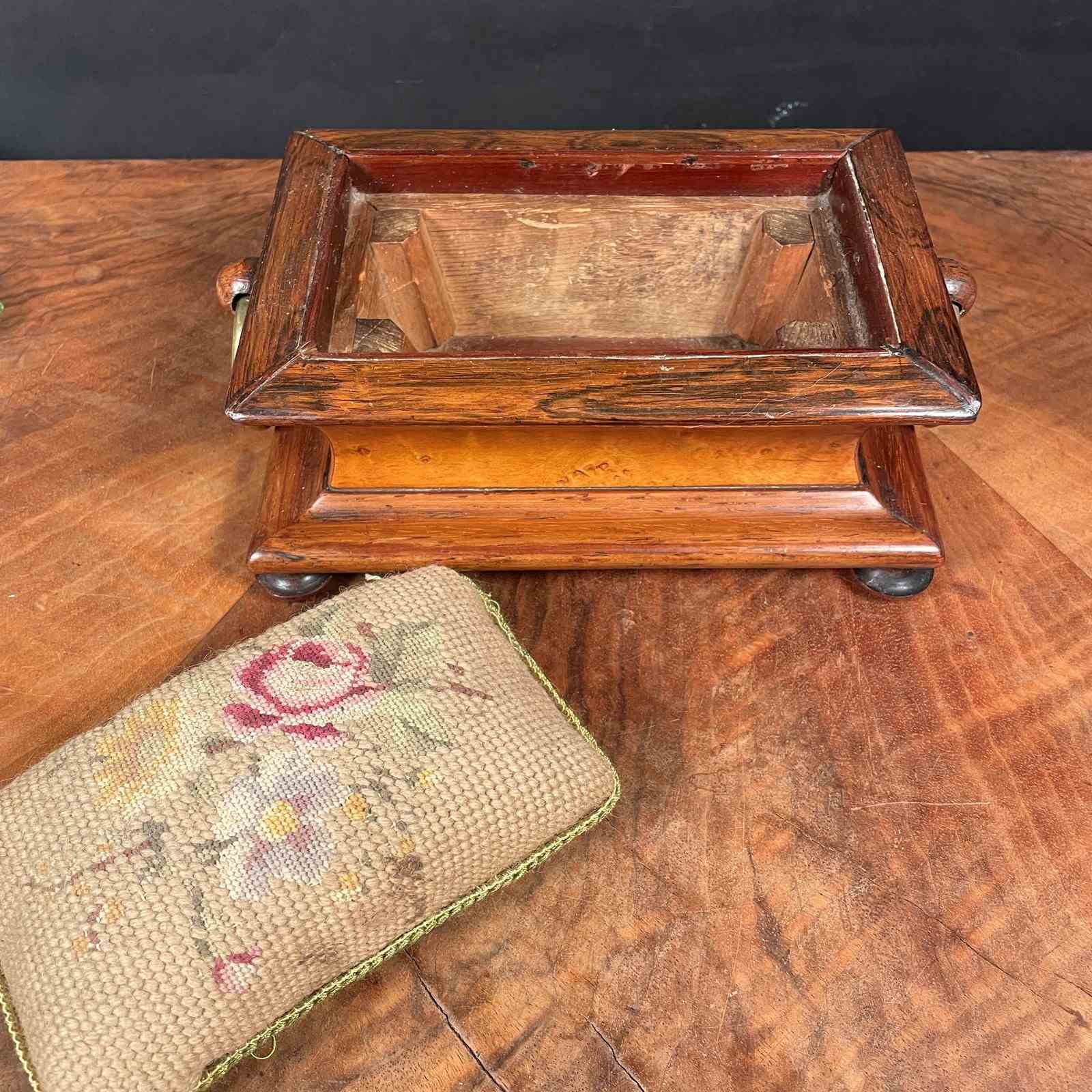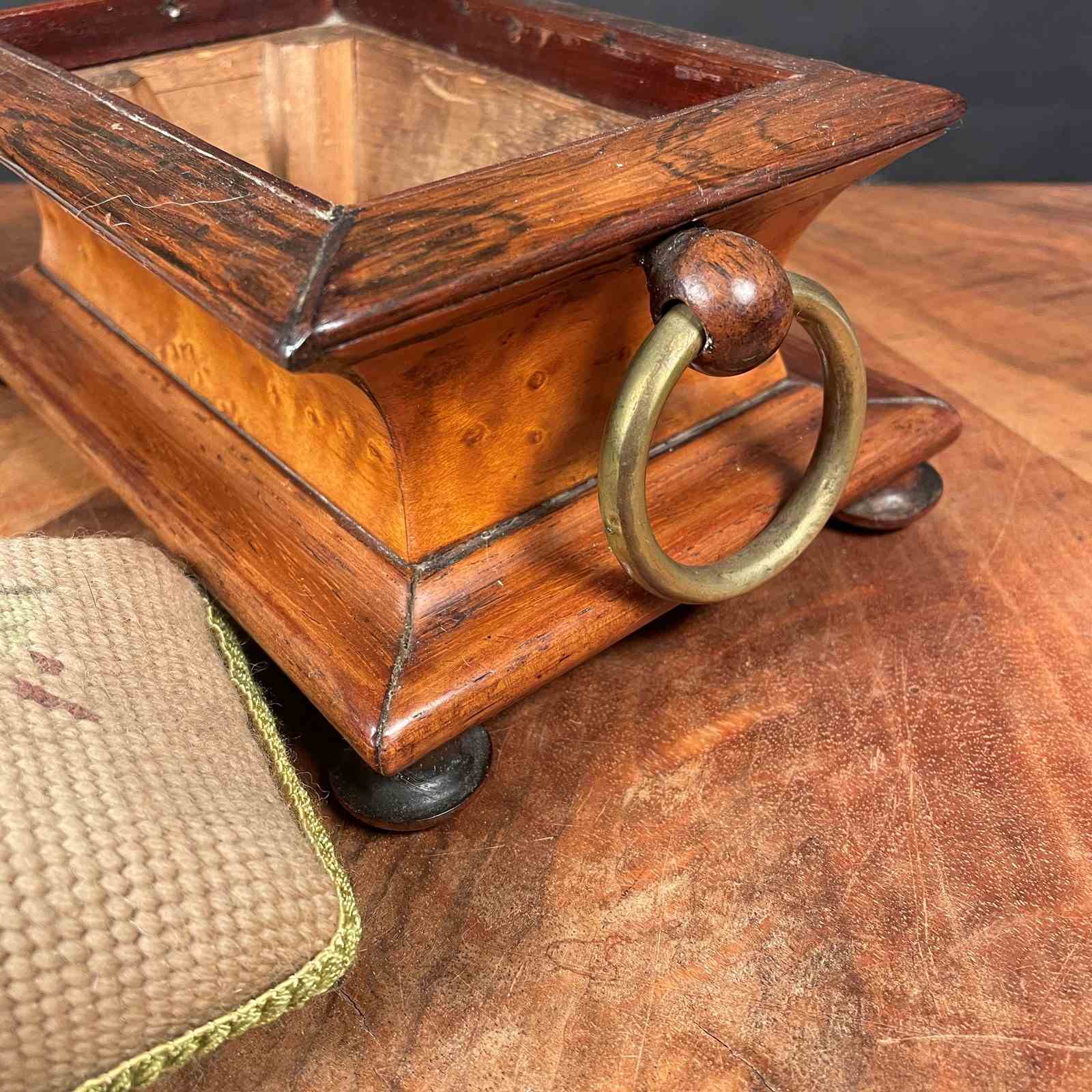 A lovely quality Regency sewing box with deep pincushion lid, brass handles and bun feet.