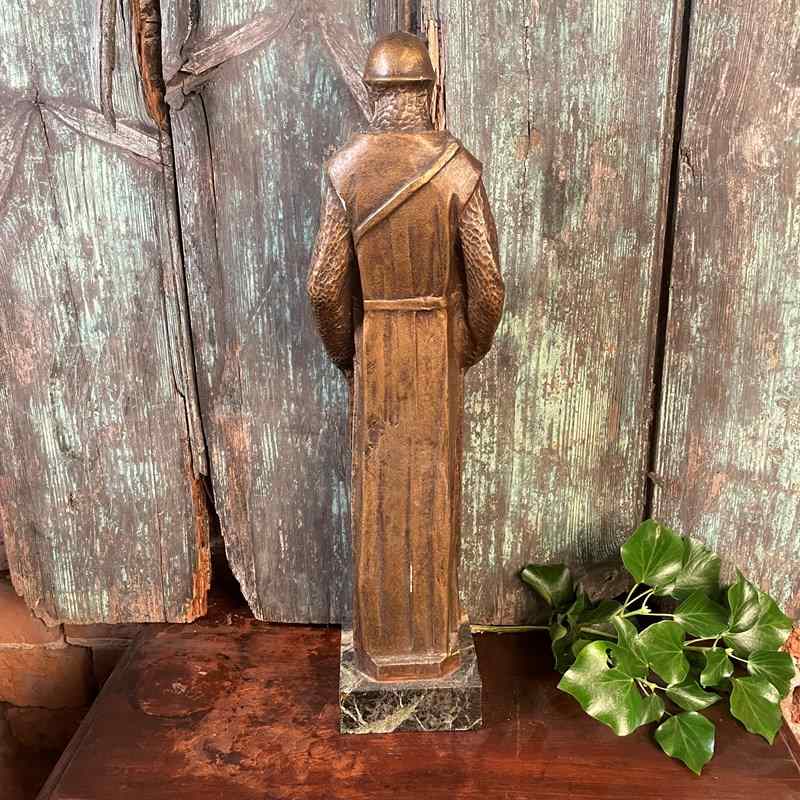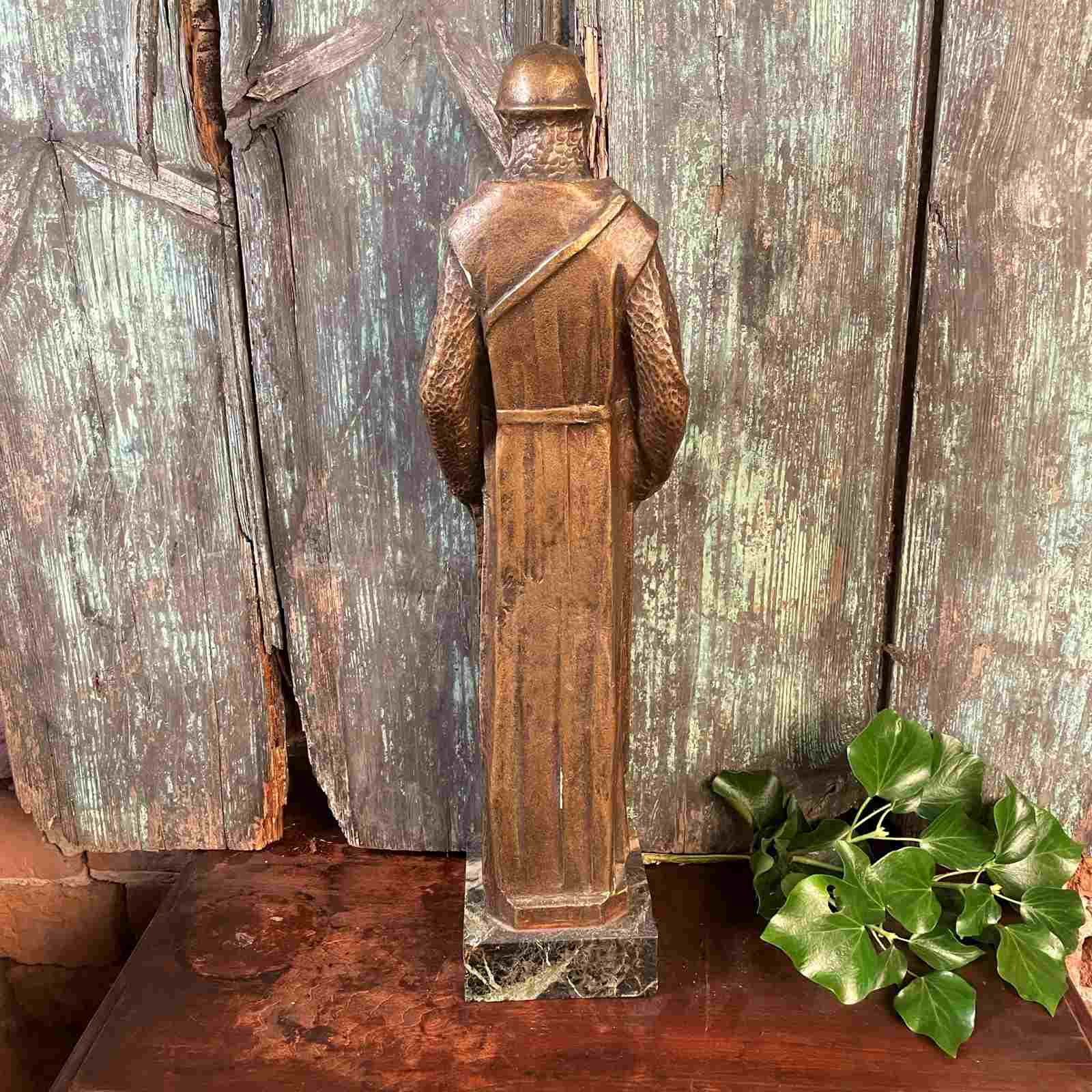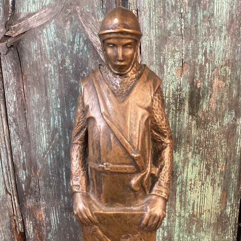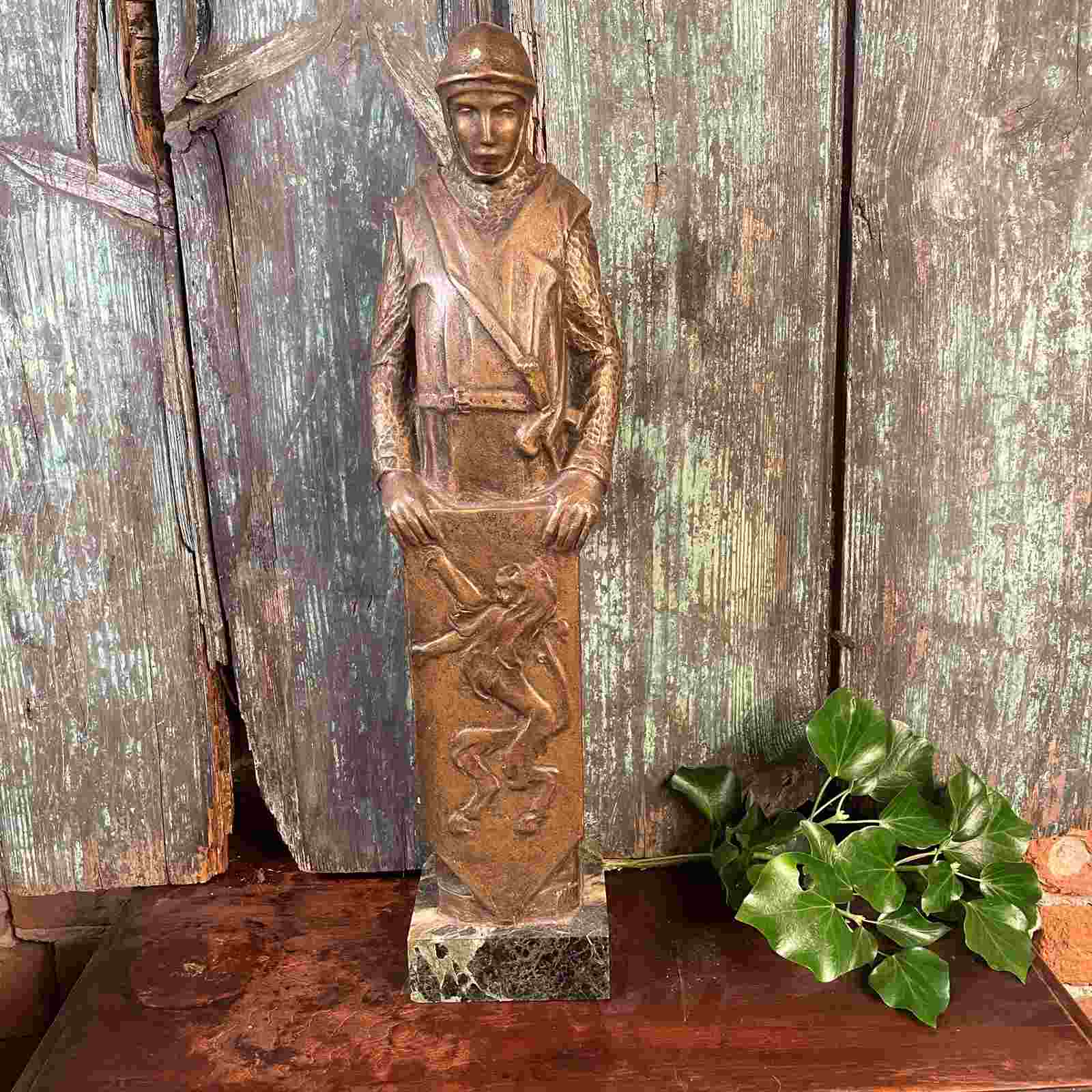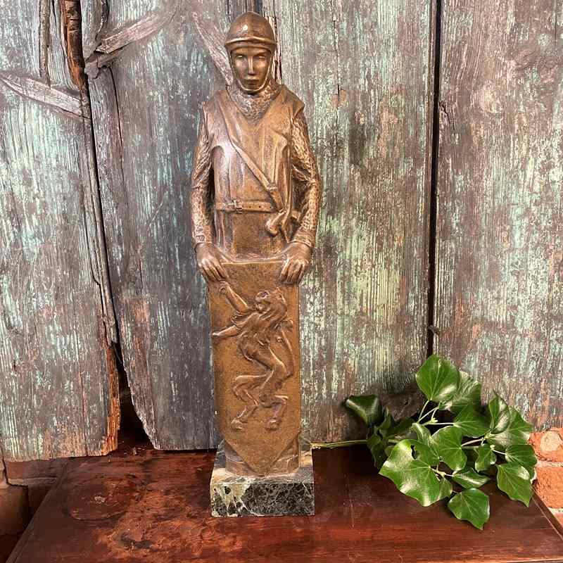 A sculpture of a knight of the realm, holding a shield depicting a lion, by Robert Van Der Velde made in plaster and bronzed, on a marble base.