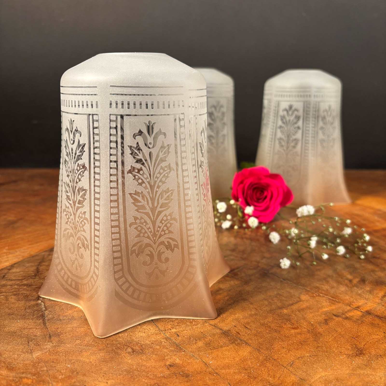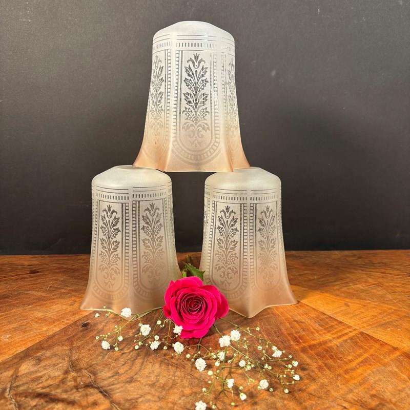 A set of 3 Edwardian glass shades with etched decoration.