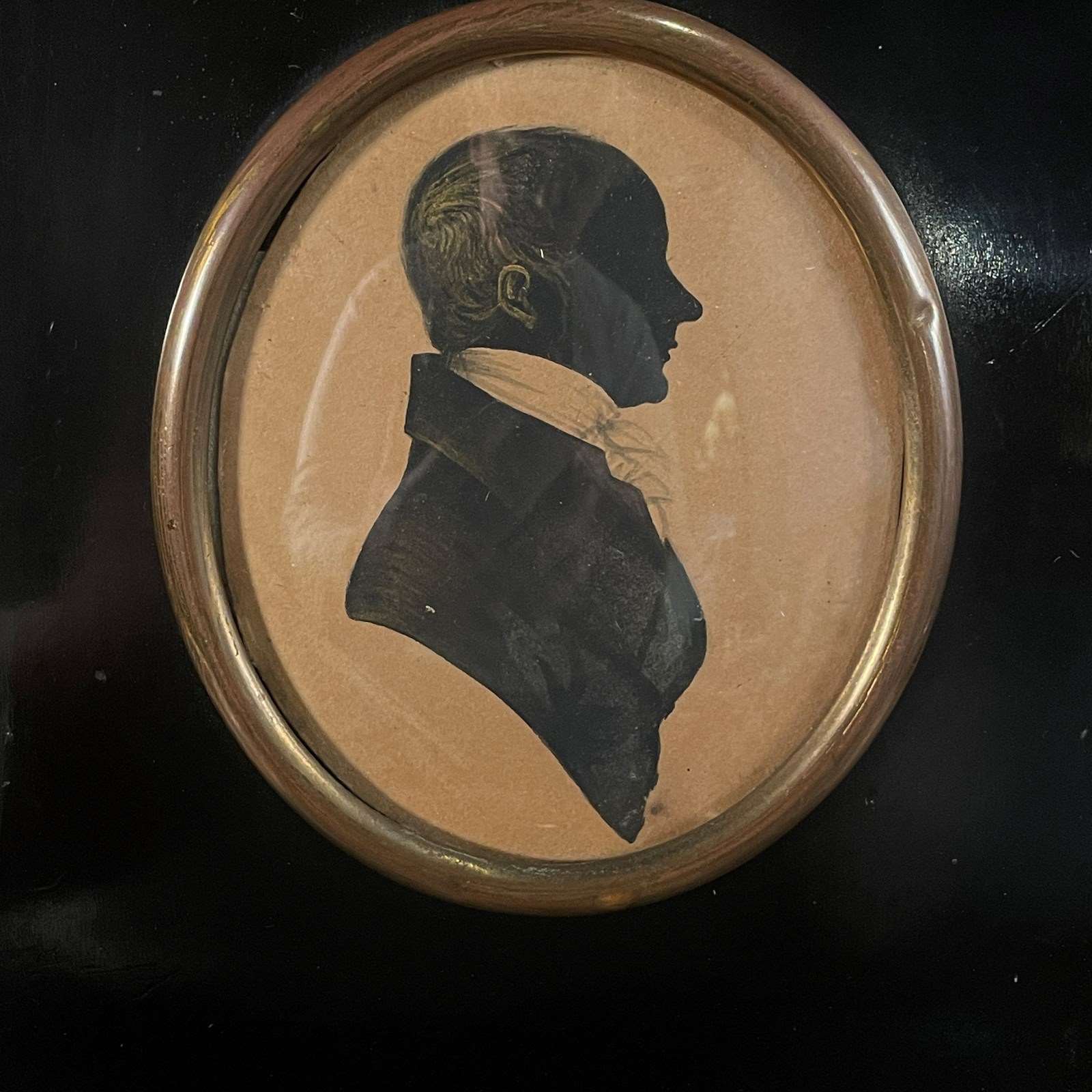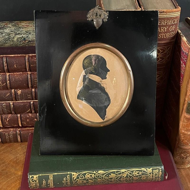 A hand painted silhouette of a Gentleman in a traditional black frame with acorn deoration.