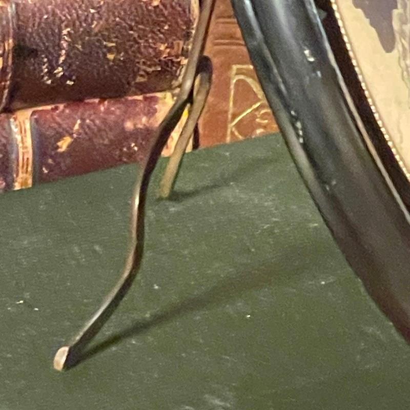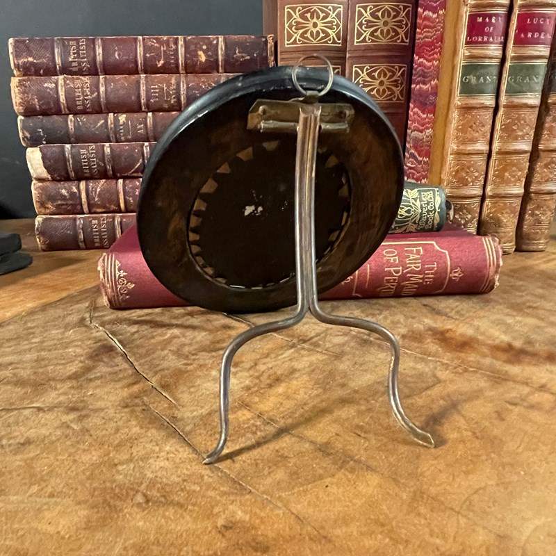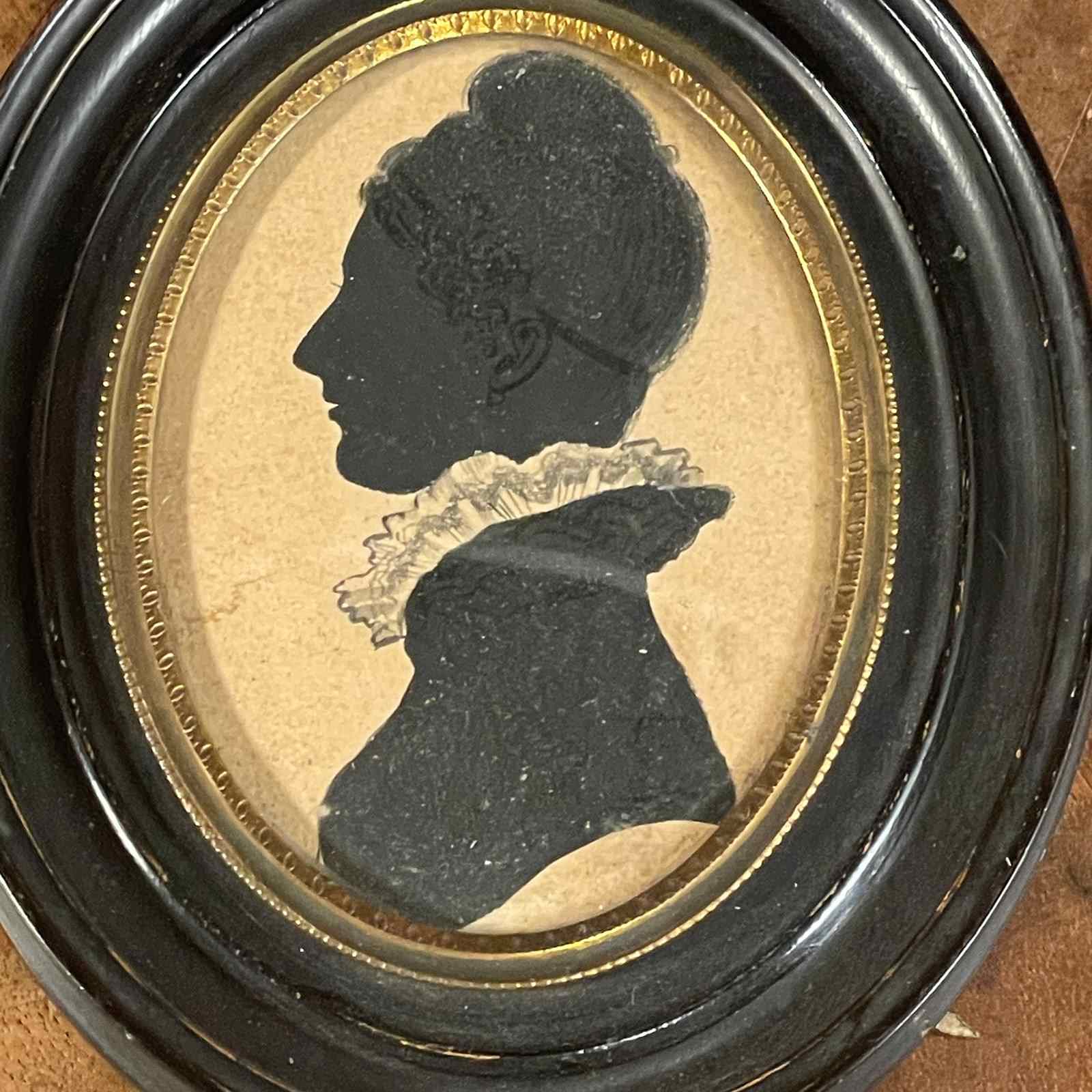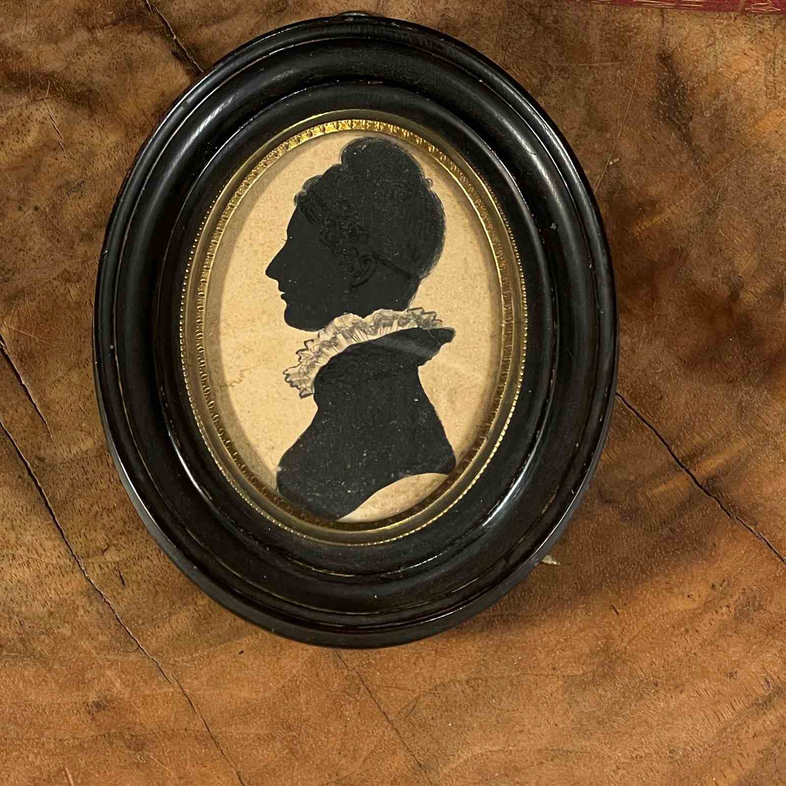 A hand painted silhouette of a young lady in a traditional black frame with a hook with which to hang on the wall or an easel to allow it to stand freely.