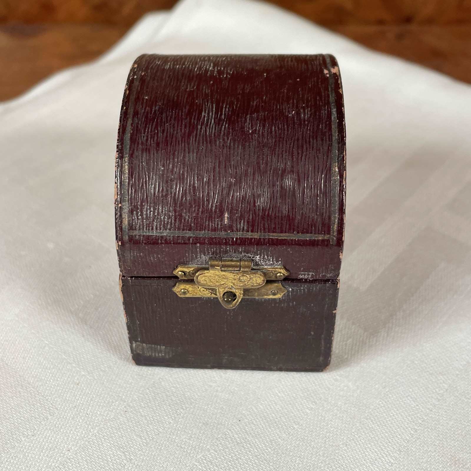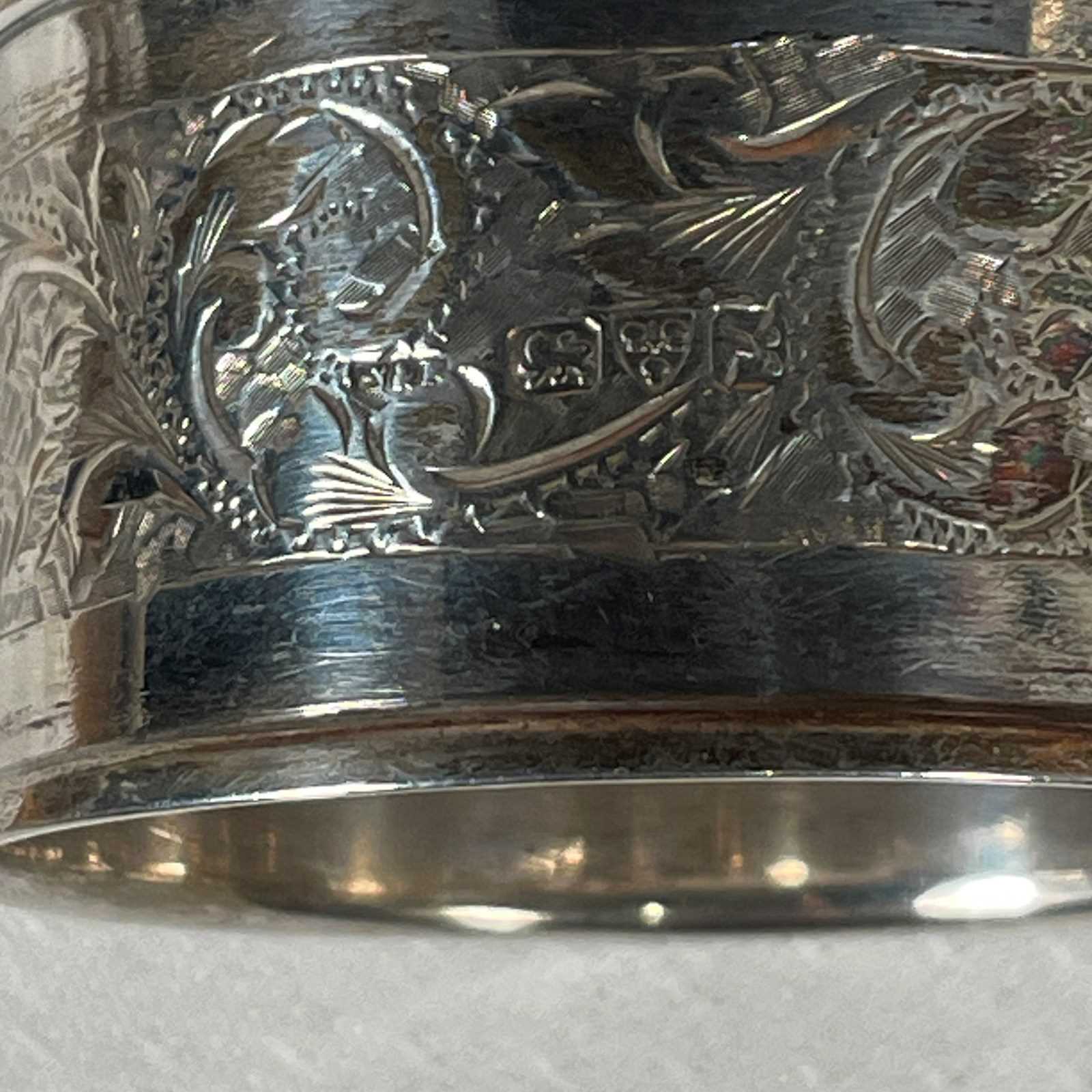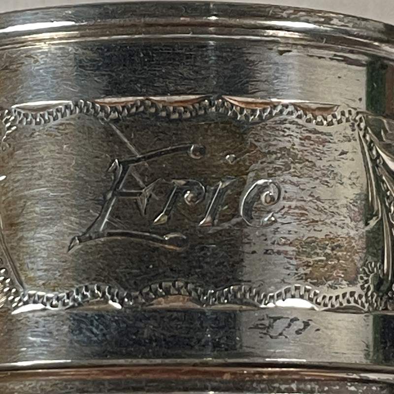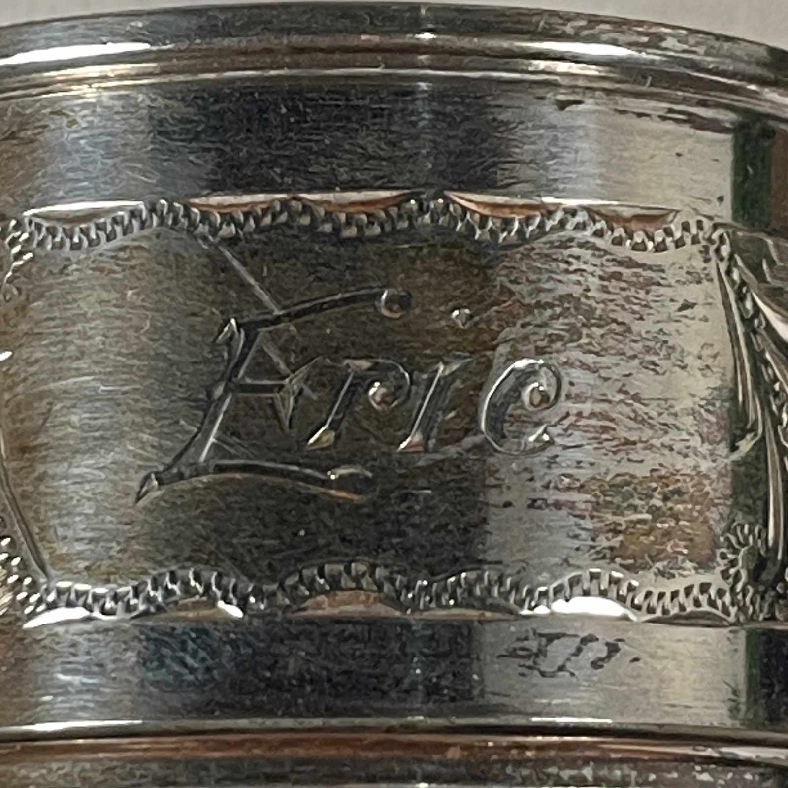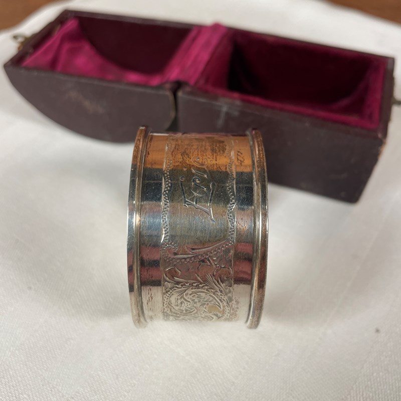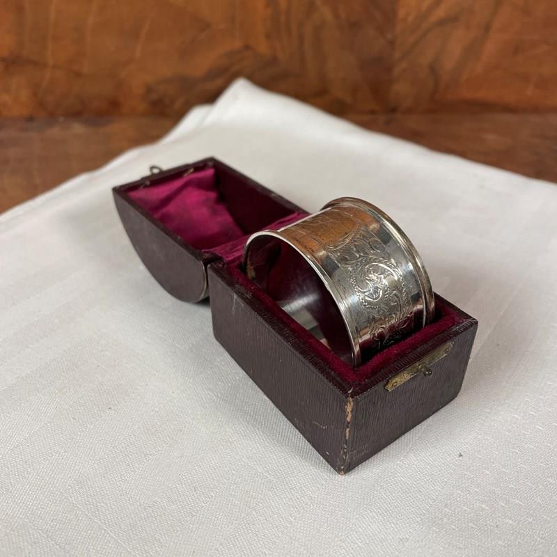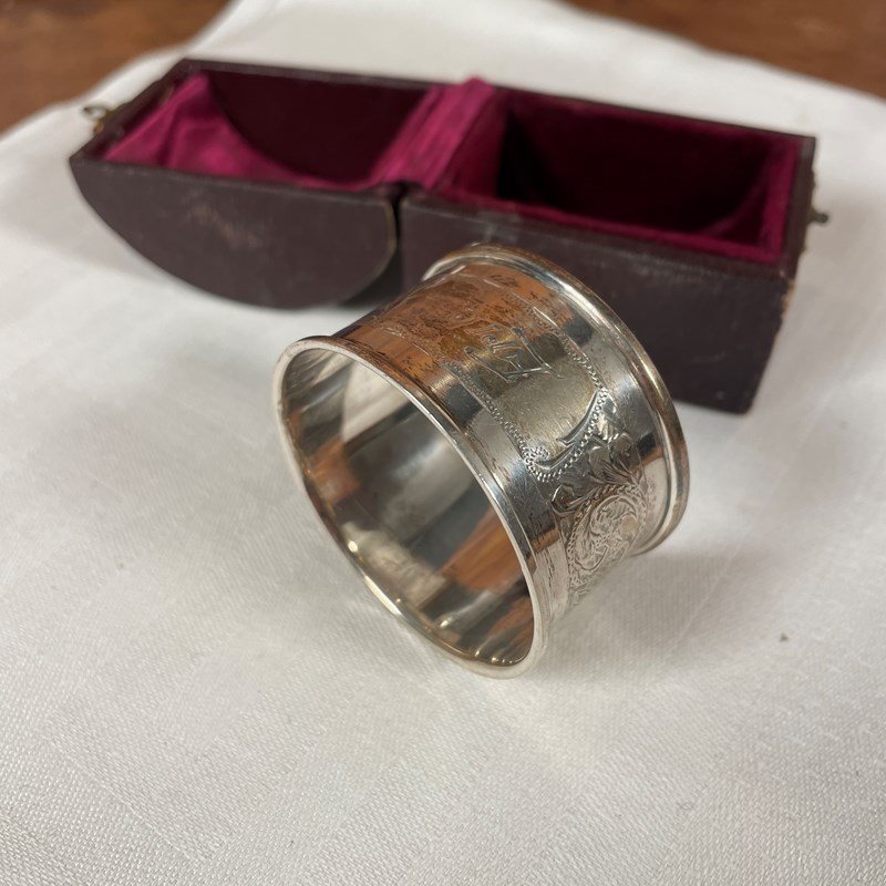 A hallmarked silver napkin ring with ornate engraved decoration and the name ‘Eric ‘ inscribed on one side, in its original leather box.