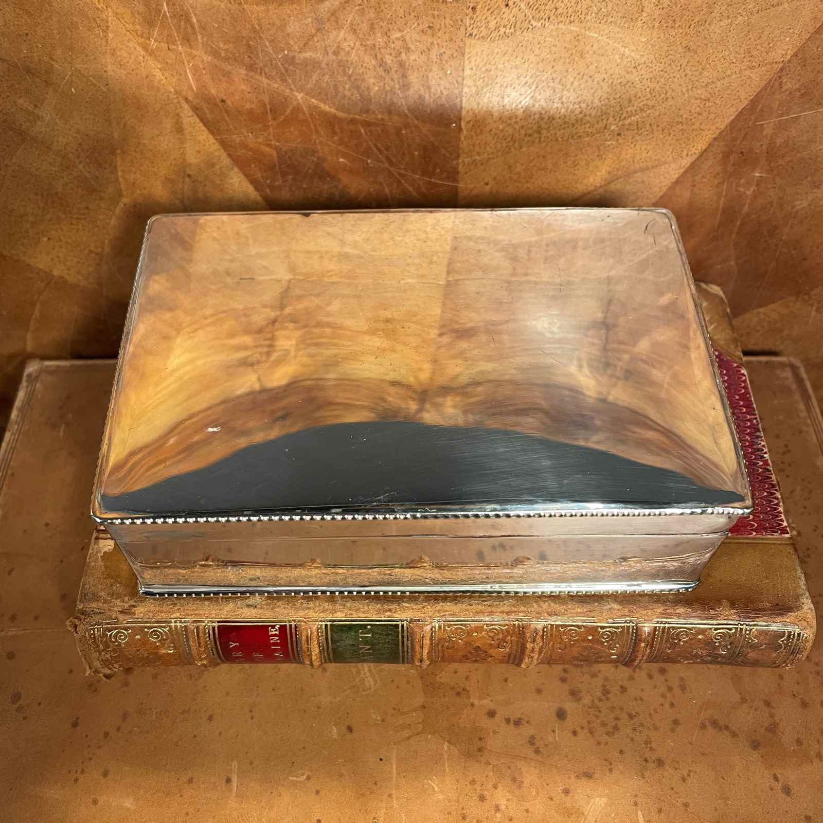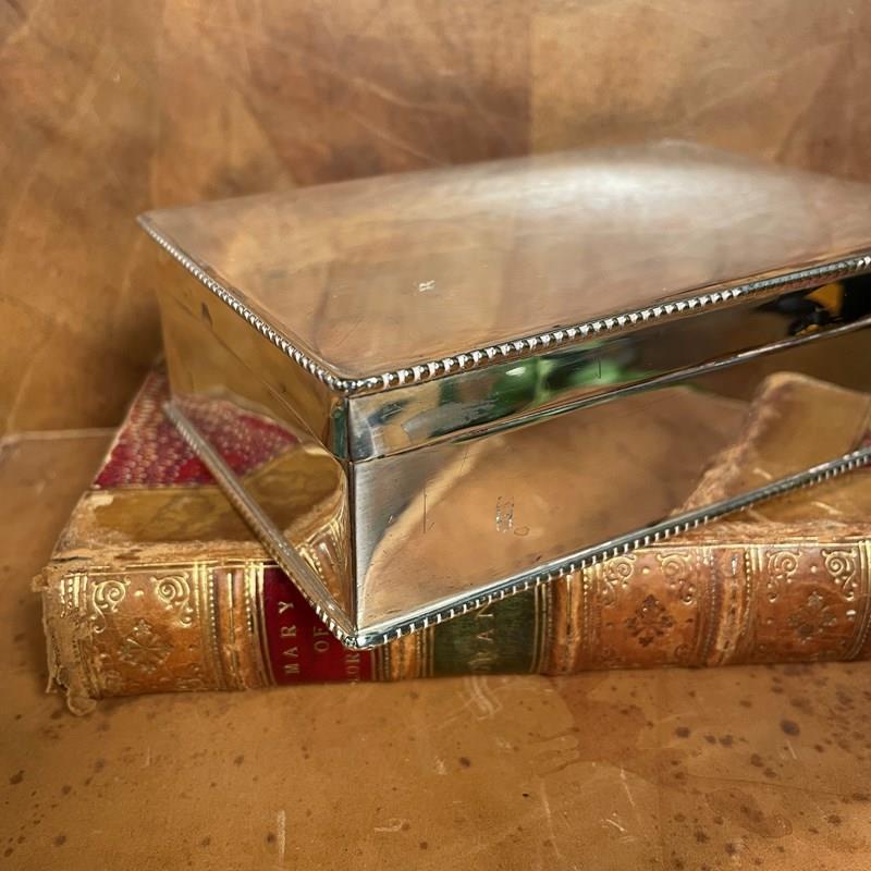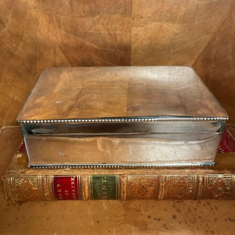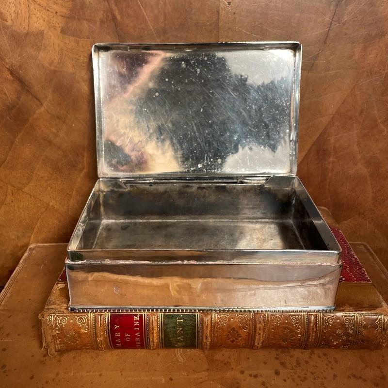 A smart silver plated box. This style of box would have originally been used for playing cards or cigarettes.