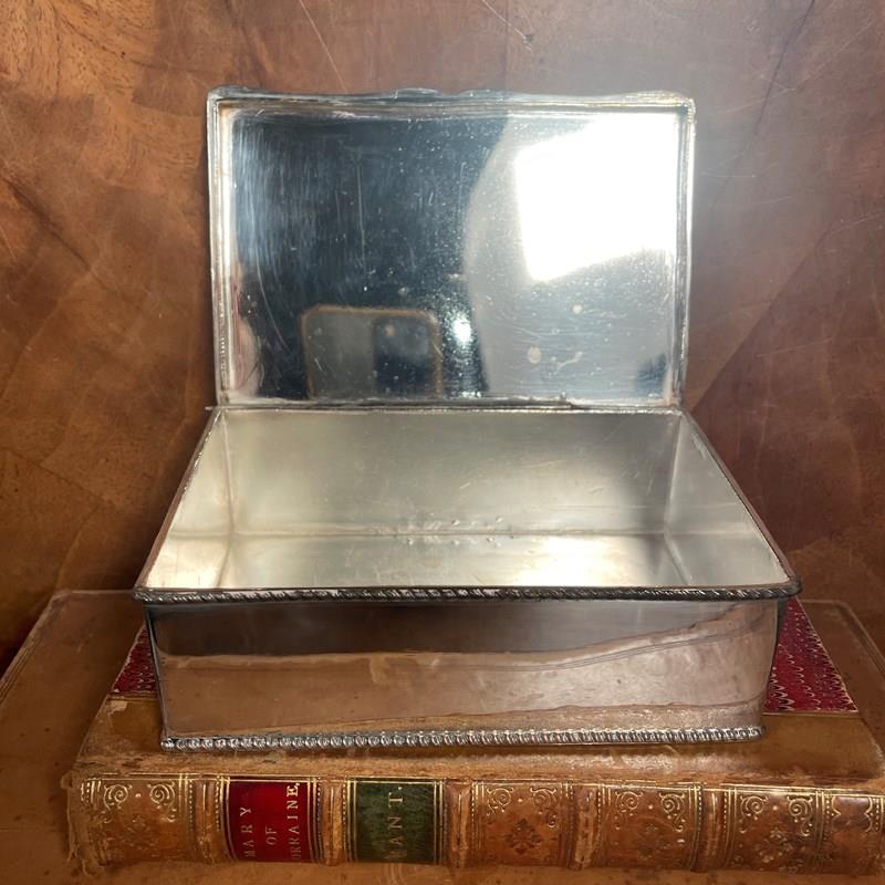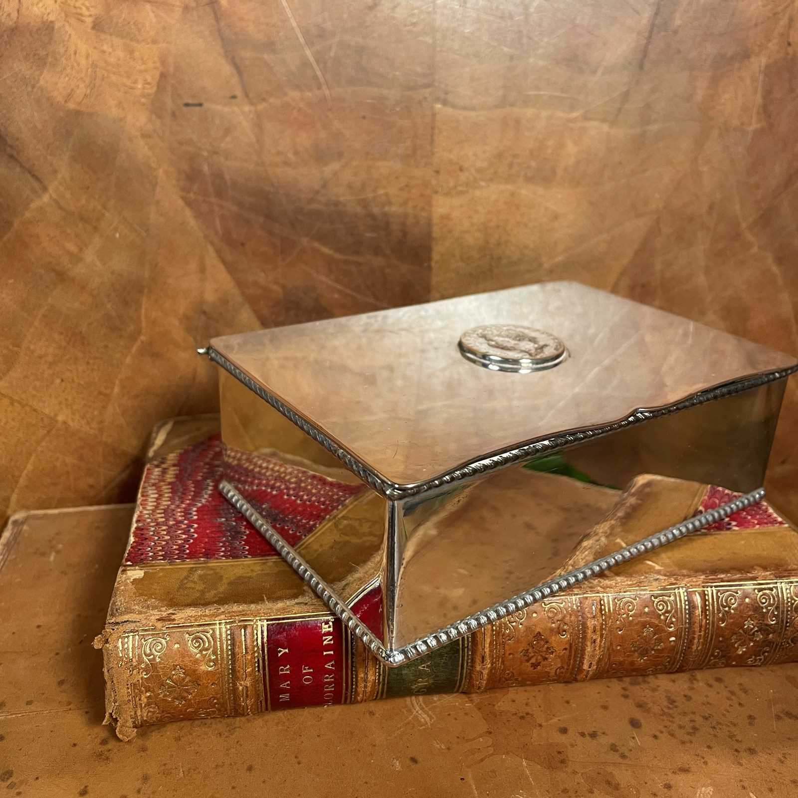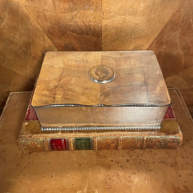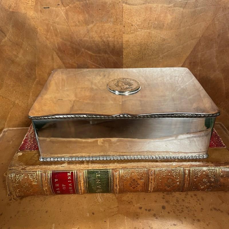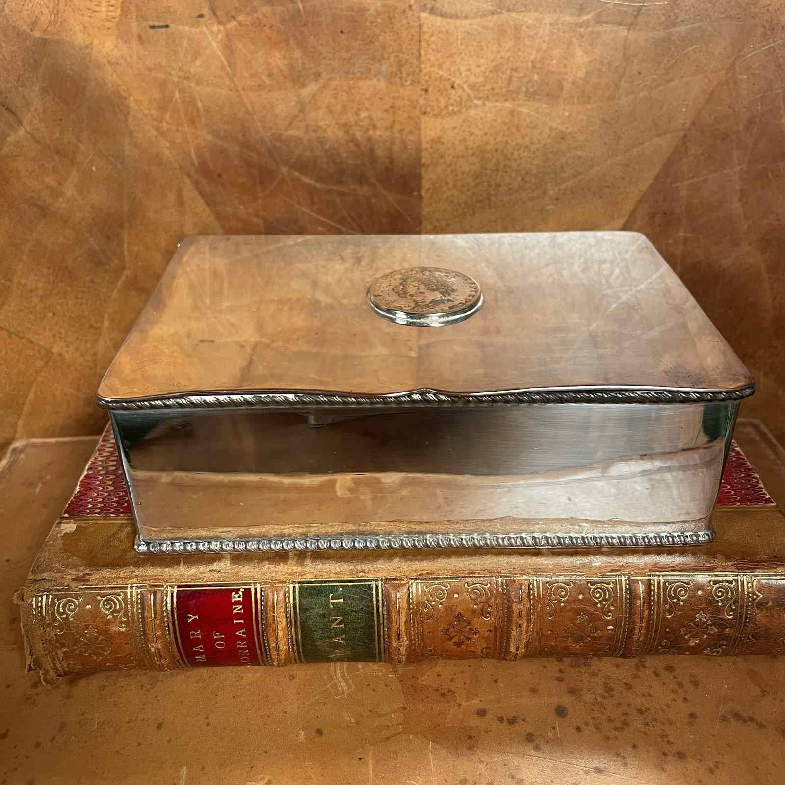 A smart silver plated box with a coin inset into the lid.This style of box would have originally been used for playing cards or cigarettes.