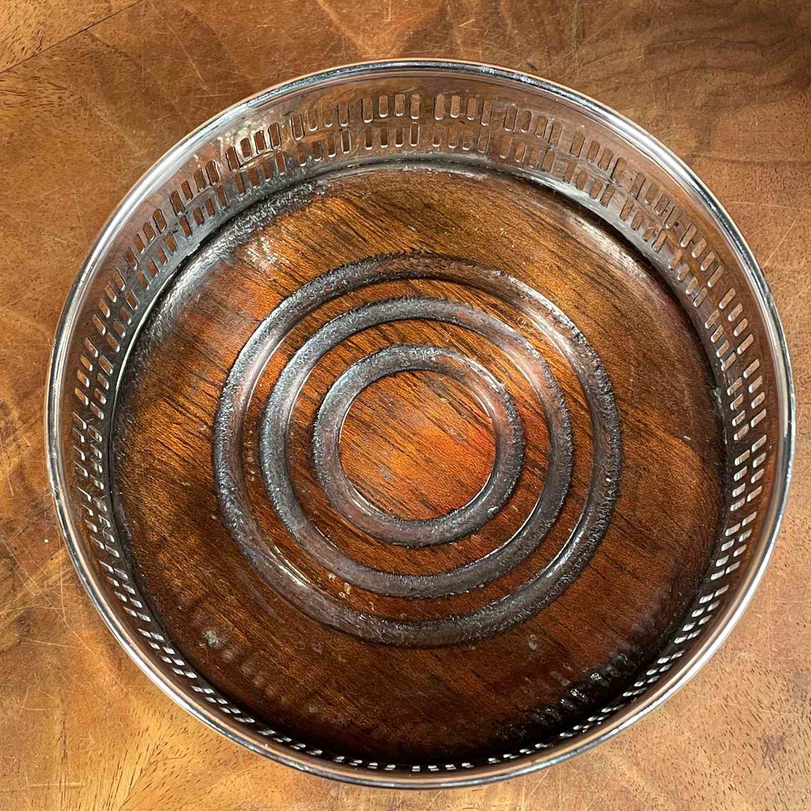 A silver plated bottle coaster with wooden insert and pierced decoration to the body.
