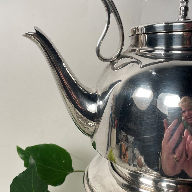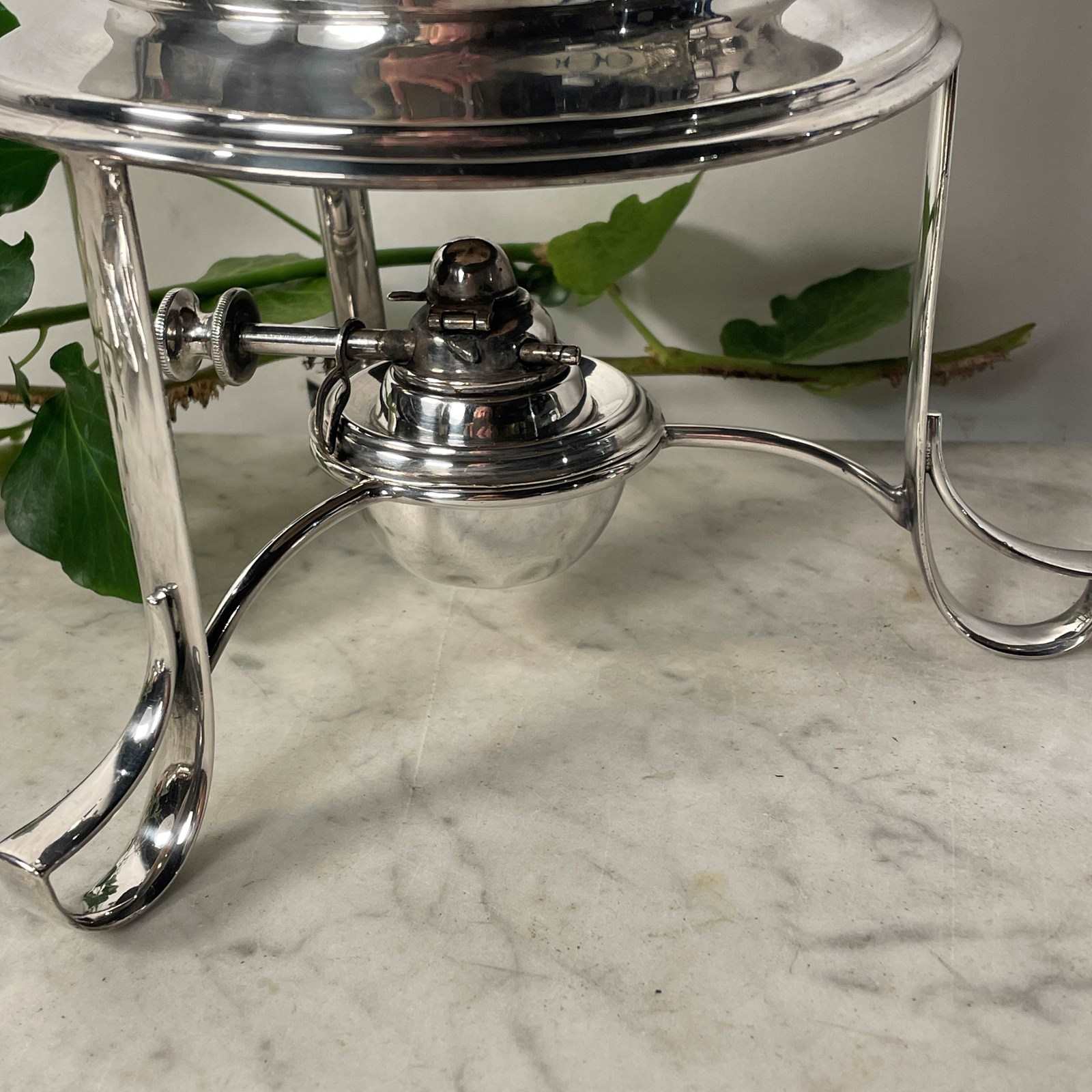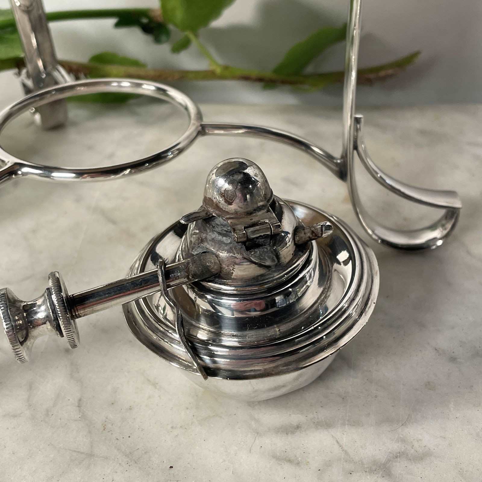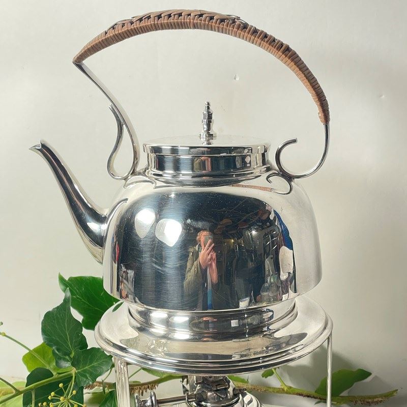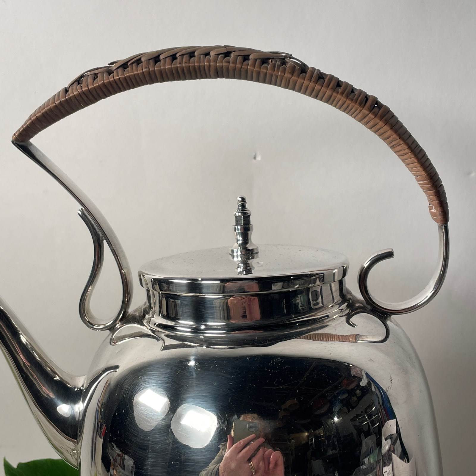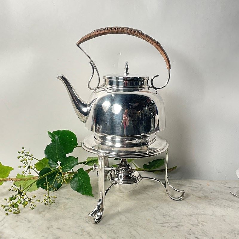 A pretty silver plated spirit kettle on stand with faux wicker handle, complete with spirit burner.
