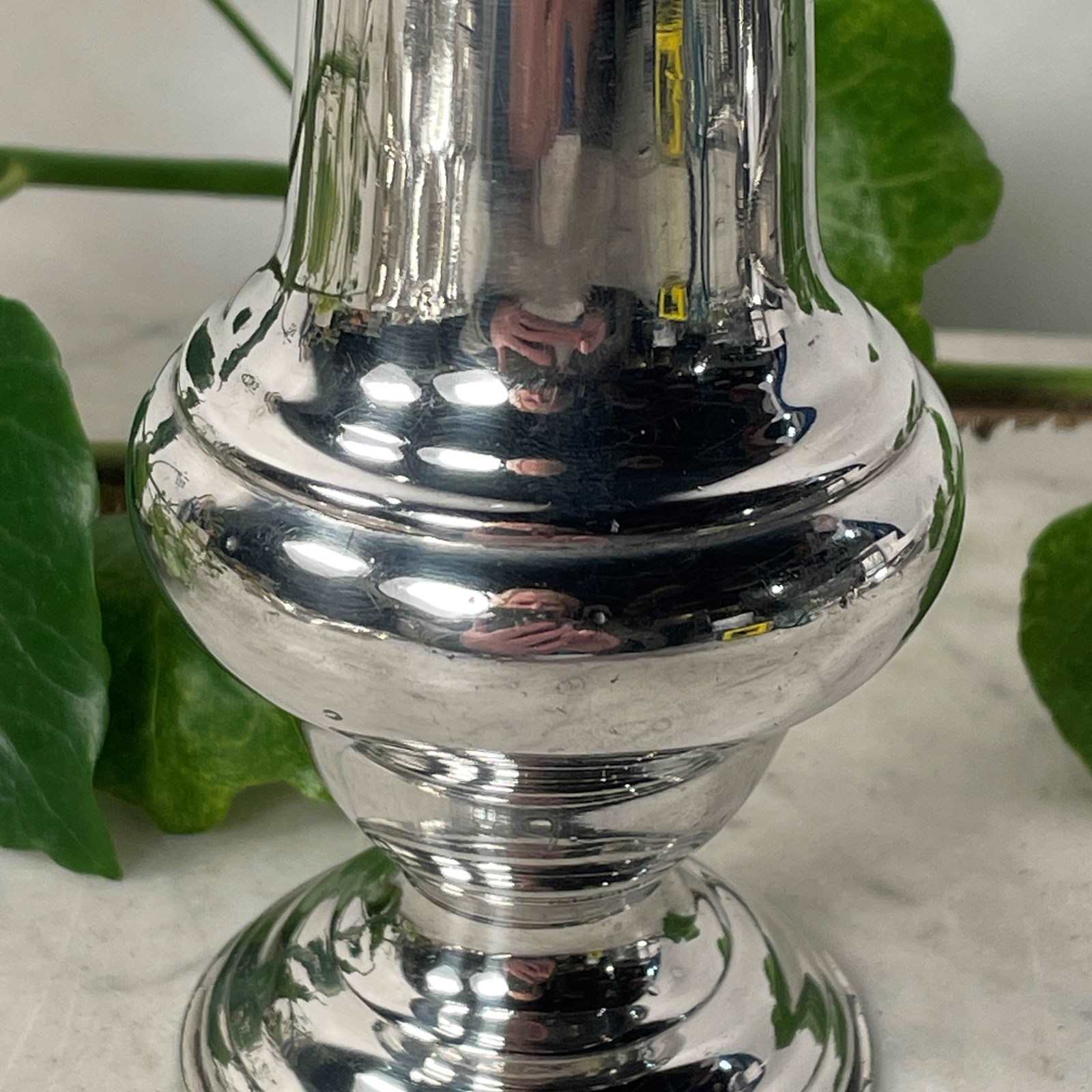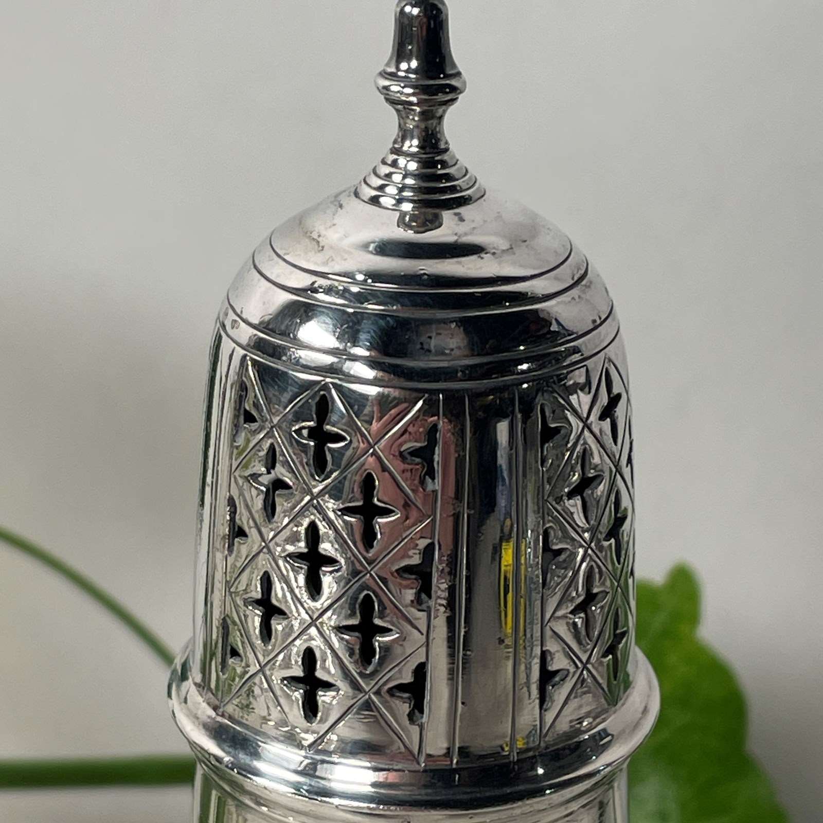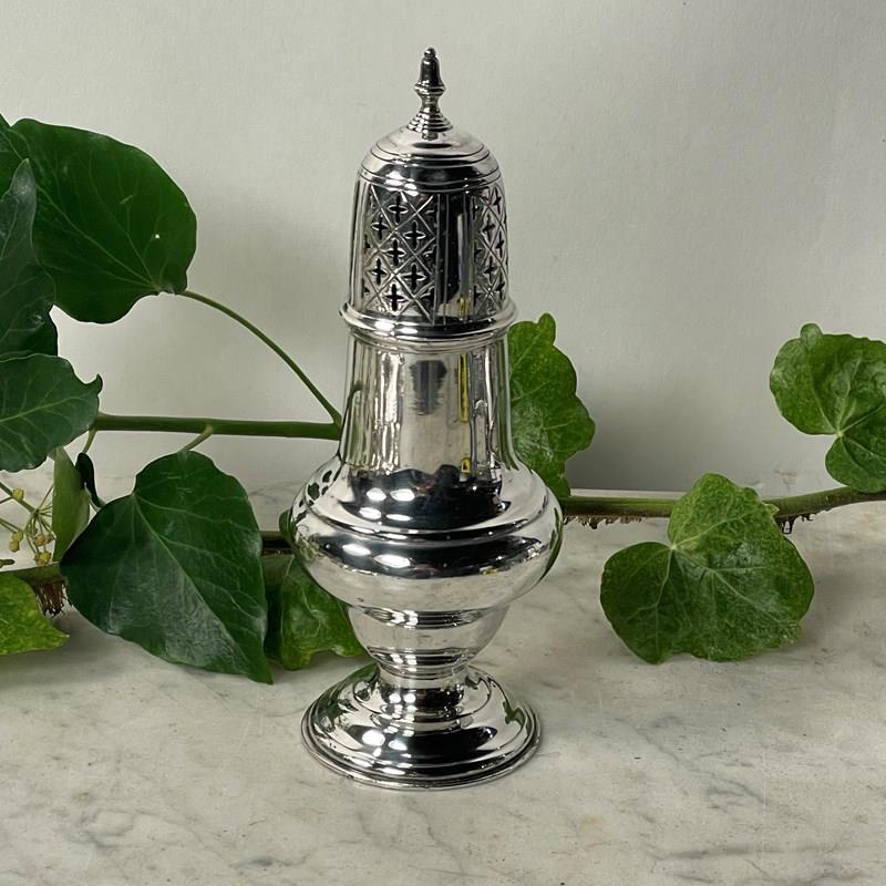 A pretty silver plated sugar duster with pierced decoration. Perfect for sifting sugar onto strawberries or cocoa on to cappuccino.