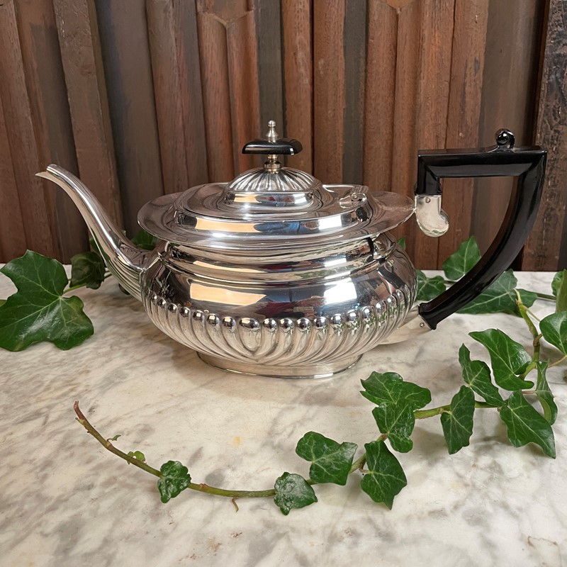 This is a smart silver plated tea pot of classical design with a celluloid handle and knob