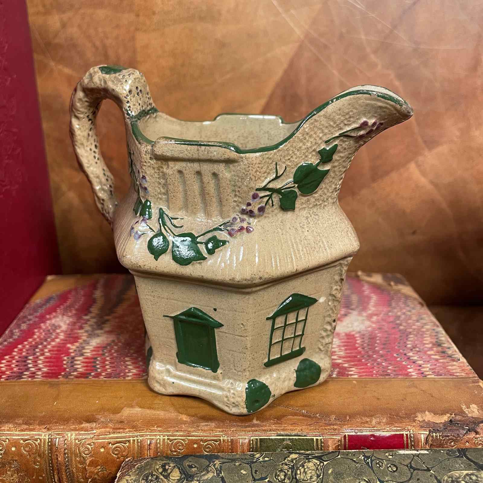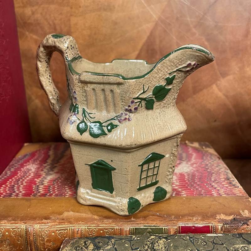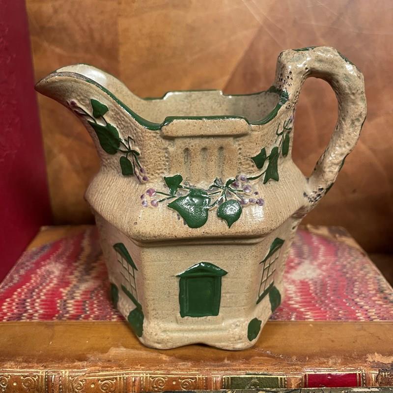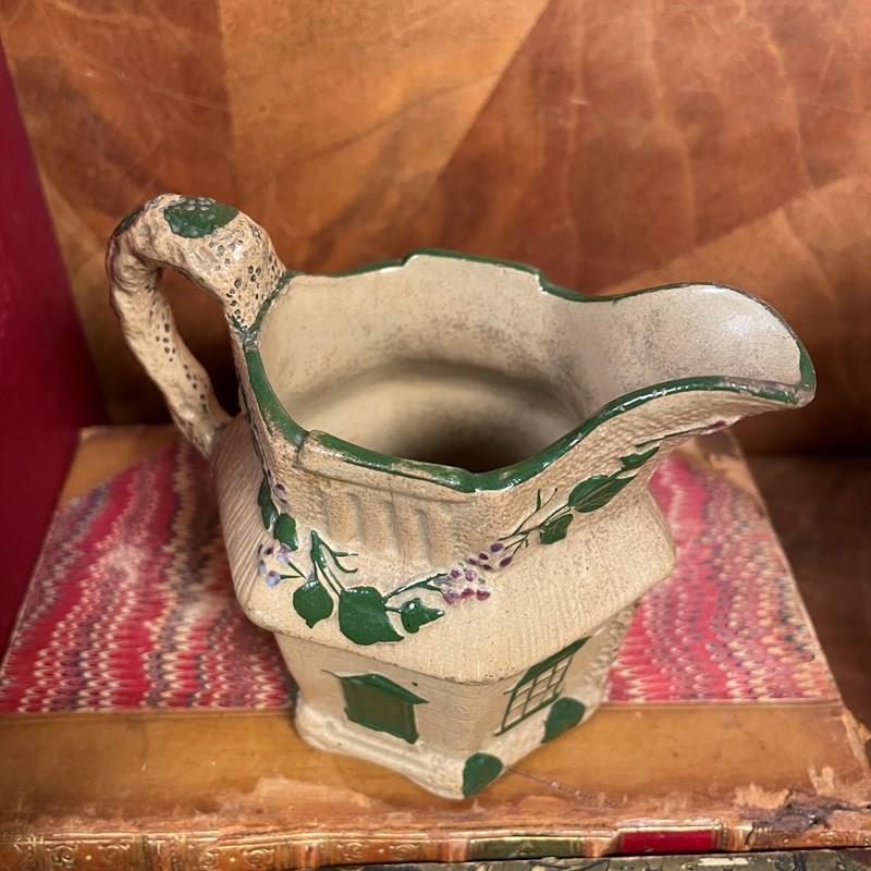 A sweet little Staffordshire jug in the shape of a house, with ivy around and a twisted branch handle.