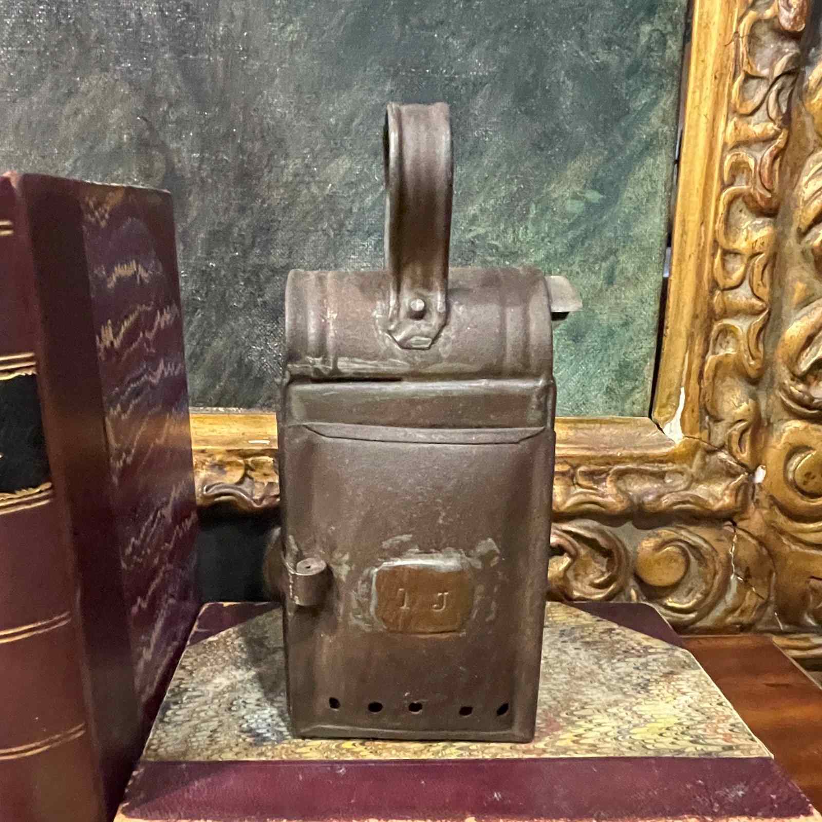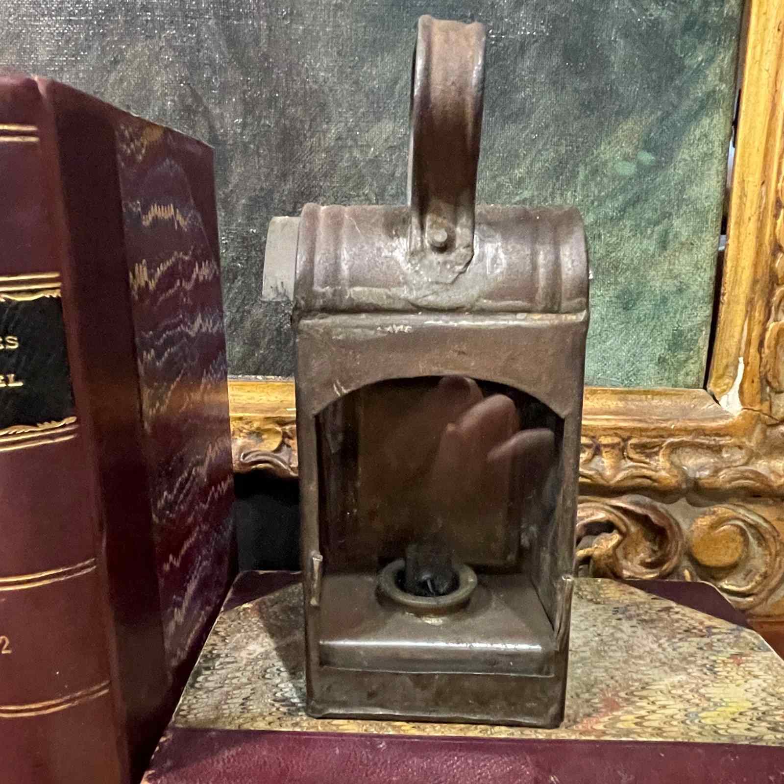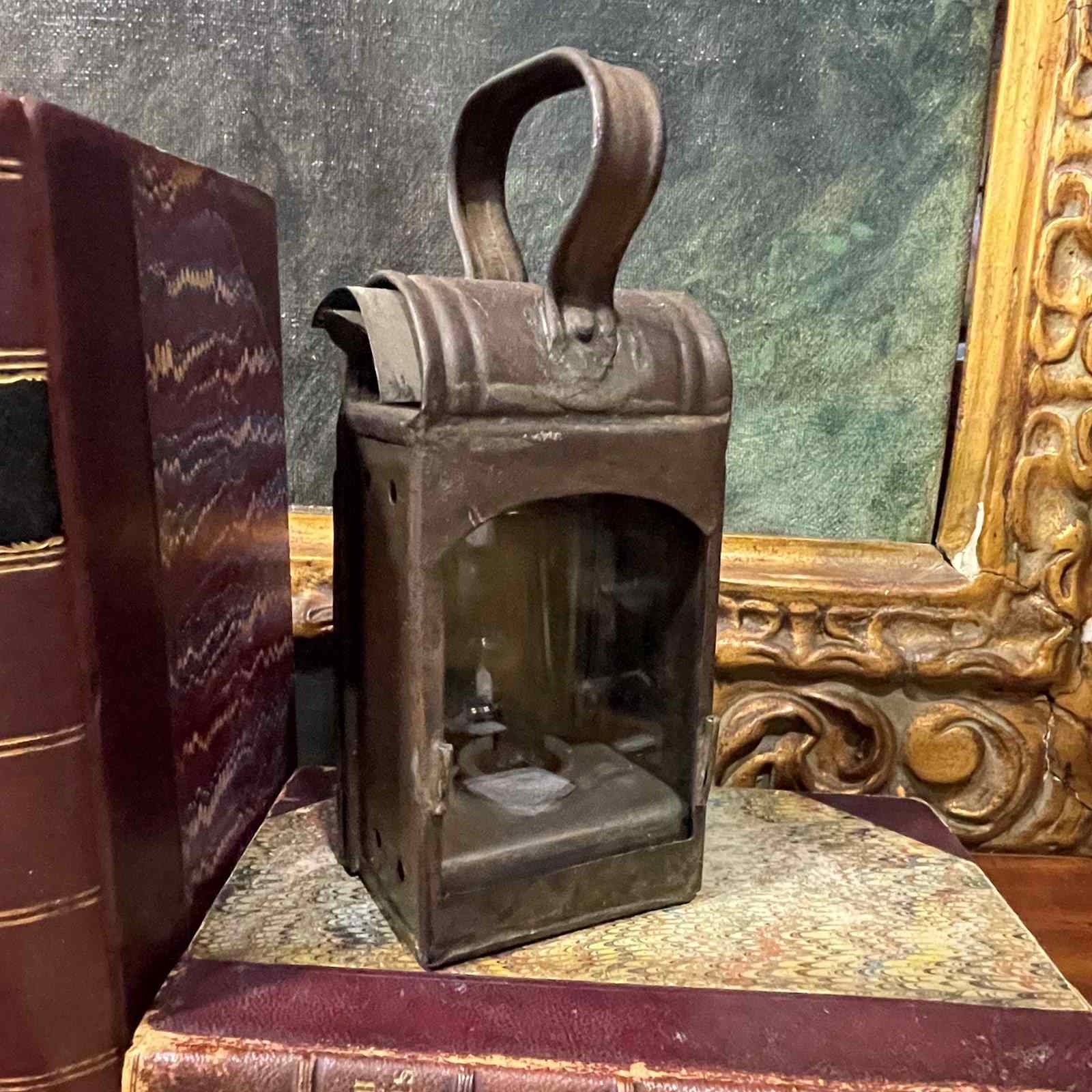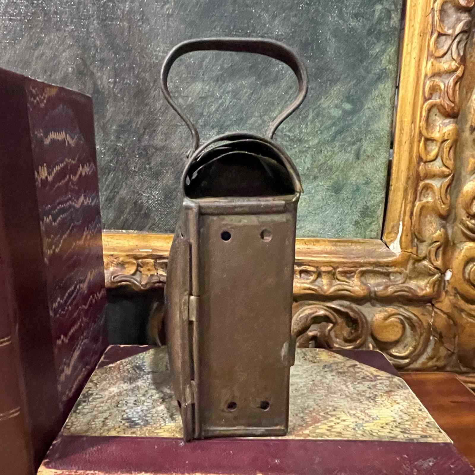 A small hand held early Victorian lantern with carrying handle and a side opening door.