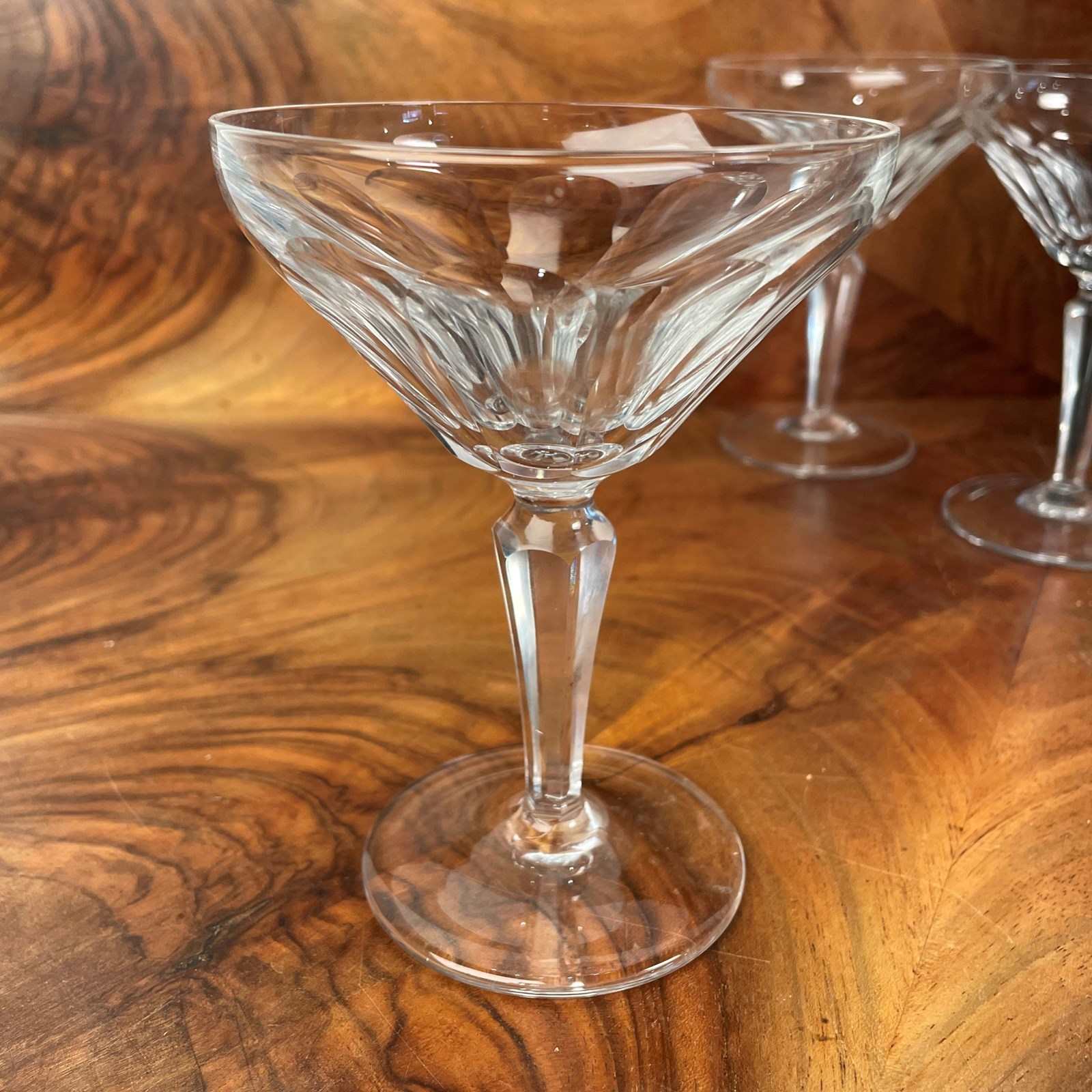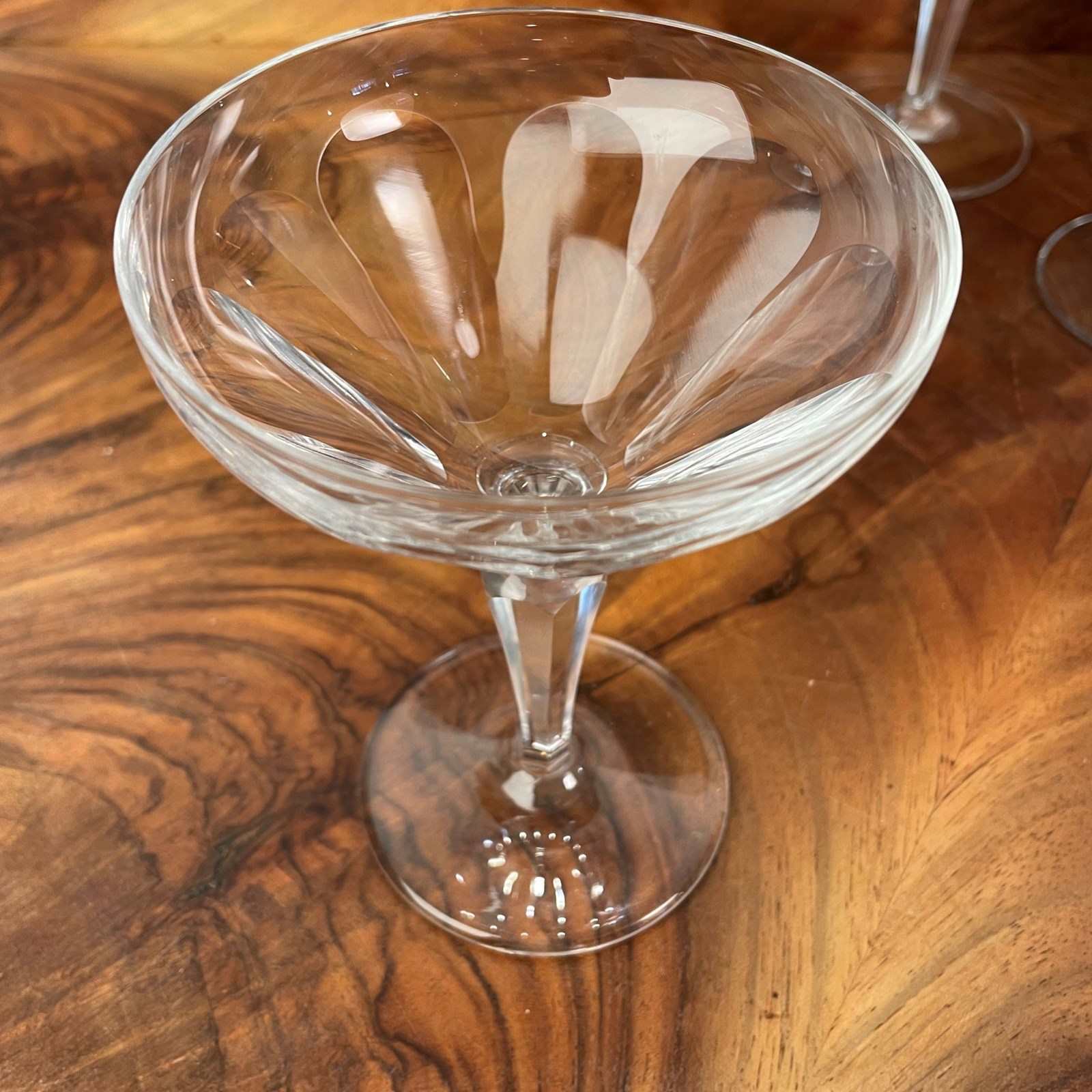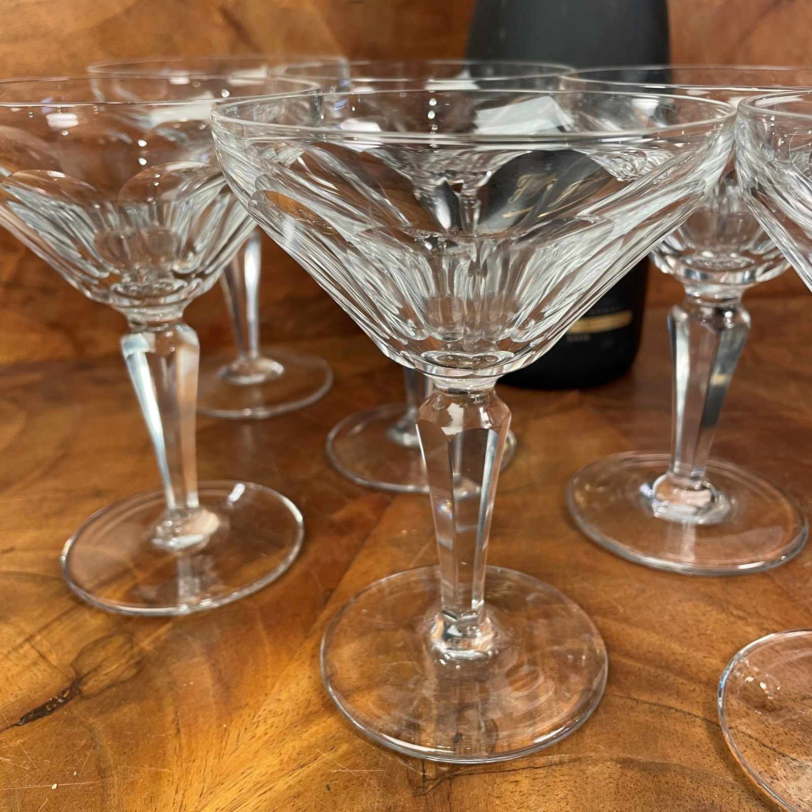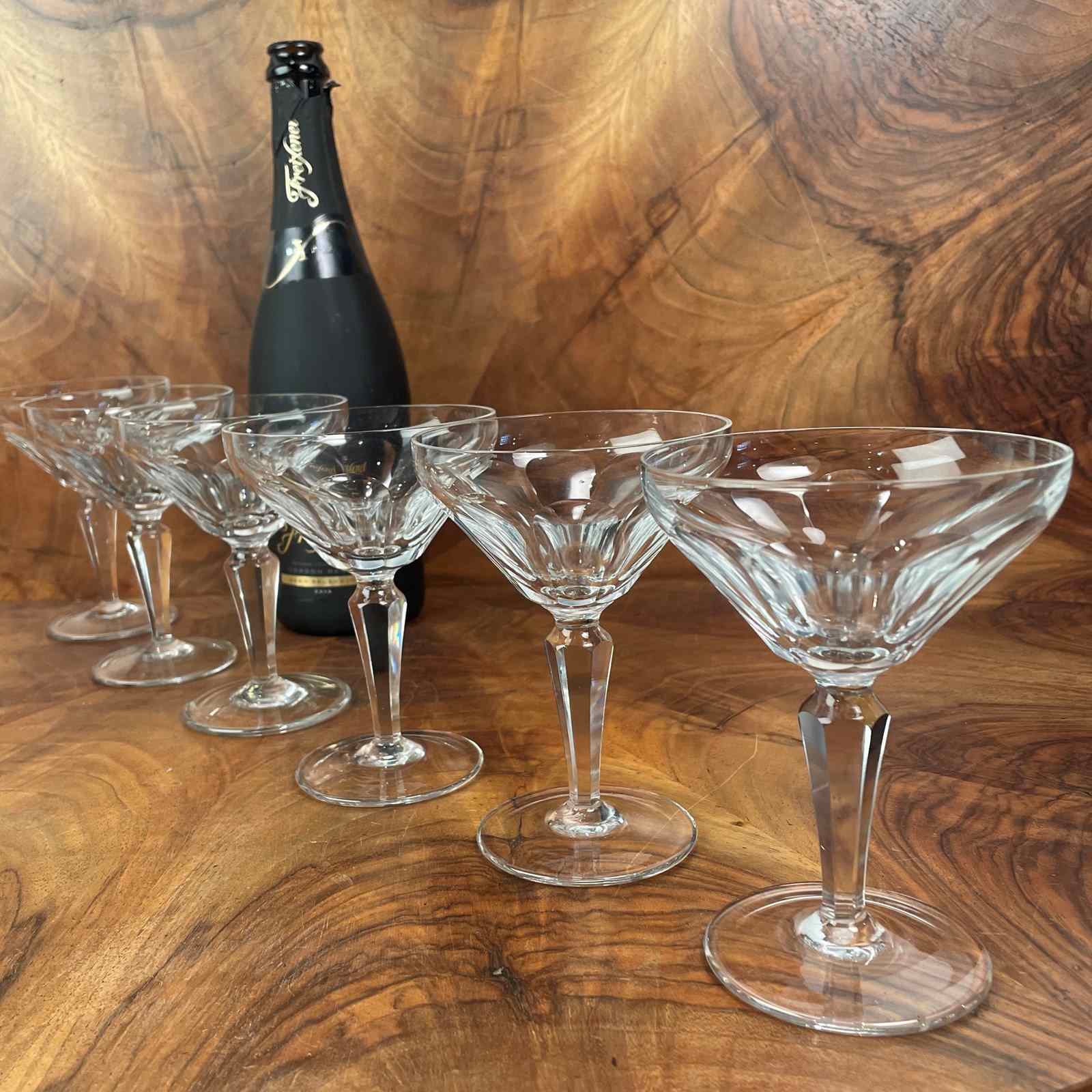 Elegant cut glass Val St Lambert champagne coupes with faceted, tapered stems.