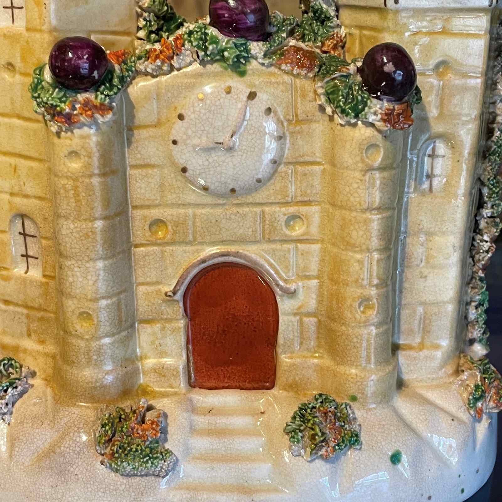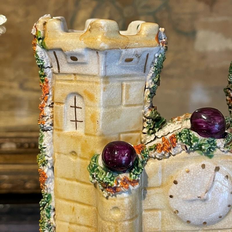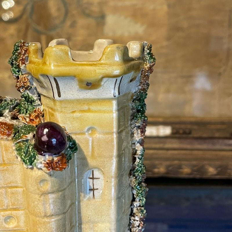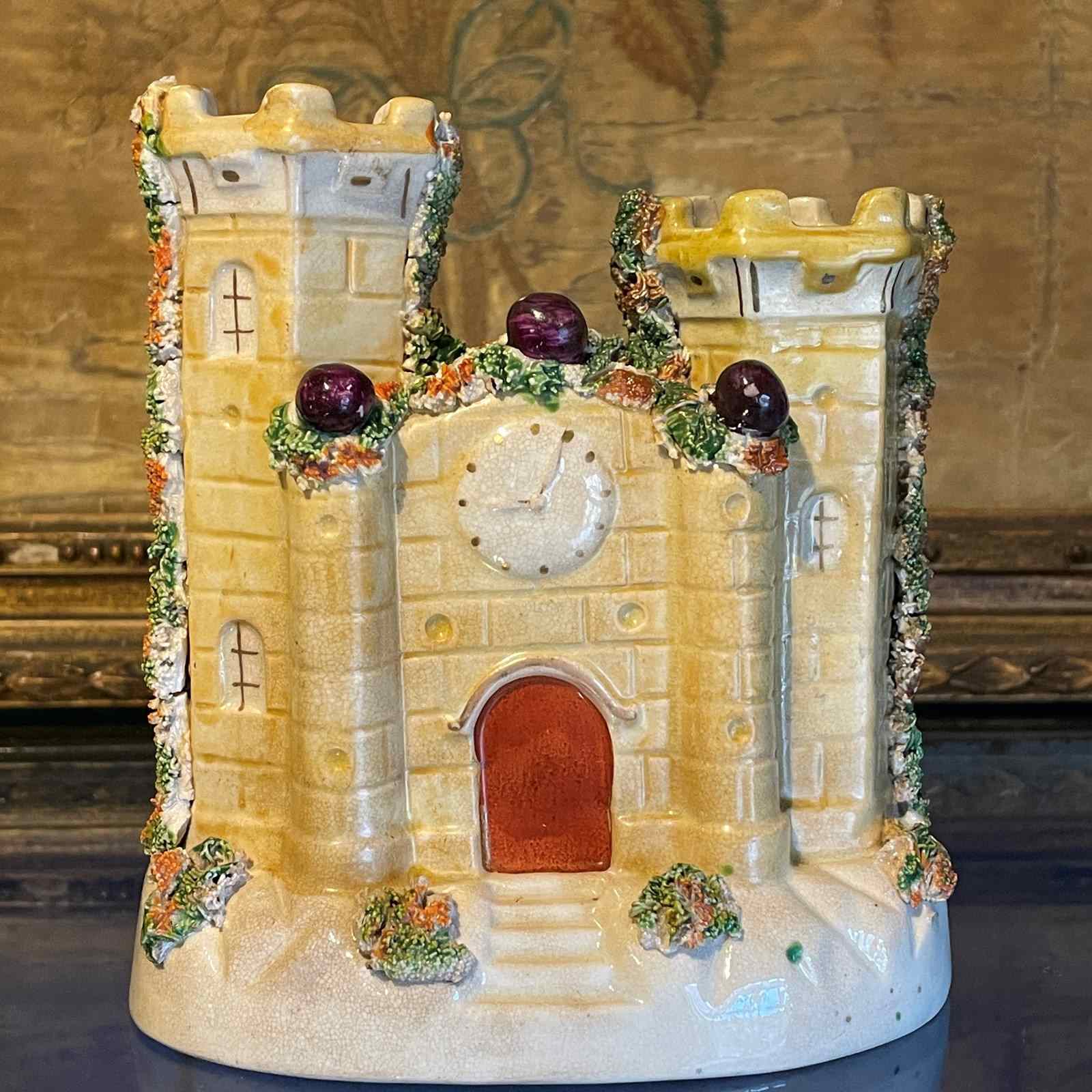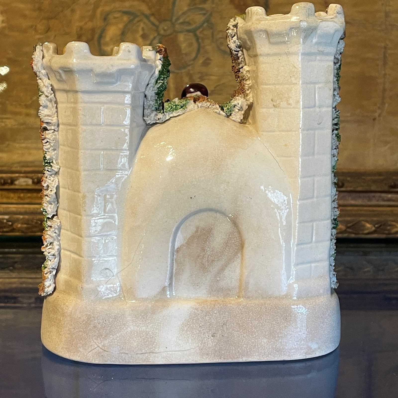 A charmimg staffordshire spill holder in the shape of a castle with two turrets,