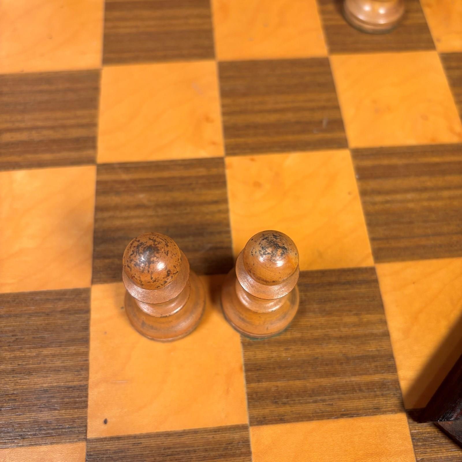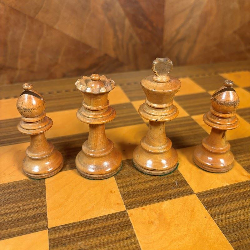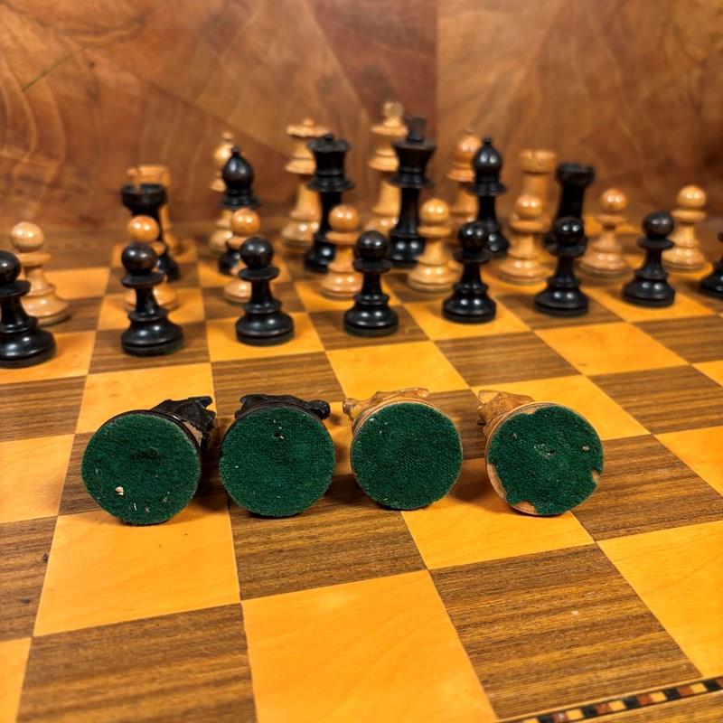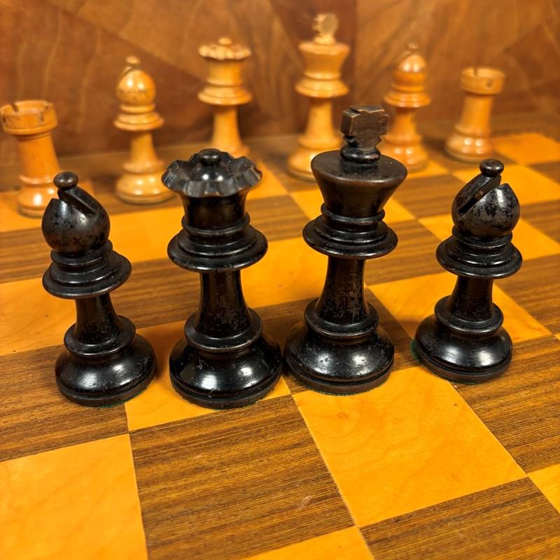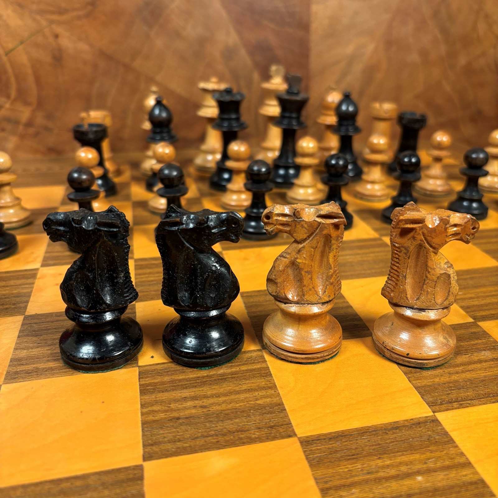 Weighted boxwood and ebony Staunton pattern chess set with box.