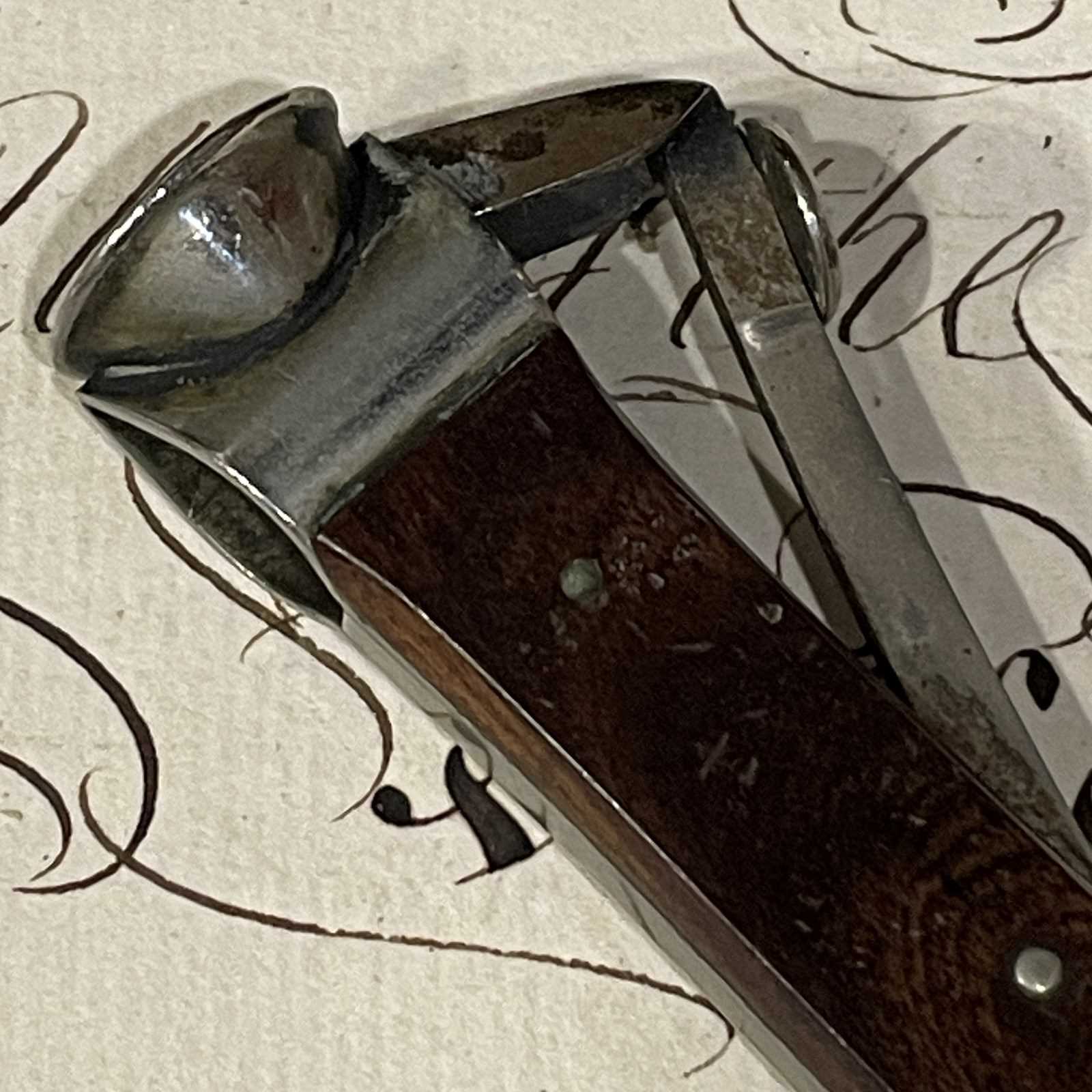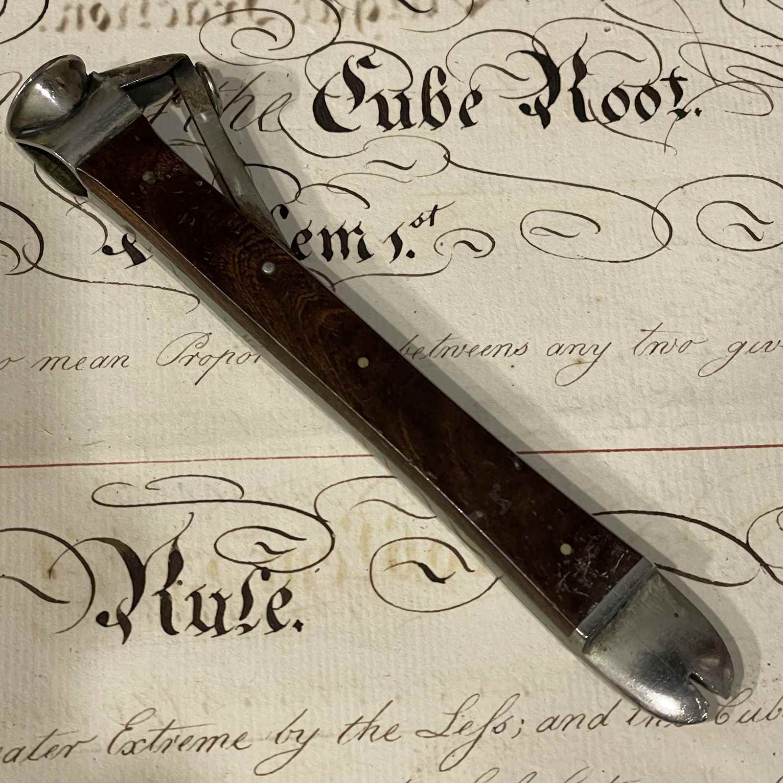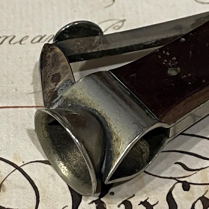 A smart silver plated and mahogany cigar cutter with a mahogany handle.