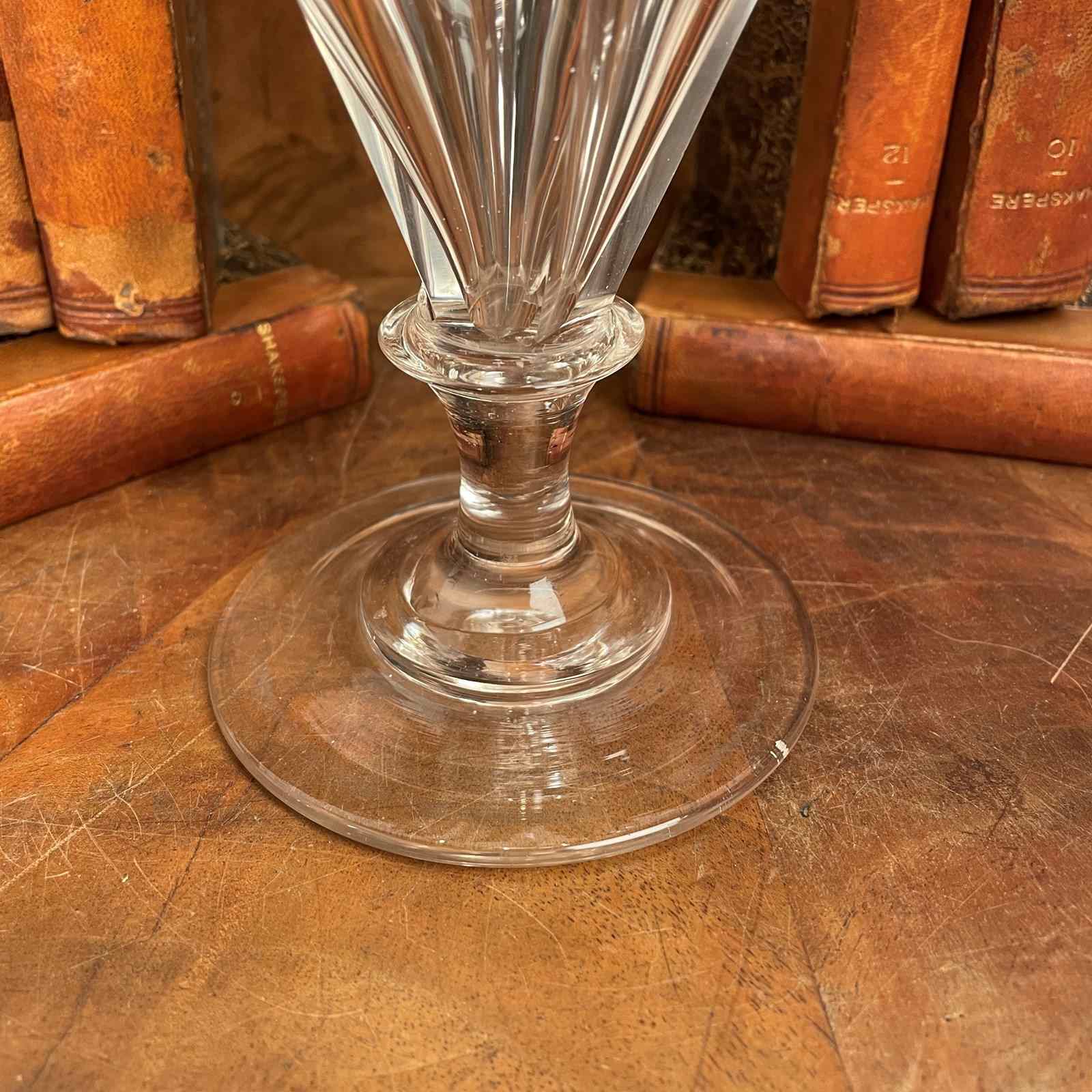 A fabulous large trumpet shaped Rummer., with panel cutting to the bowl on a short stem with flattened knop . the large foot has a pontil mark to the underside.