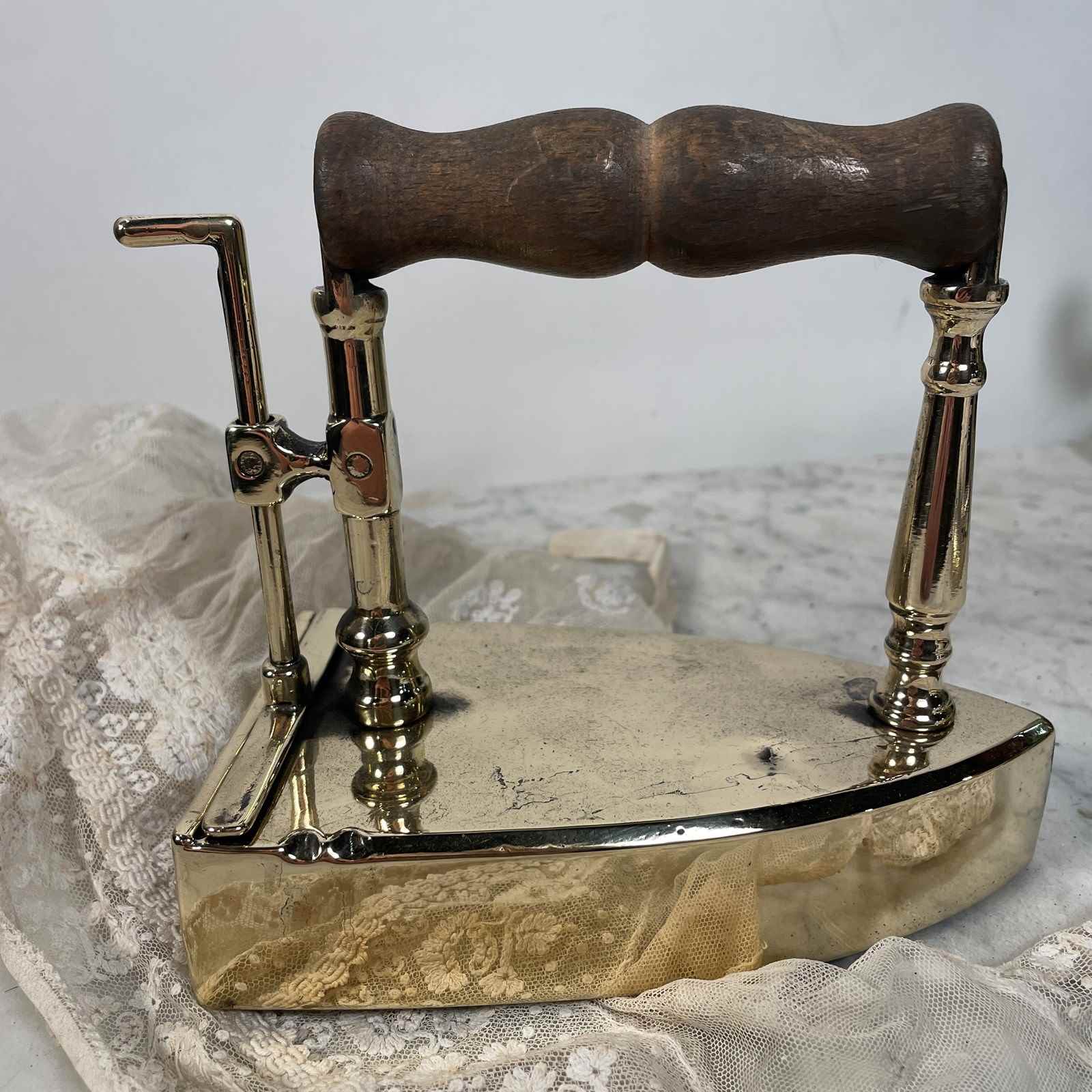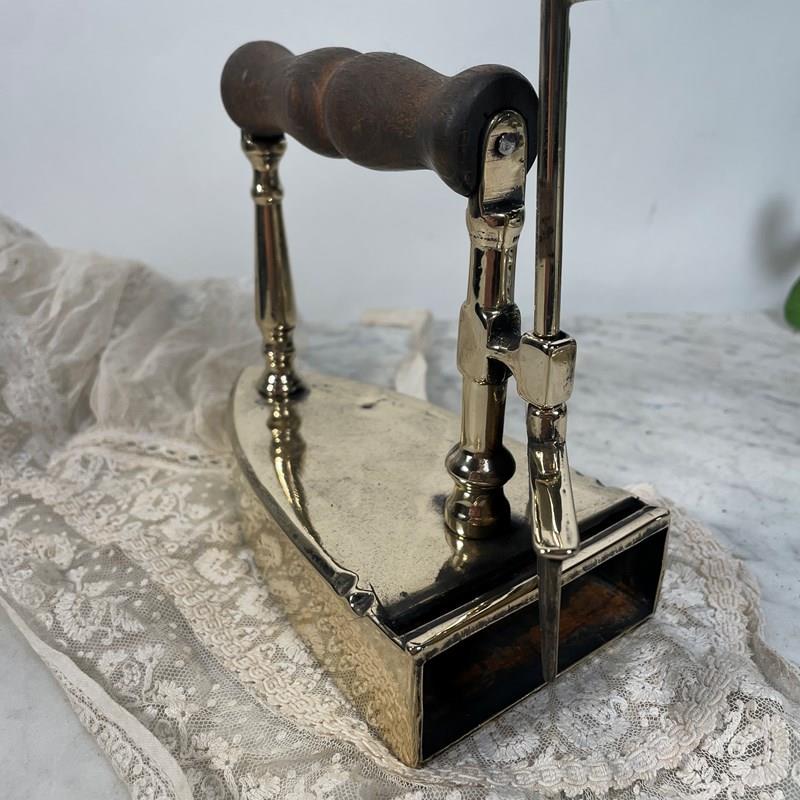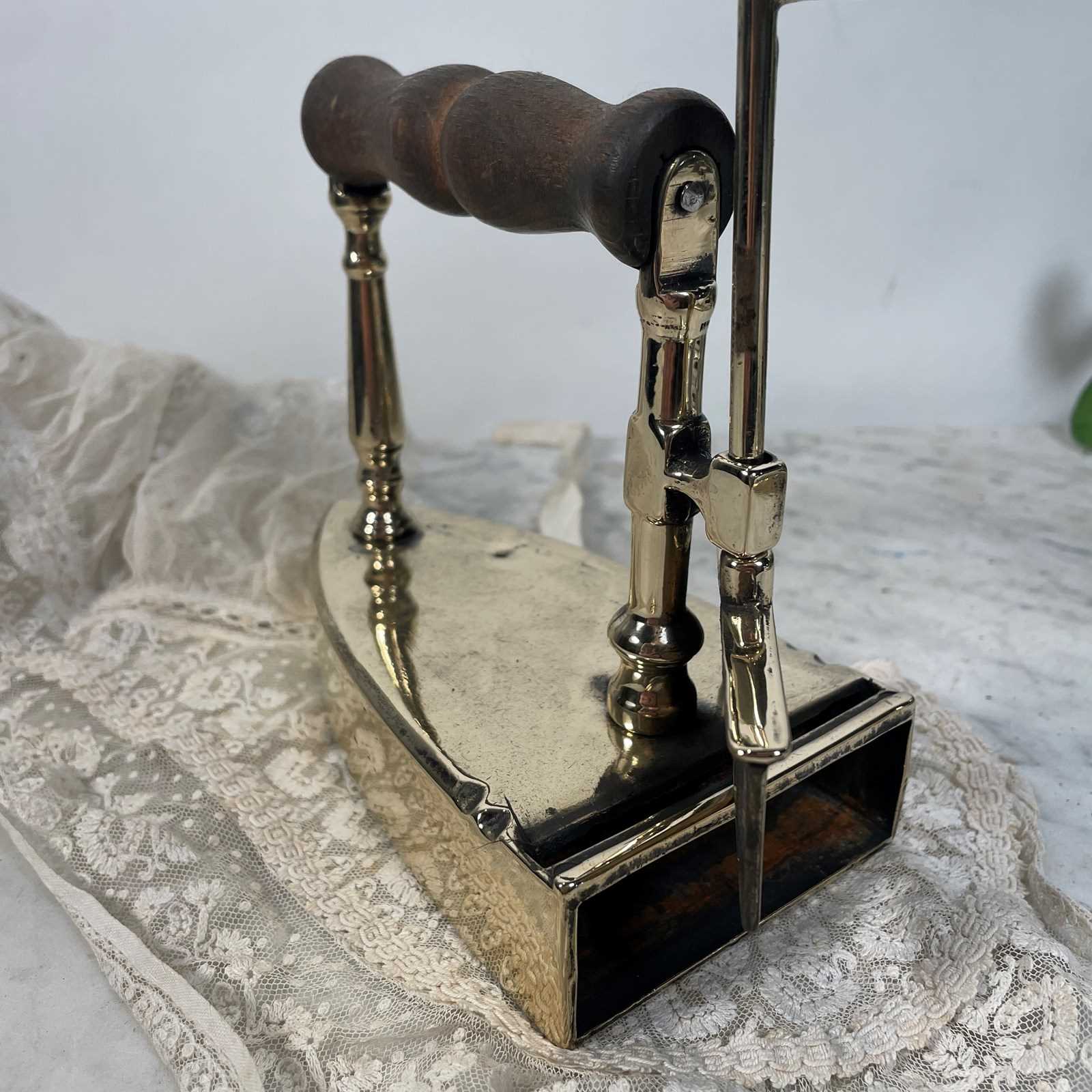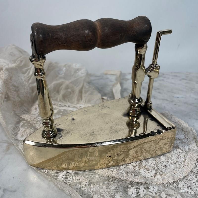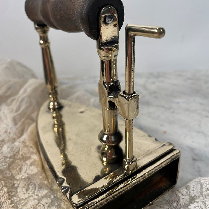 An unusual Victorian iron made from heavy cast  brass with original wooden handle. The back of the iron has a lever,  which when lifted reveals a cast iron plug, the purpose of which was to remove it from the brass casing and heat the plug on the fire, when it was hot enough it would be lifted from the fire and placed back inside the iron, thus enabling you to use the iron with out burning the cloth.