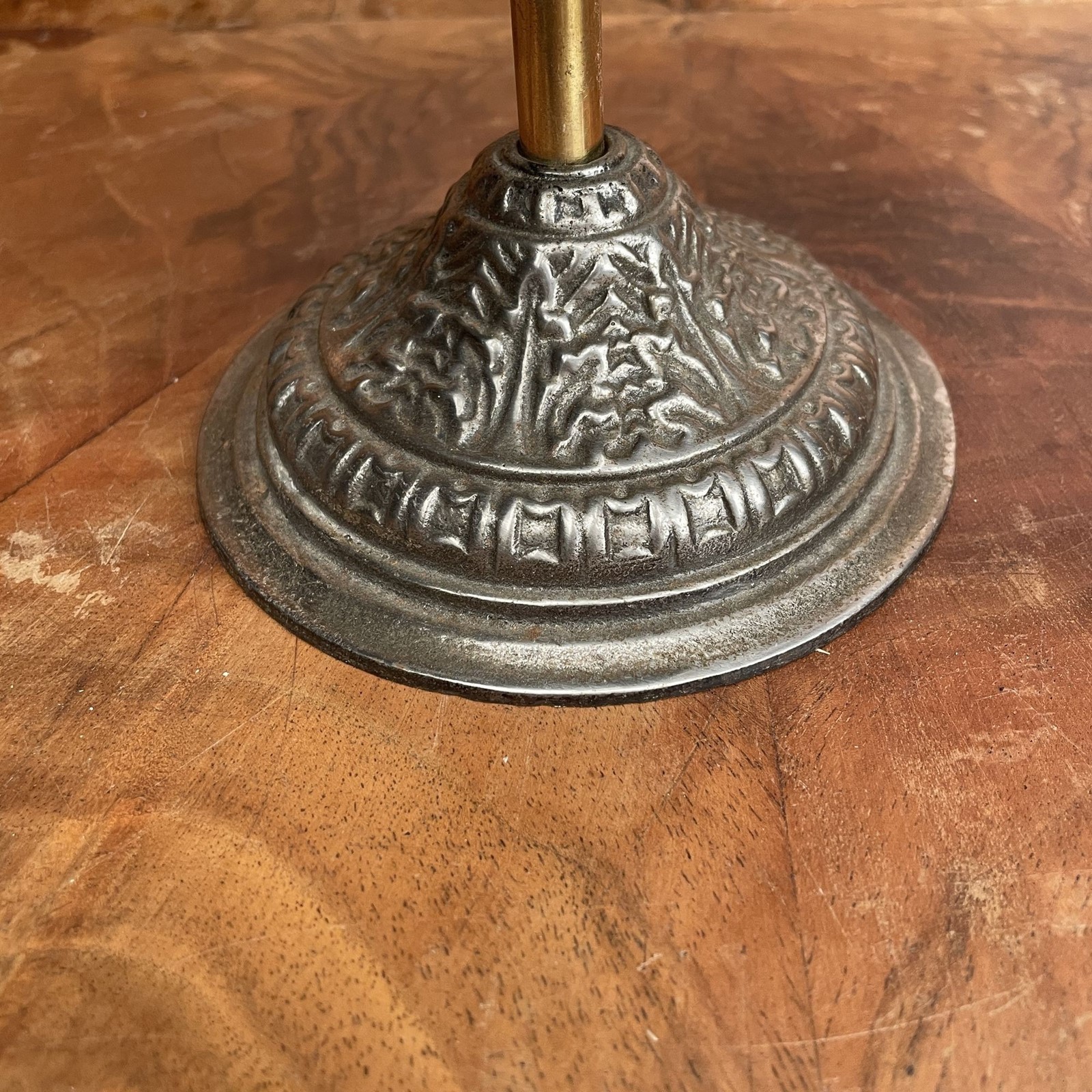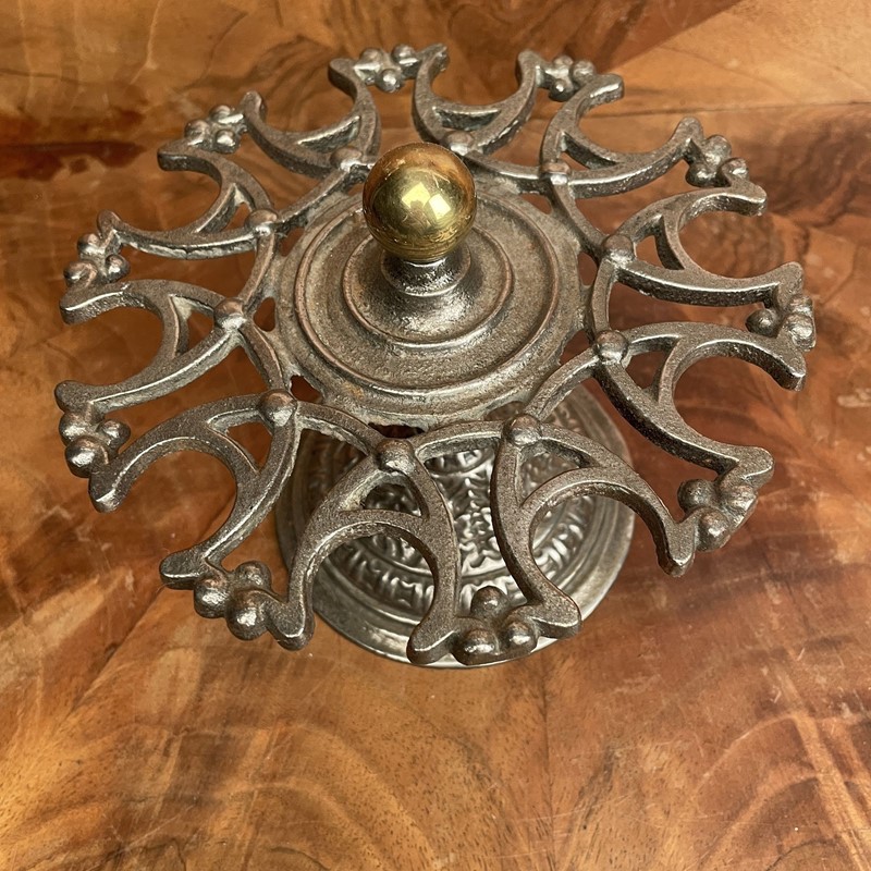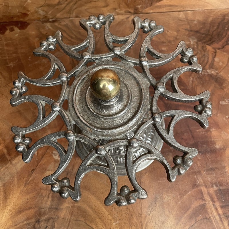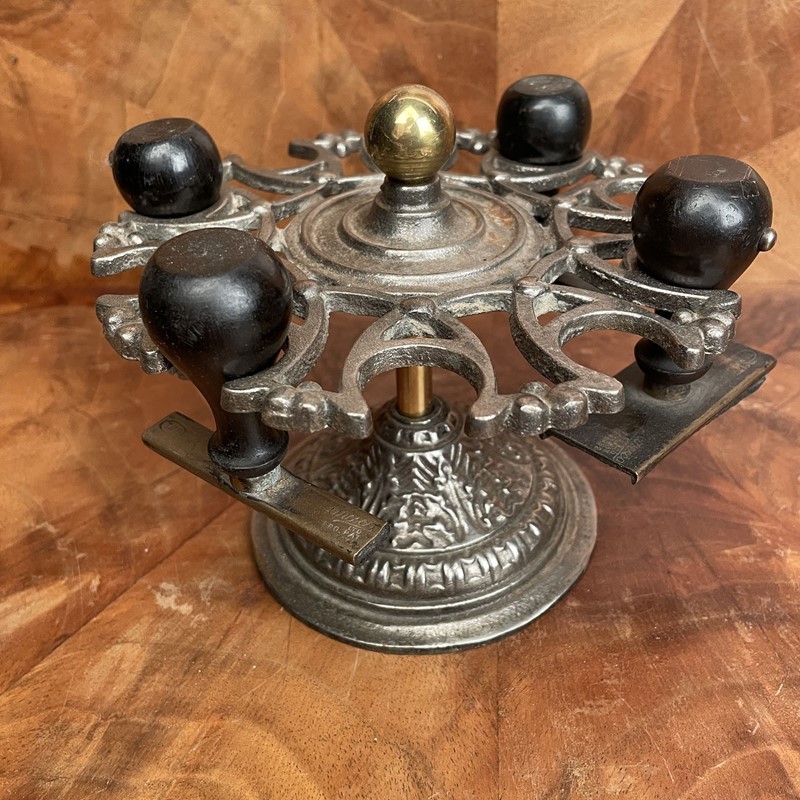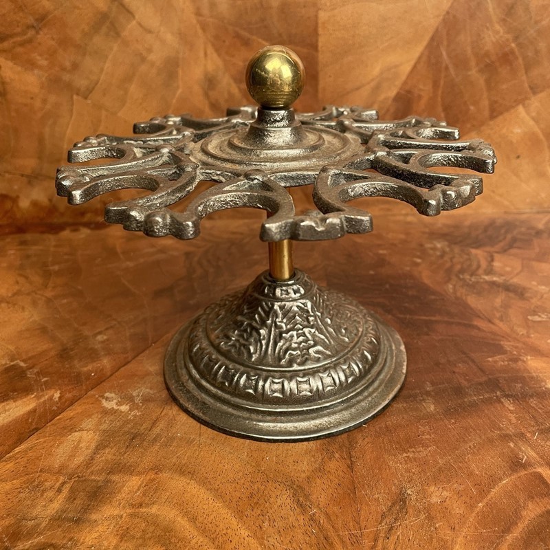 This style of stamp holder would have been part of every commerial desk. This is a Victorian company stamp holder made from polished cast iron with a brass ball handle. It holds 10 desk stamps the top section revolves for ease of access. In very good condition. Measuring: 14cm high x 18cm in diameter