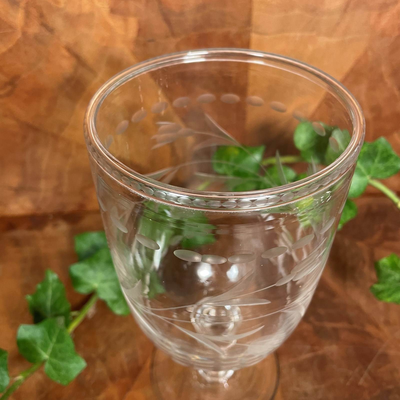 A glass vase wheel engraved with a floral design, and a folded rim. This style of vase was originally intended to hold celery for the tea table, but today make a perfect flower vase.