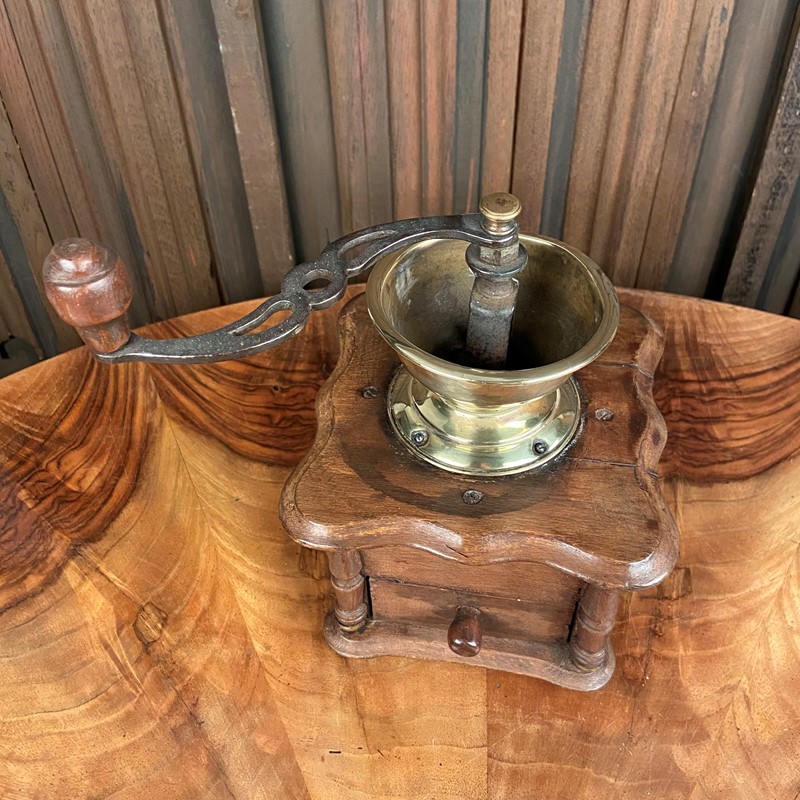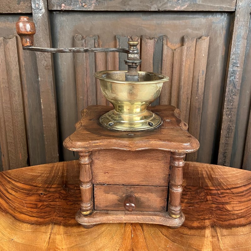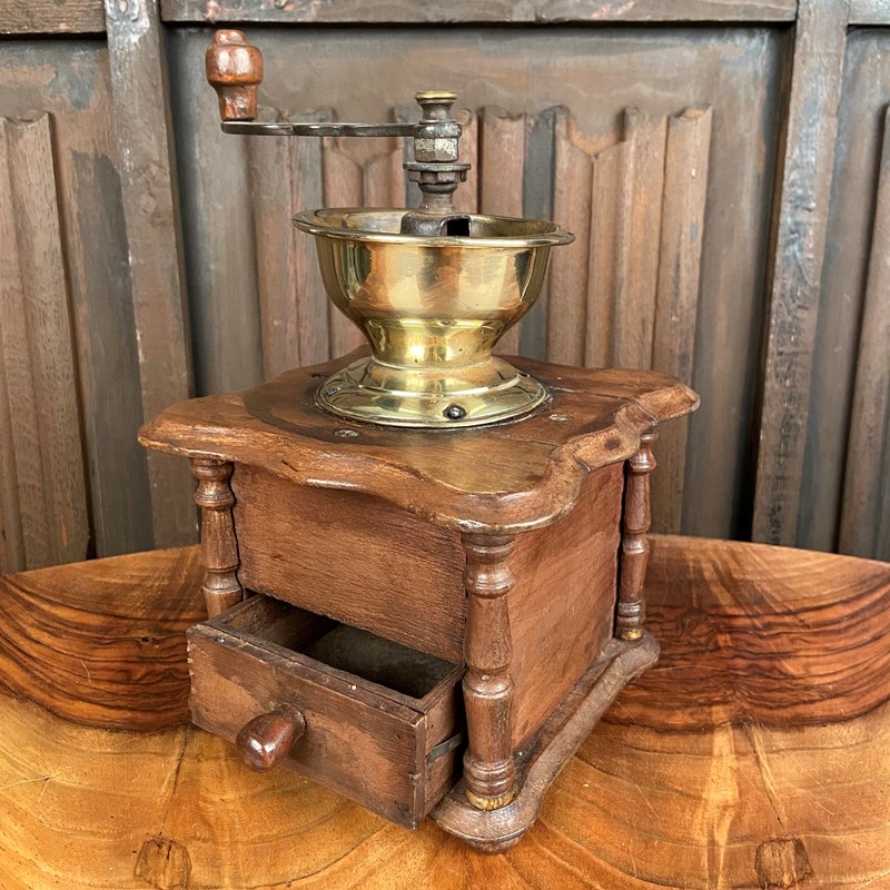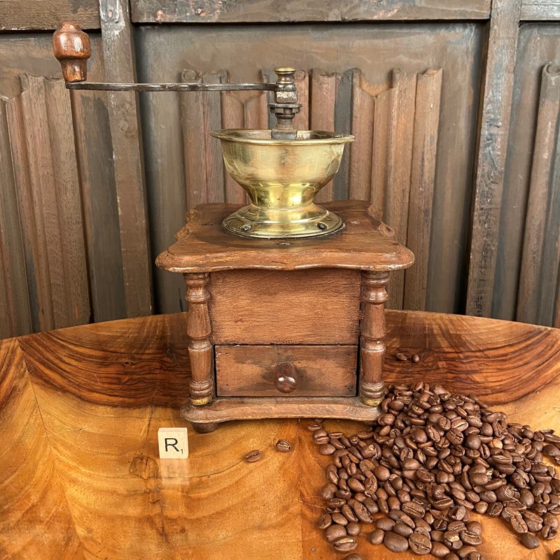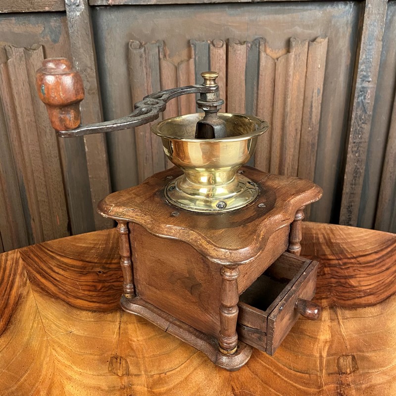 This grinder is made from oak with a steel mechanism and a wooden finial to the end of the handle. It has a sliding lid for the beans to be deposited inside. The handle would then be turned - the coffee ground - which would drop into the drawer below. The mechanical aspect works perfectly - the outer case is in reasonable condition. Measuring 25cm high x 15cm square.