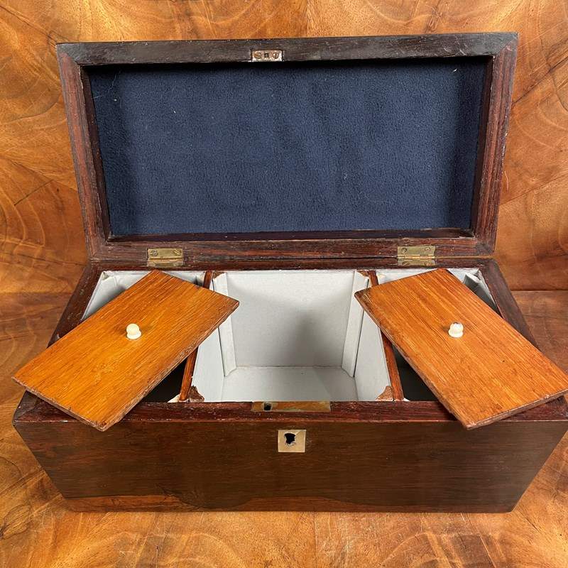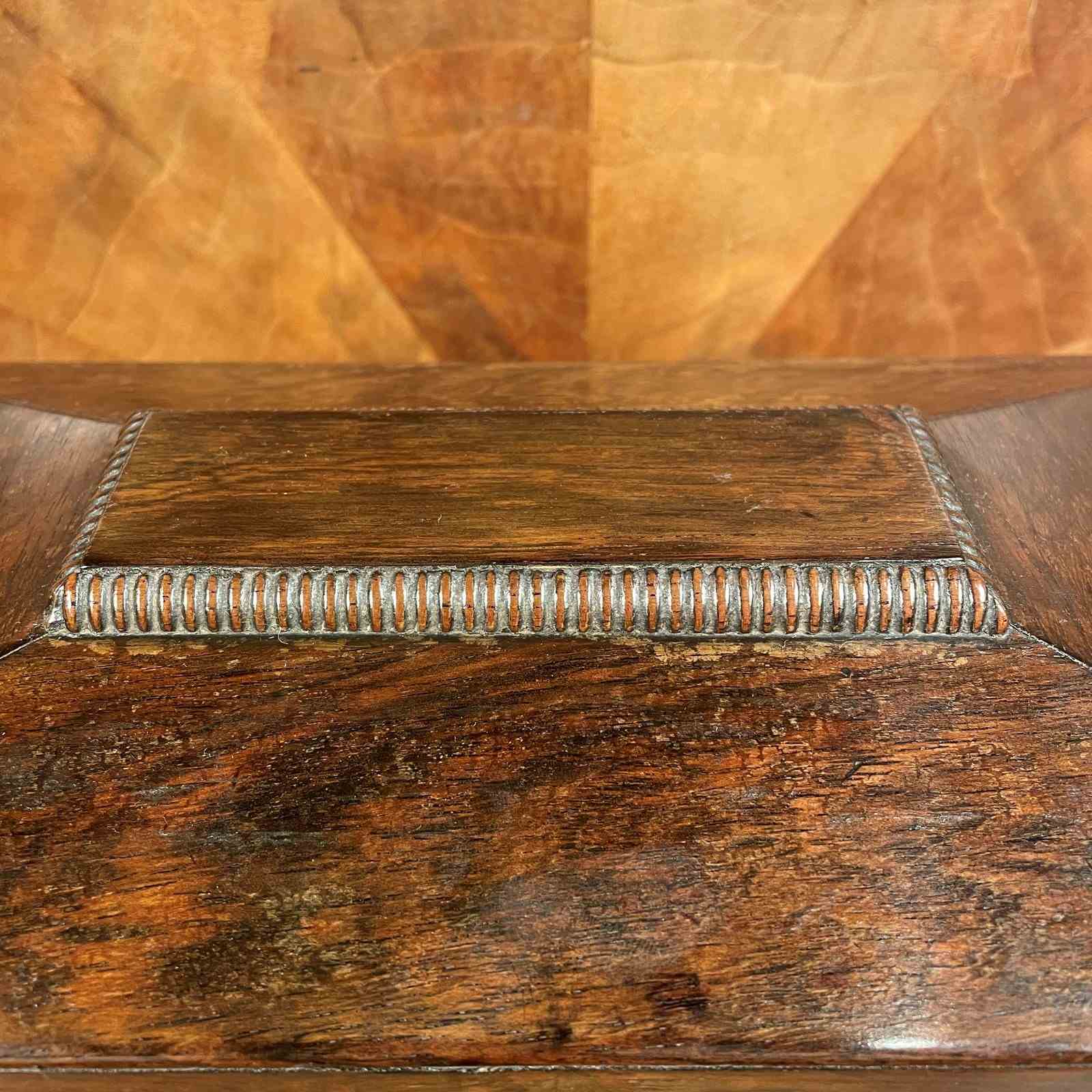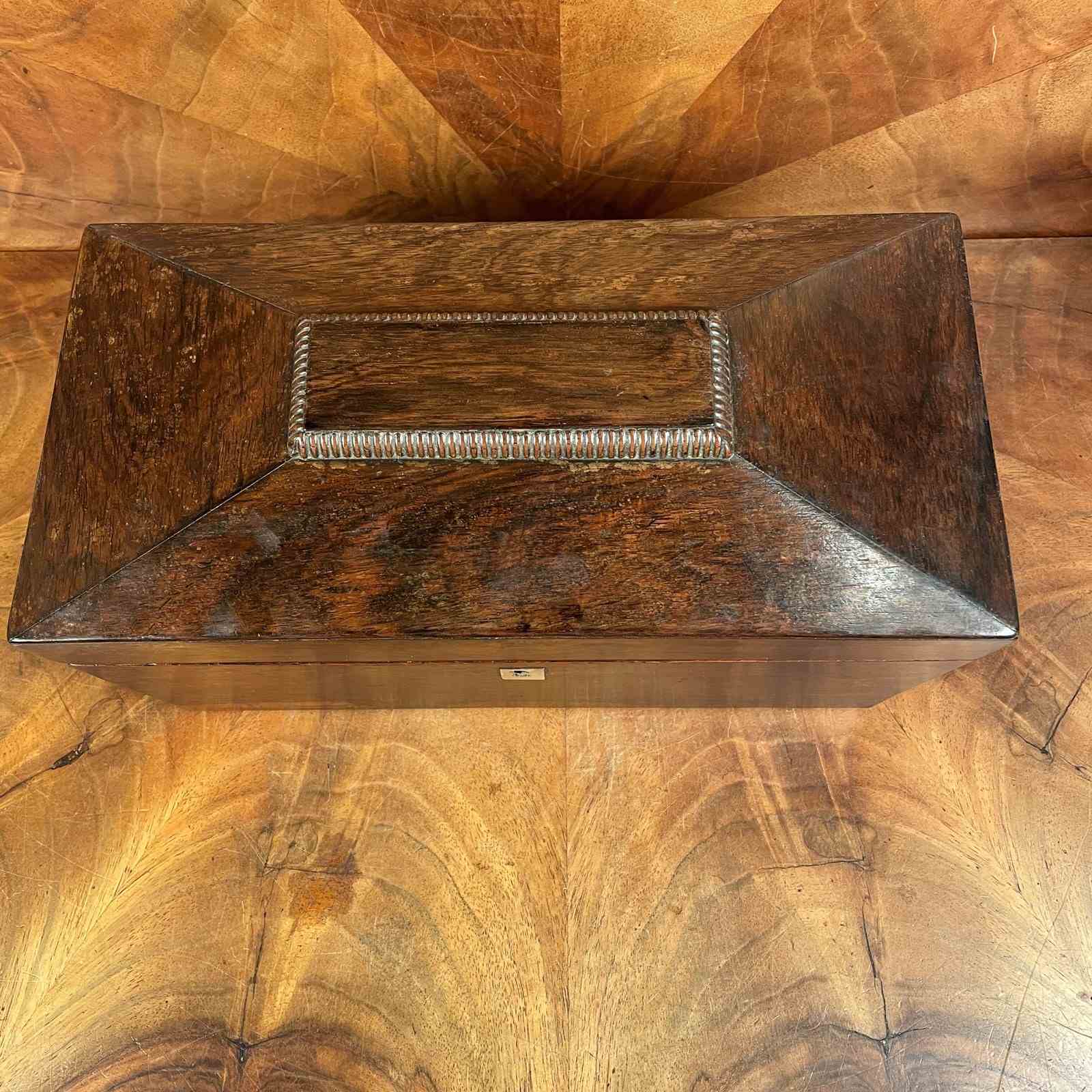 A mahogany sarcophagus shaped tea caddy, with to internal compartments for tea and a space where a mixing bowl would have been.