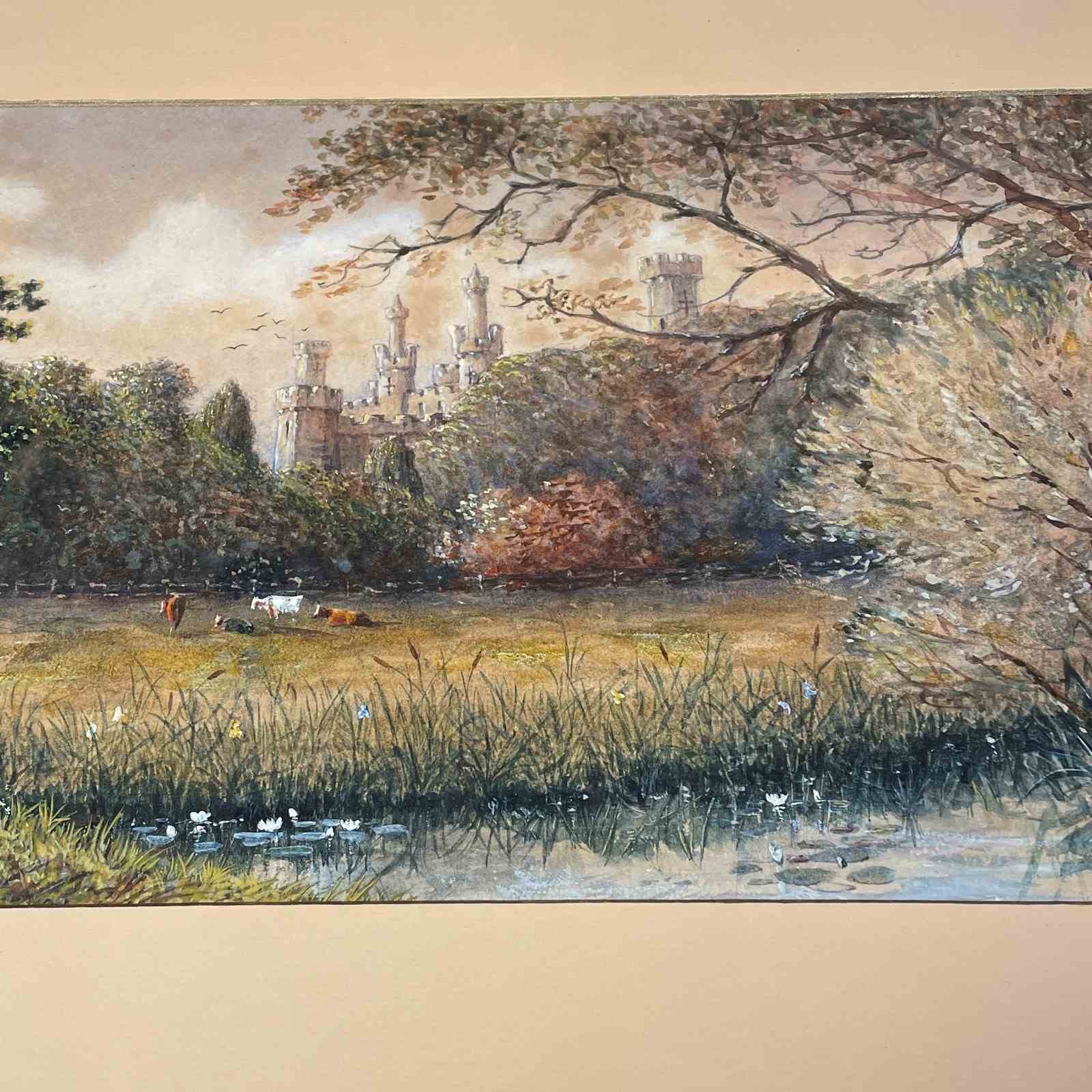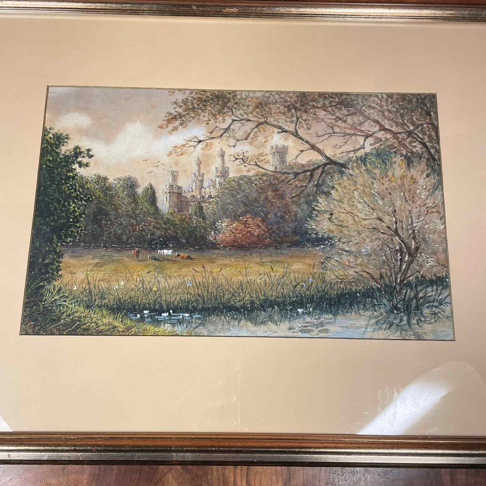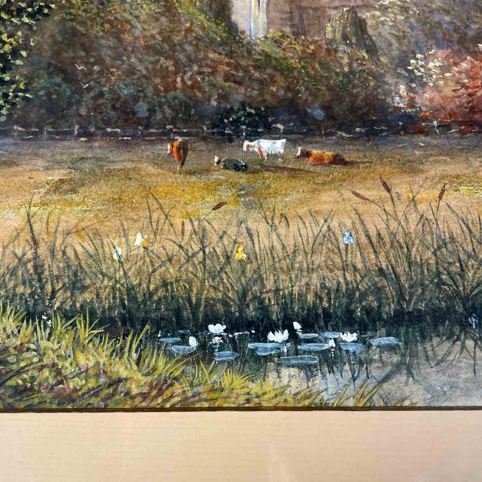 A pretty watercolour of a rural scene of Thomas Town Castle county Tipperary with cows in the foreground with lily pond reframed in gilt frame marked on the back " Thomas town Castle 1896 by CFM Swynnerton "