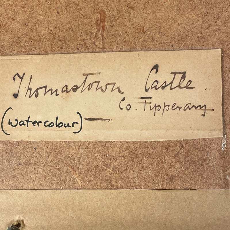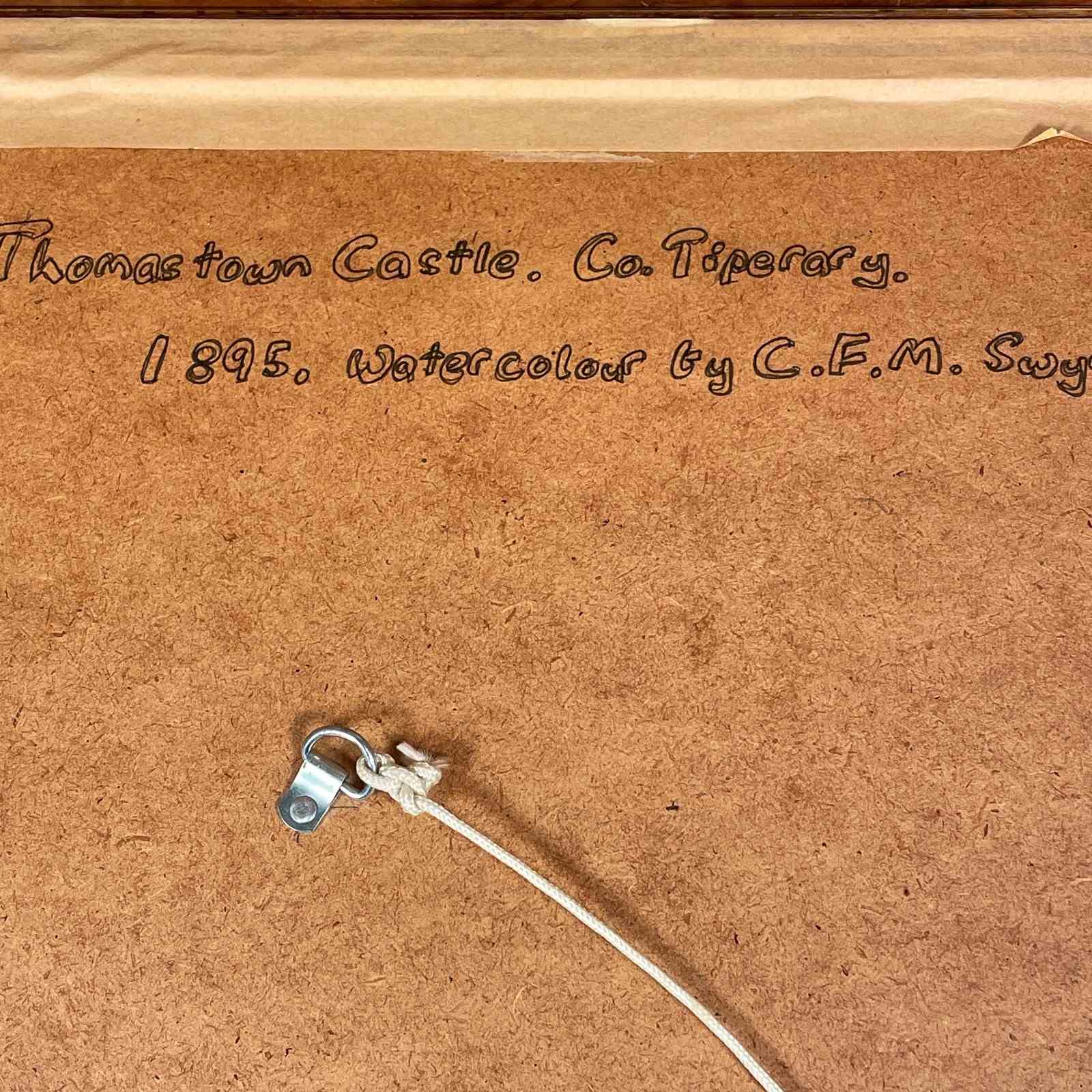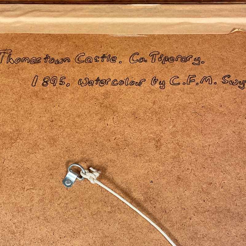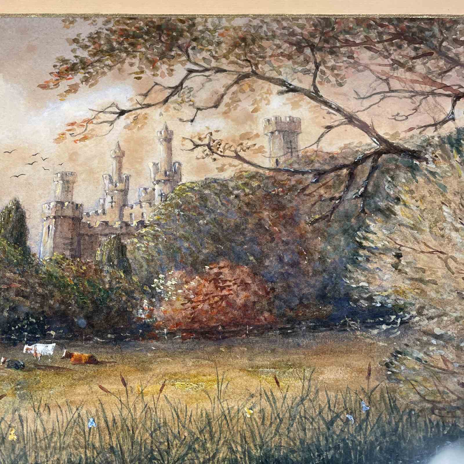 A pretty watercolour of a rural scene of Thomas Town Castle county Tipperary with cows in the foreground with lily pond reframed in gilt frame marked on the back " Thomas town Castle 1896 by CFM Swynnerton "