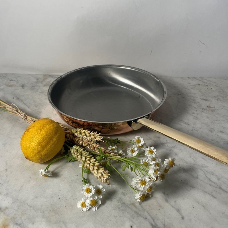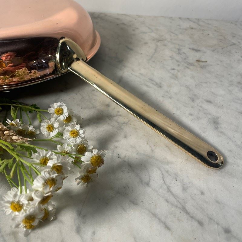 Copper crepe skillet with brass handle.