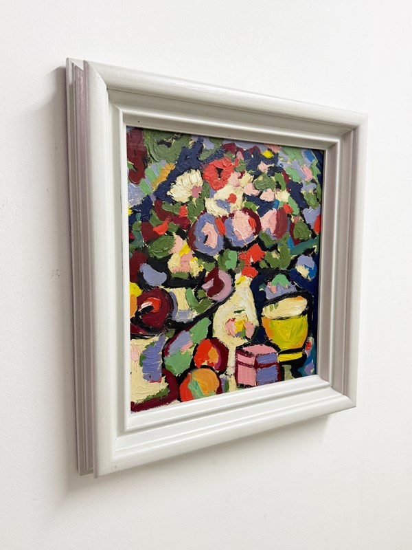 Large abstract still life oil painting with bold impasto brushwork and vibrant colour. The composition suggests flowers and tableware, rendered in a lively modernist style with thick textured paint. Presented in a substantial white frame, ready to hang.