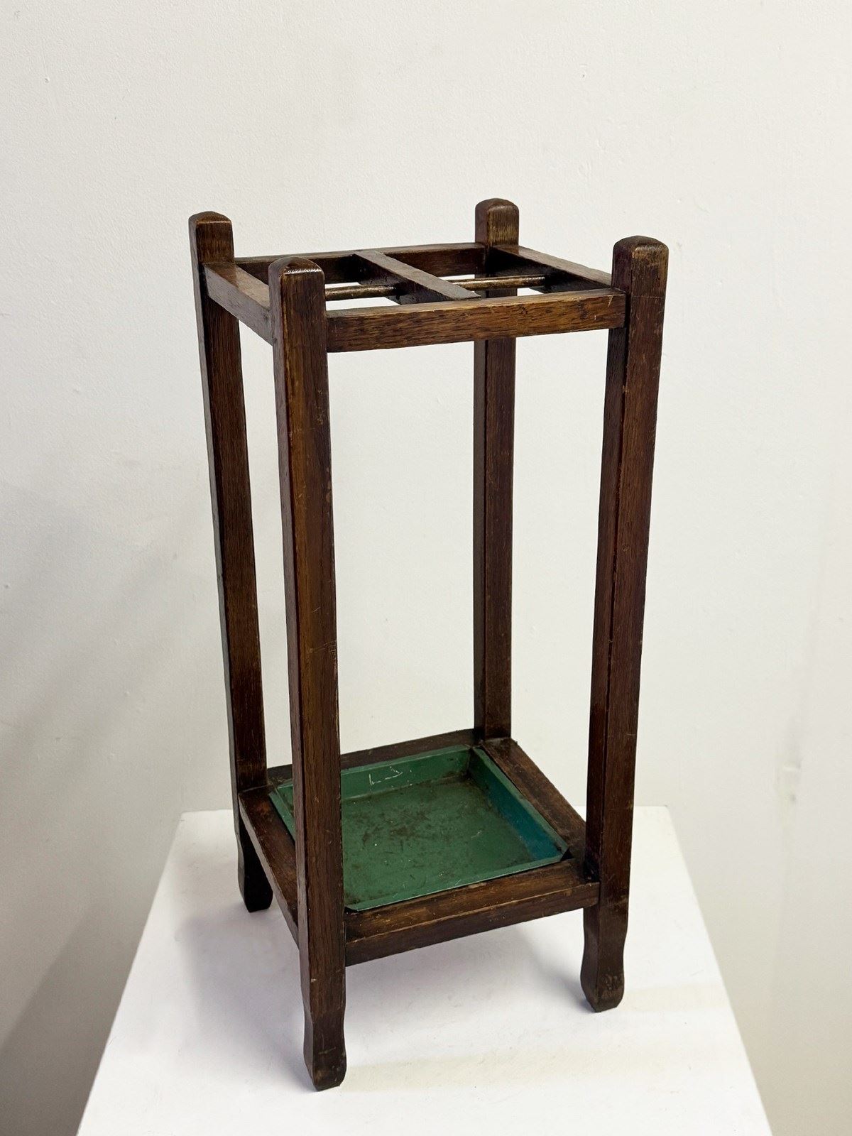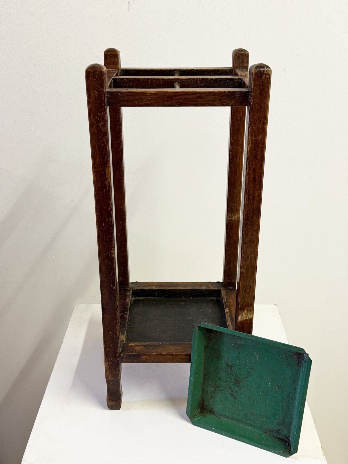 Add a touch of vintage charm to your entryway with this elegant early 20th century wooden umbrella stand. Crafted from solid oak, this piece features a classic open frame design with a crossbar top and a green metal drip tray at the base, perfect for catching water from umbrellas or walking sticks.