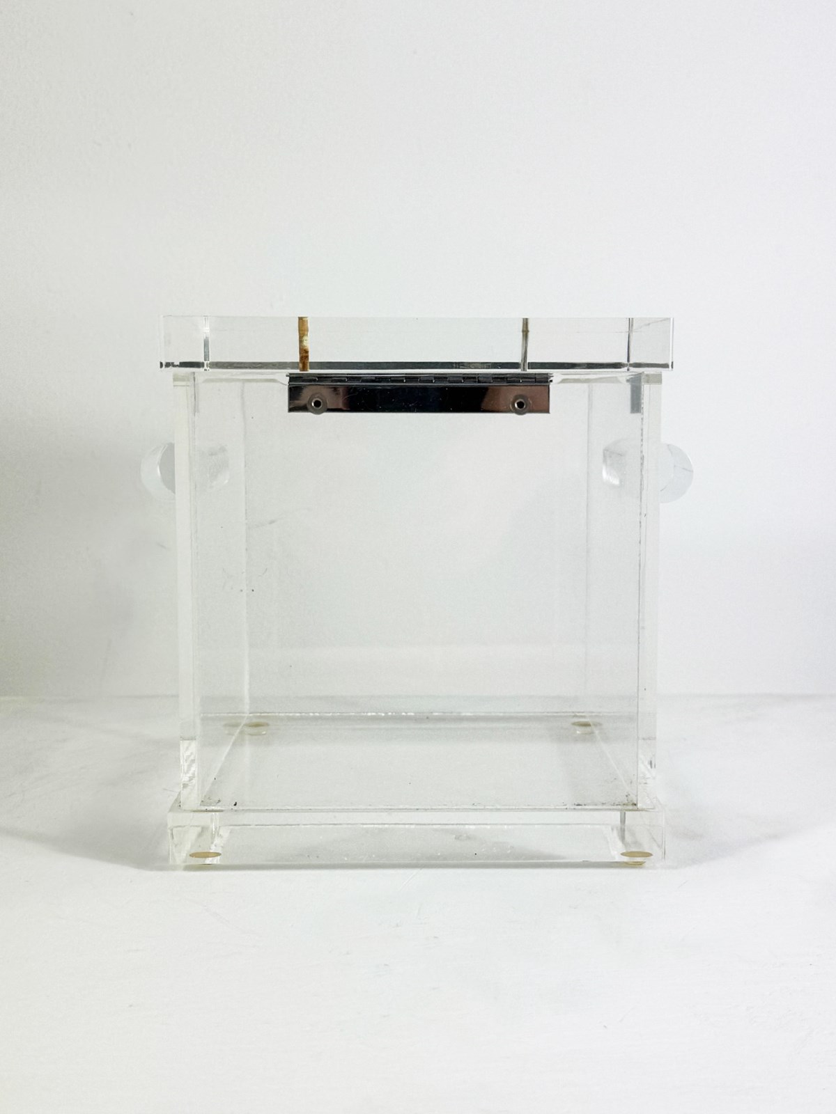 Elegant clear lucite cube box with chrome hinged lid and distinctive cylindrical side handles, a beautiful example of 1970's Italian modernist design, attributed to Alessandro Albrizzi.