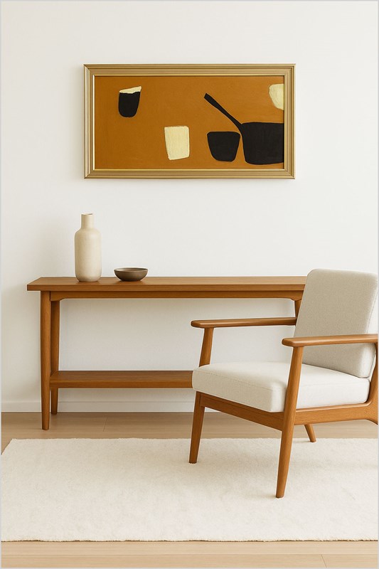 Painted in thick oil with visible brushwork and texture, this piece captures the essence of minimalism and quiet domesticity. It is framed in a clean, light-gold wooden frame that enhances its mid-century tone.